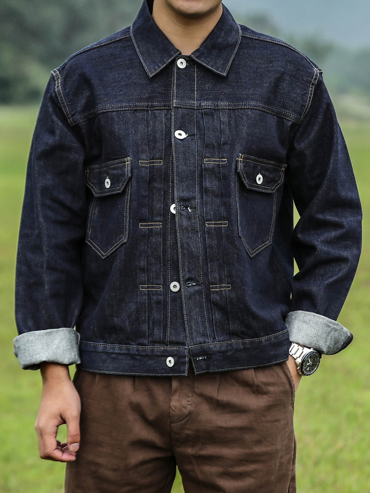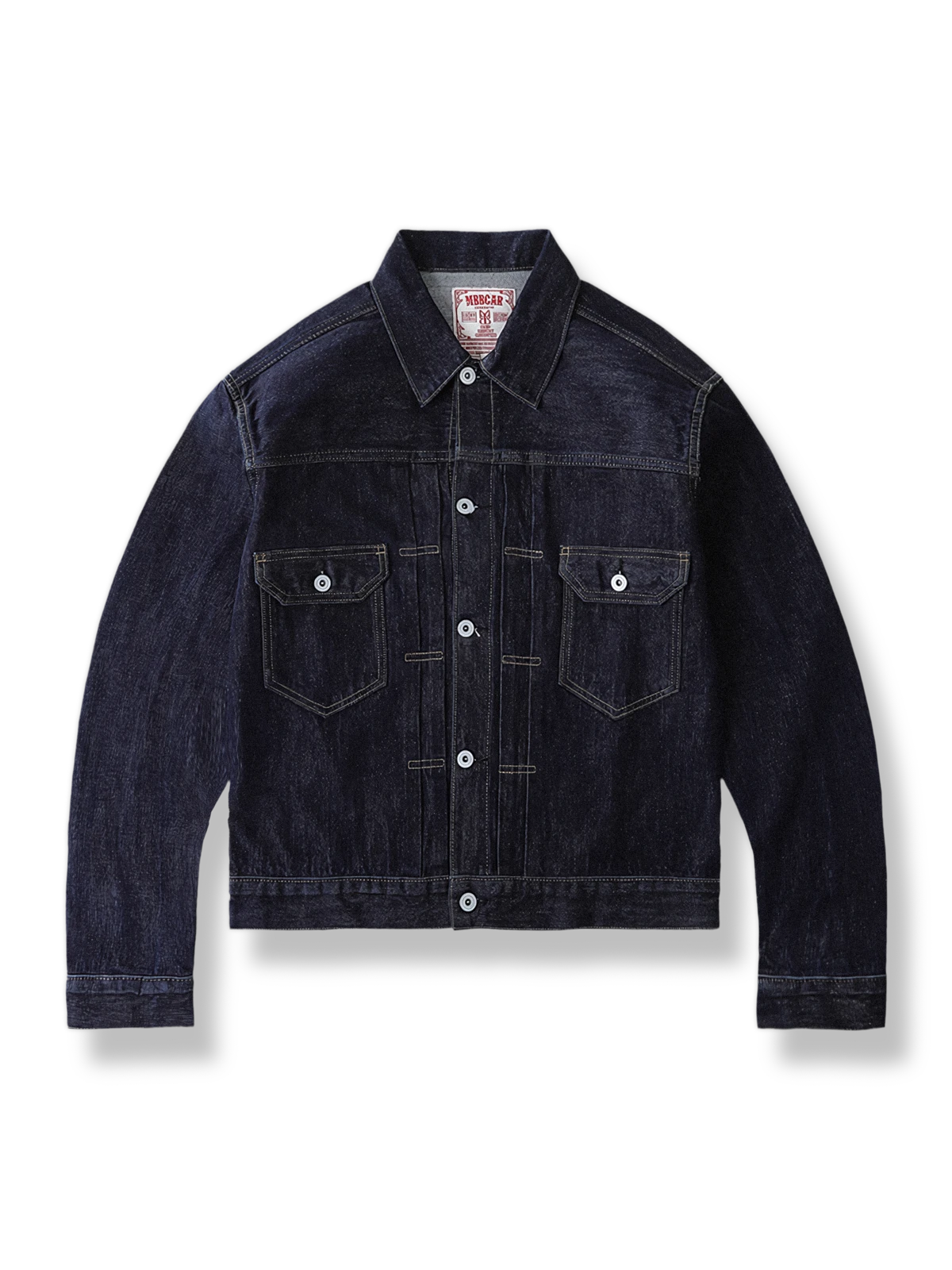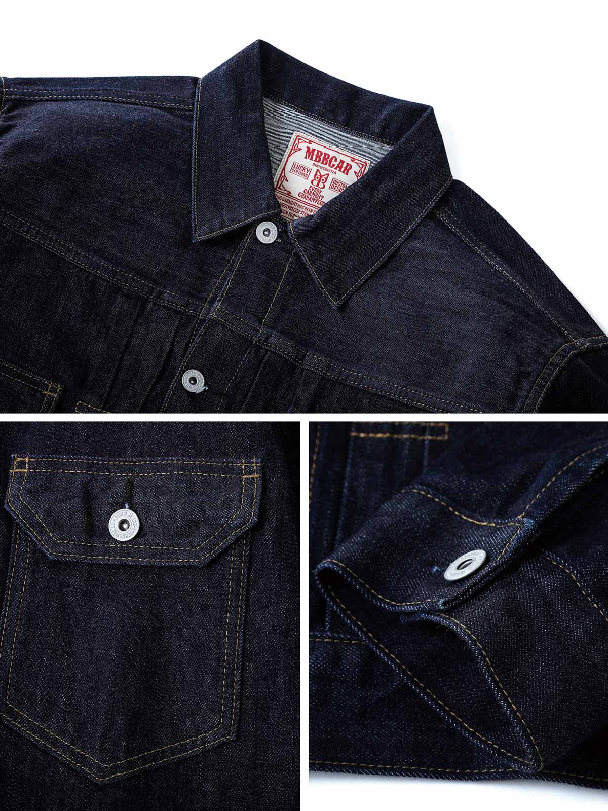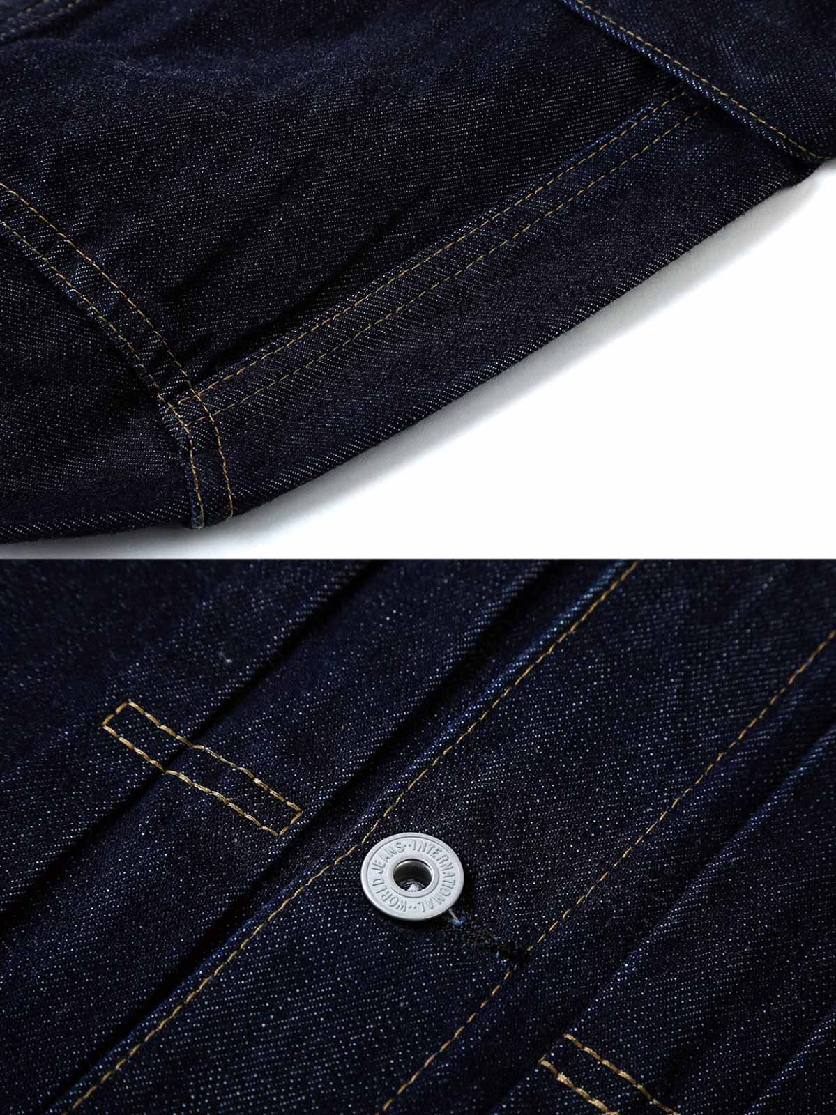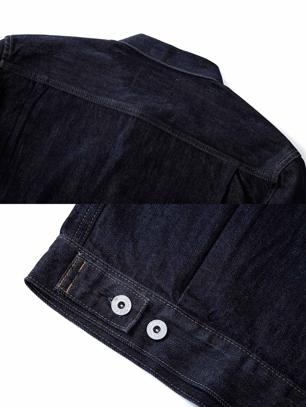 このジャケットの素材には、高品質の赤耳デニム布が使用されています。ウォッシュ加工によりデニム素材は柔らかくなり、自然な摩耗や色の変化が加わり、レトロな雰囲気を高めています。