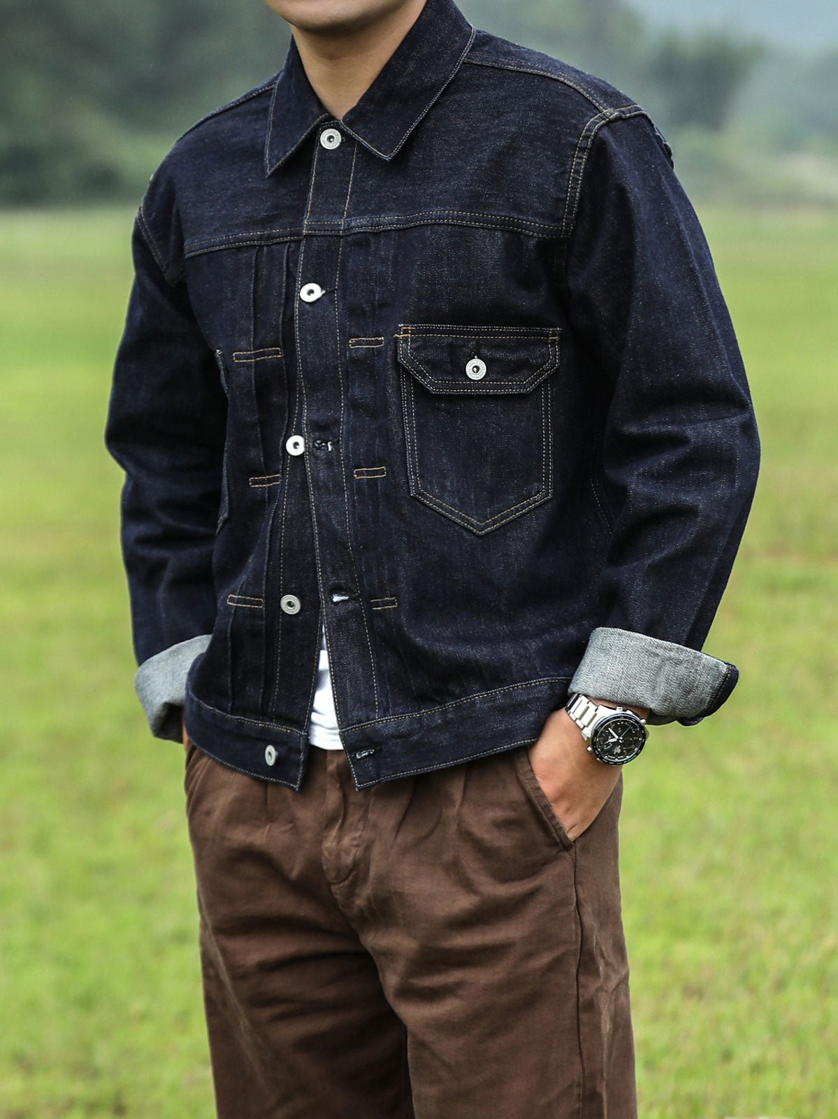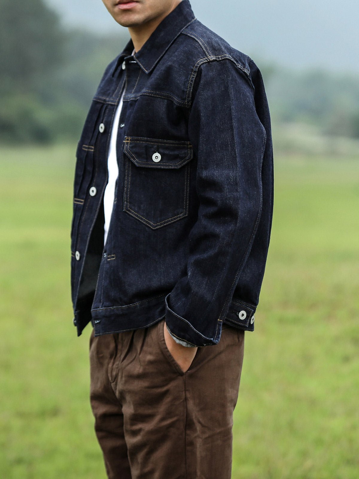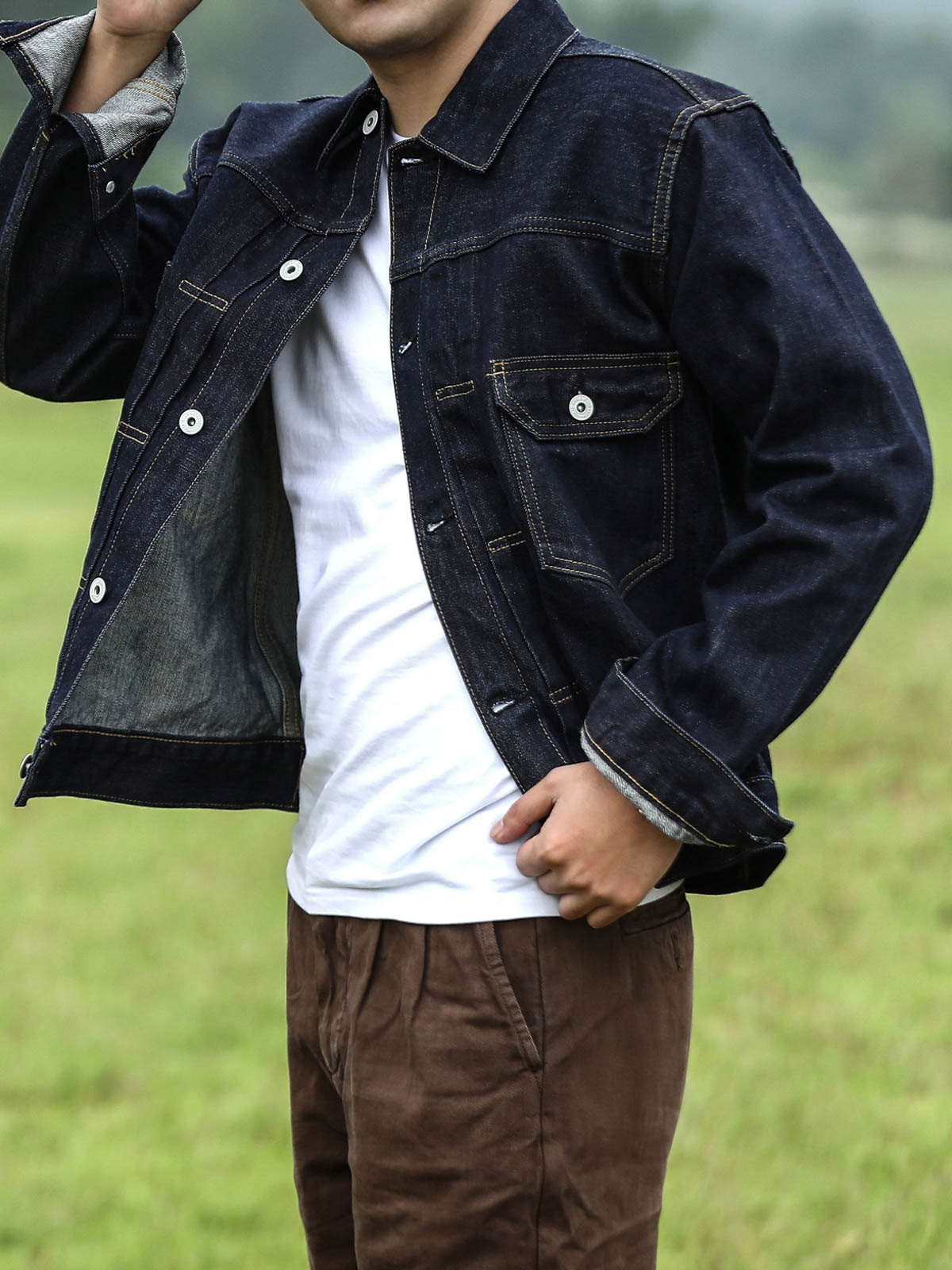 このデニムジャケットは、シンプルな白Tシャツやカジュアルなチェックシャツなど、様々な衣服と簡単に合わせることができ、ワイルドなスタイルを引き立てます。下着は、ダークカラーのカジュアルパンツやコットンパンツを選び、ジャケットの質感と色を際立たせることをおすすめします。