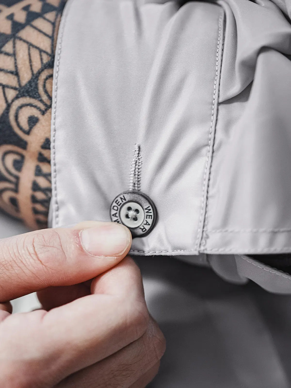 このジャケットは100%ナイロン製で、滑らかで細やかな手触りを持ち、重量は145g/m²で、軽量で耐久性も備えています。精緻な加工により、驚くほど快適な着心地を提供します。外側は滑らかで、様々なシーンに適したコーディネートが可能です。