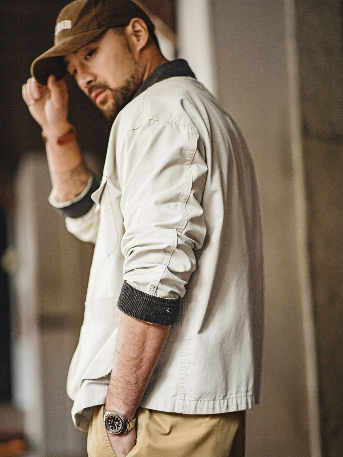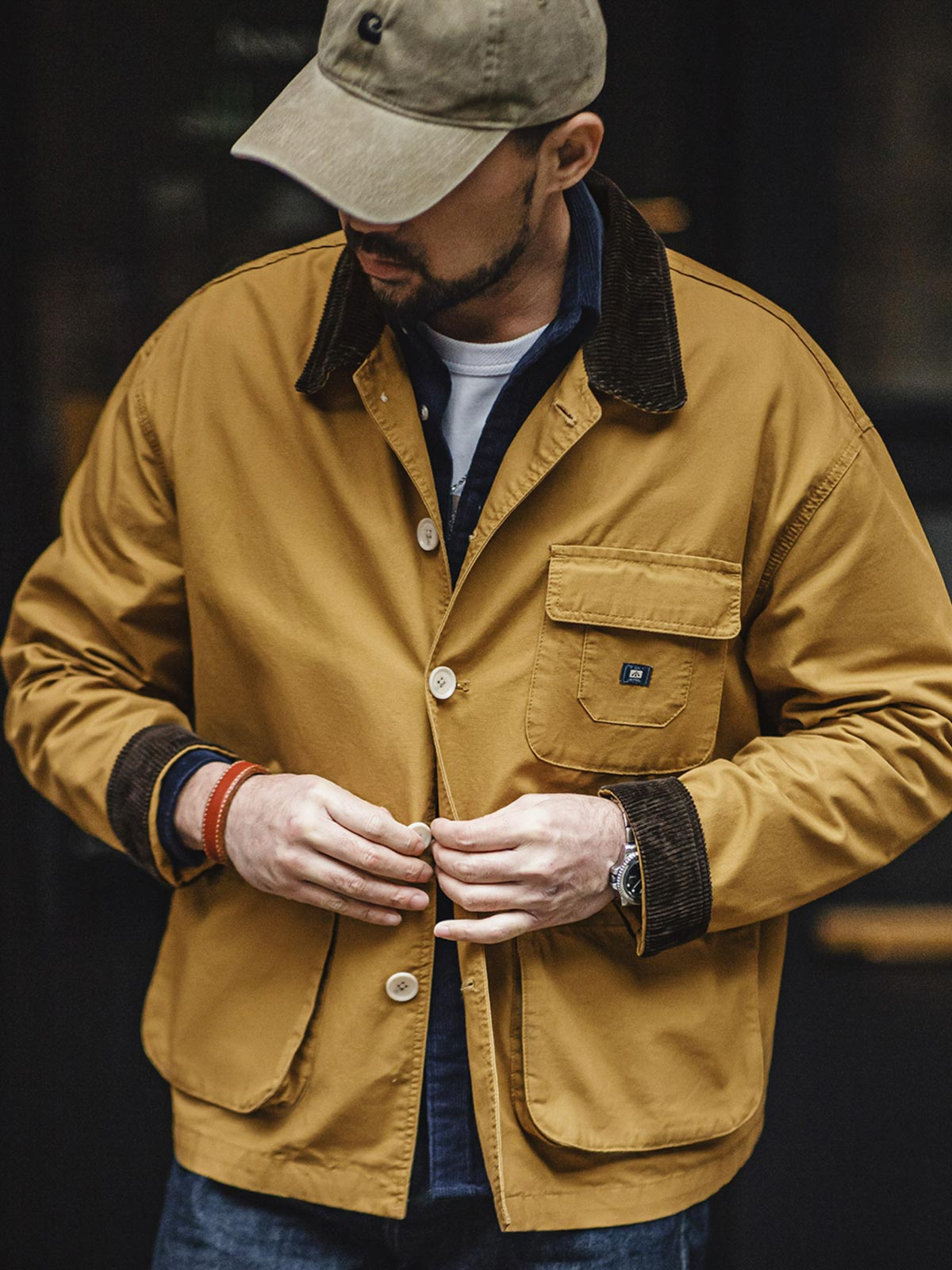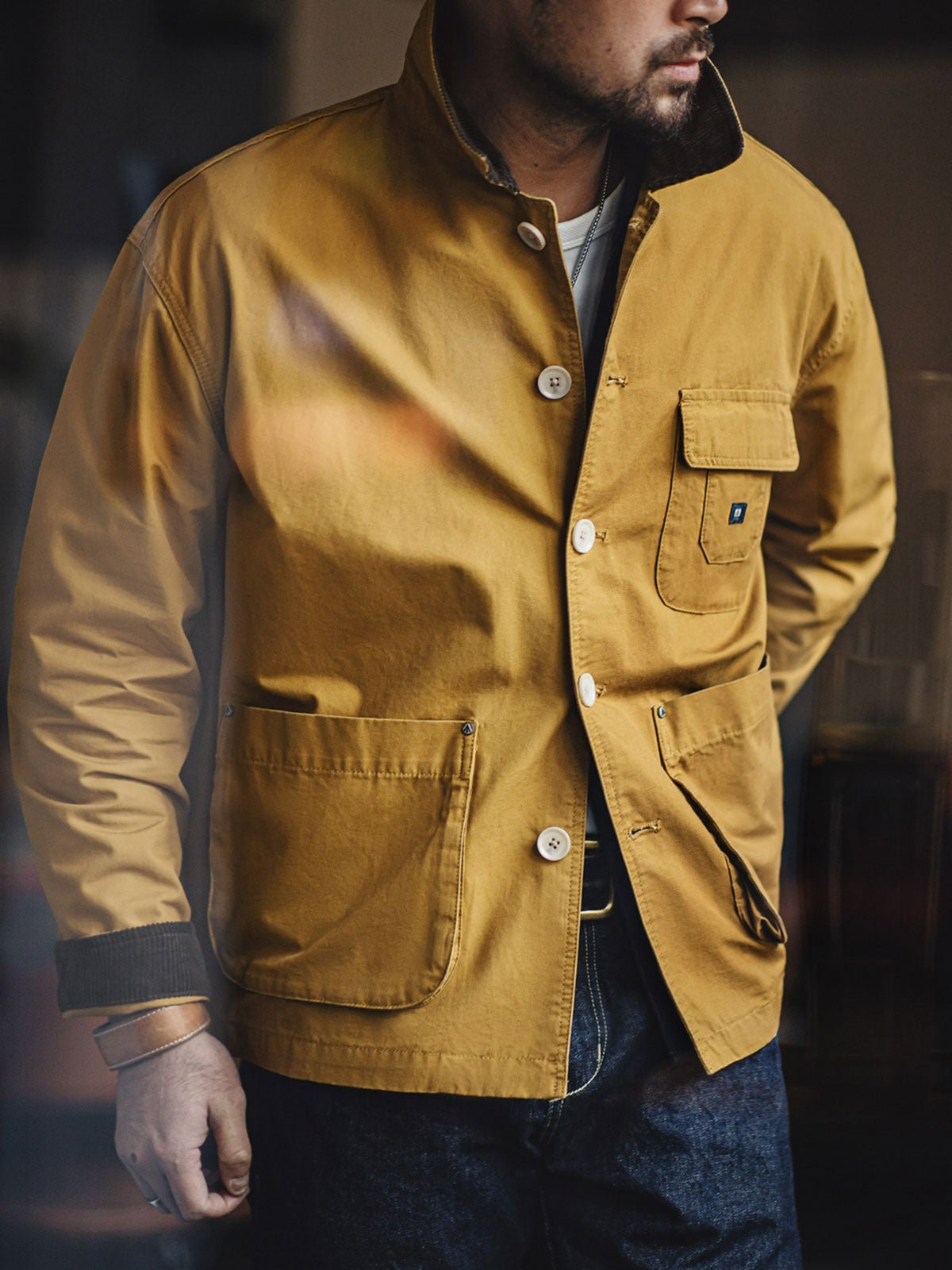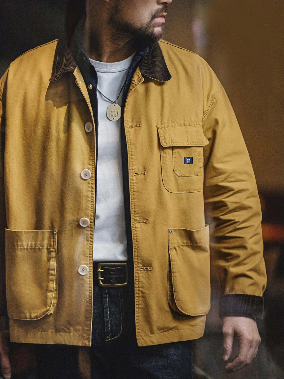 このジャケットは、ミッドセンチュリーのワークウェアデザインを現代に昇華させ、クラシックな「五つボタン三つパッチポケット」のレイアウトを採用しています。元々労働者の実用性に着目して作られたこのデザインは、時を経てヴィンテージの象徴として進化し、工業時代への懐古心と耐久性への敬意を表しています。