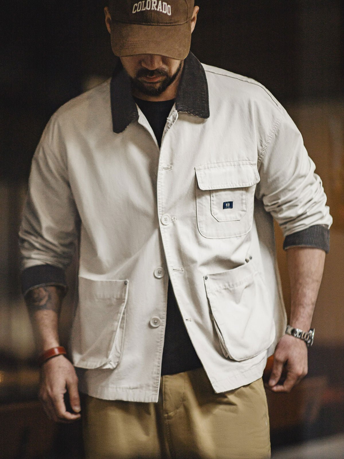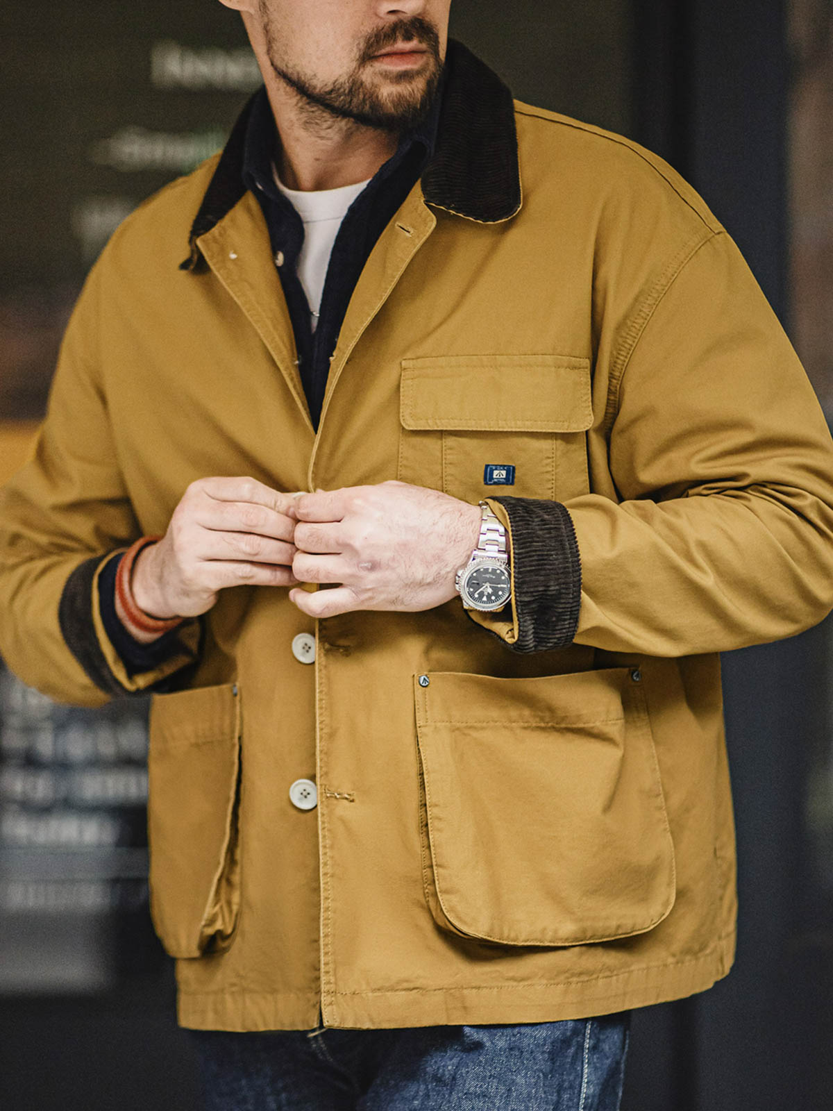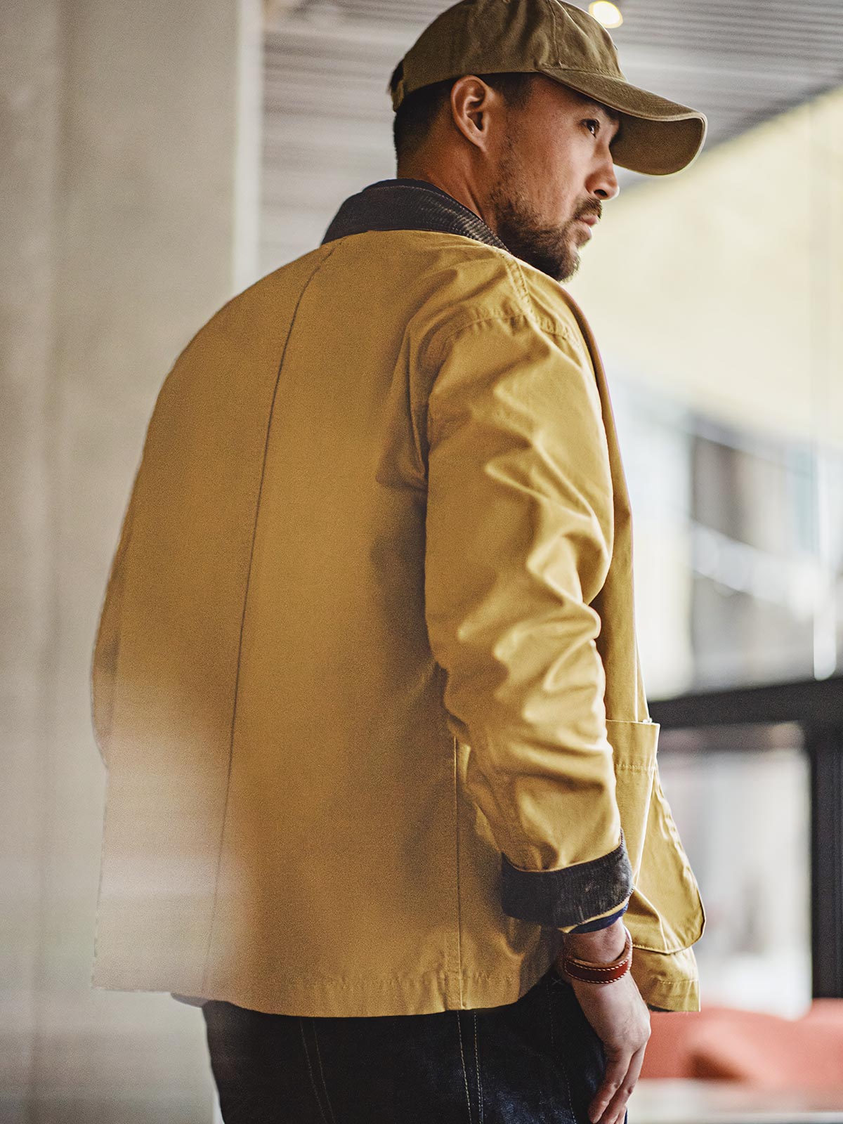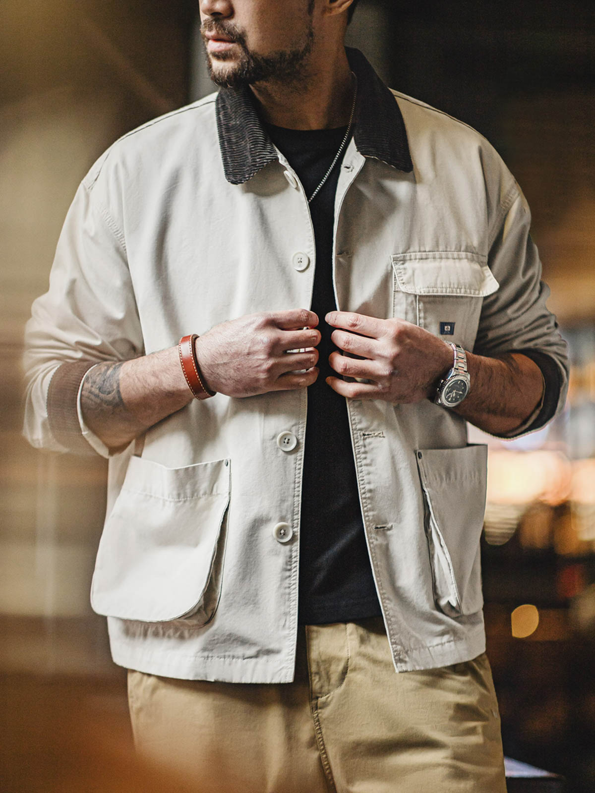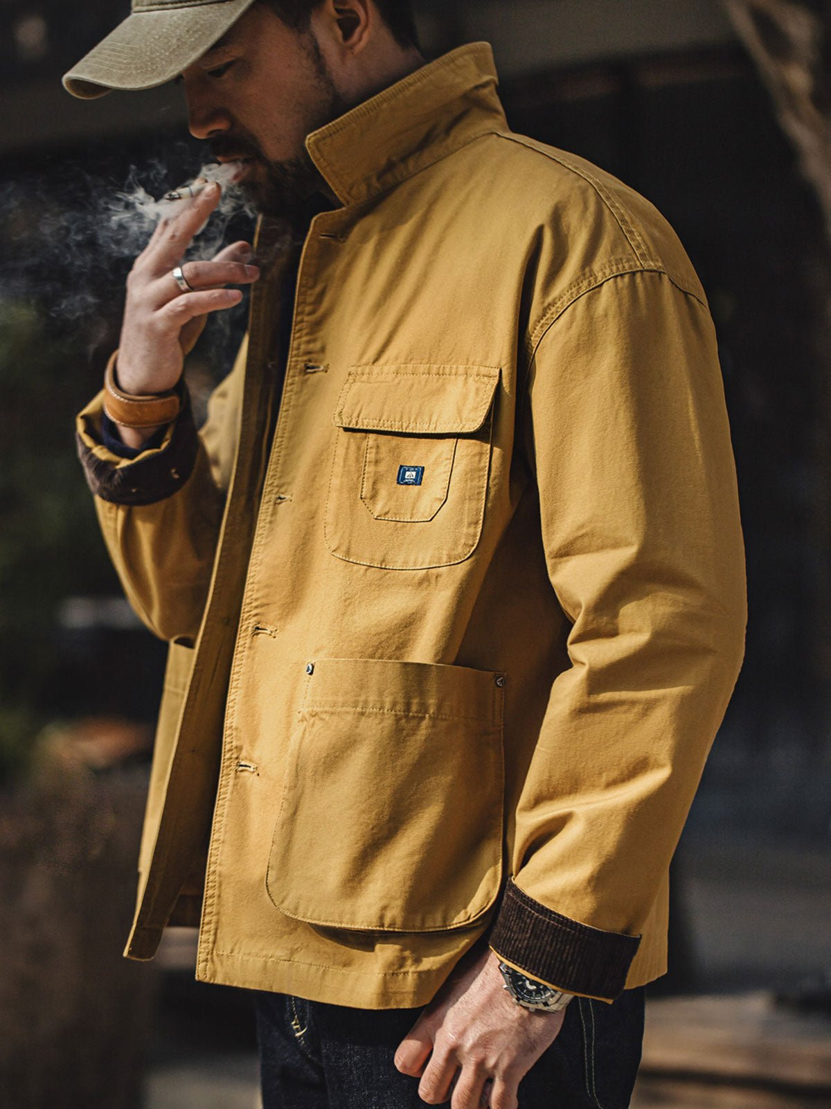 このジャケットは、ミッドセンチュリーのワークウェアデザインを現代に昇華させ、クラシックな「五つボタン三つパッチポケット」のレイアウトを採用しています。元々労働者の実用性に着目して作られたこのデザインは、時を経てヴィンテージの象徴として進化し、工業時代への懐古心と耐久性への敬意を表しています。