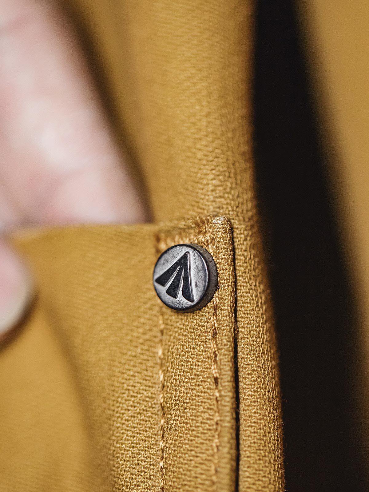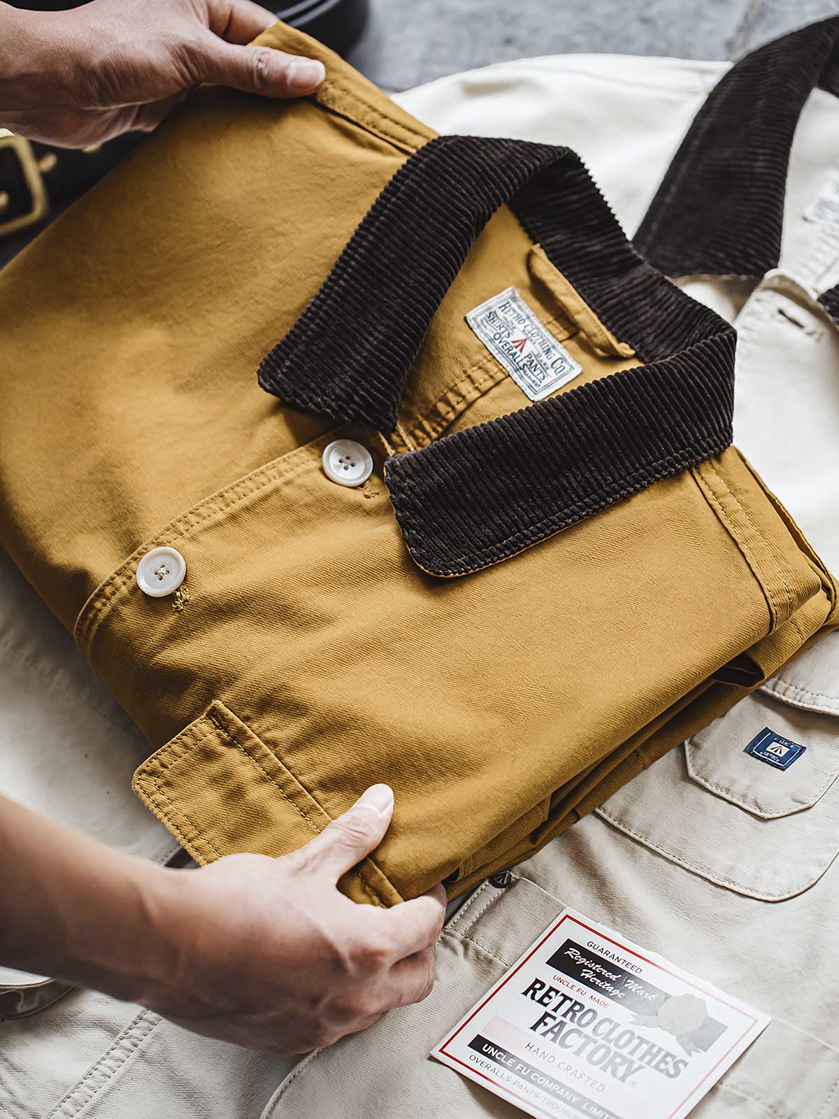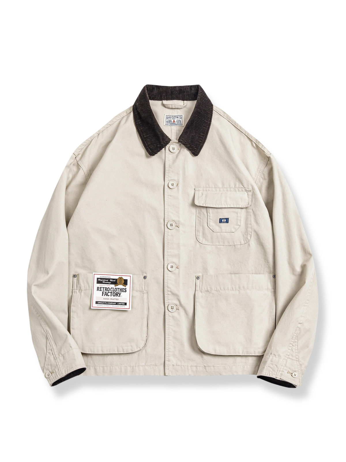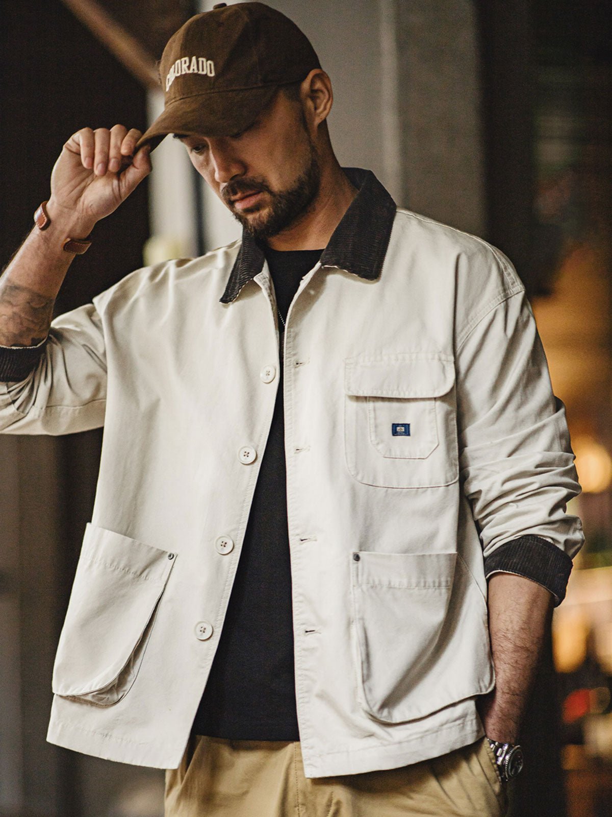 このジャケットは、ミッドセンチュリーのワークウェアデザインを現代に昇華させ、クラシックな「五つボタン三つパッチポケット」のレイアウトを採用しています。元々労働者の実用性に着目して作られたこのデザインは、時を経てヴィンテージの象徴として進化し、工業時代への懐古心と耐久性への敬意を表しています。