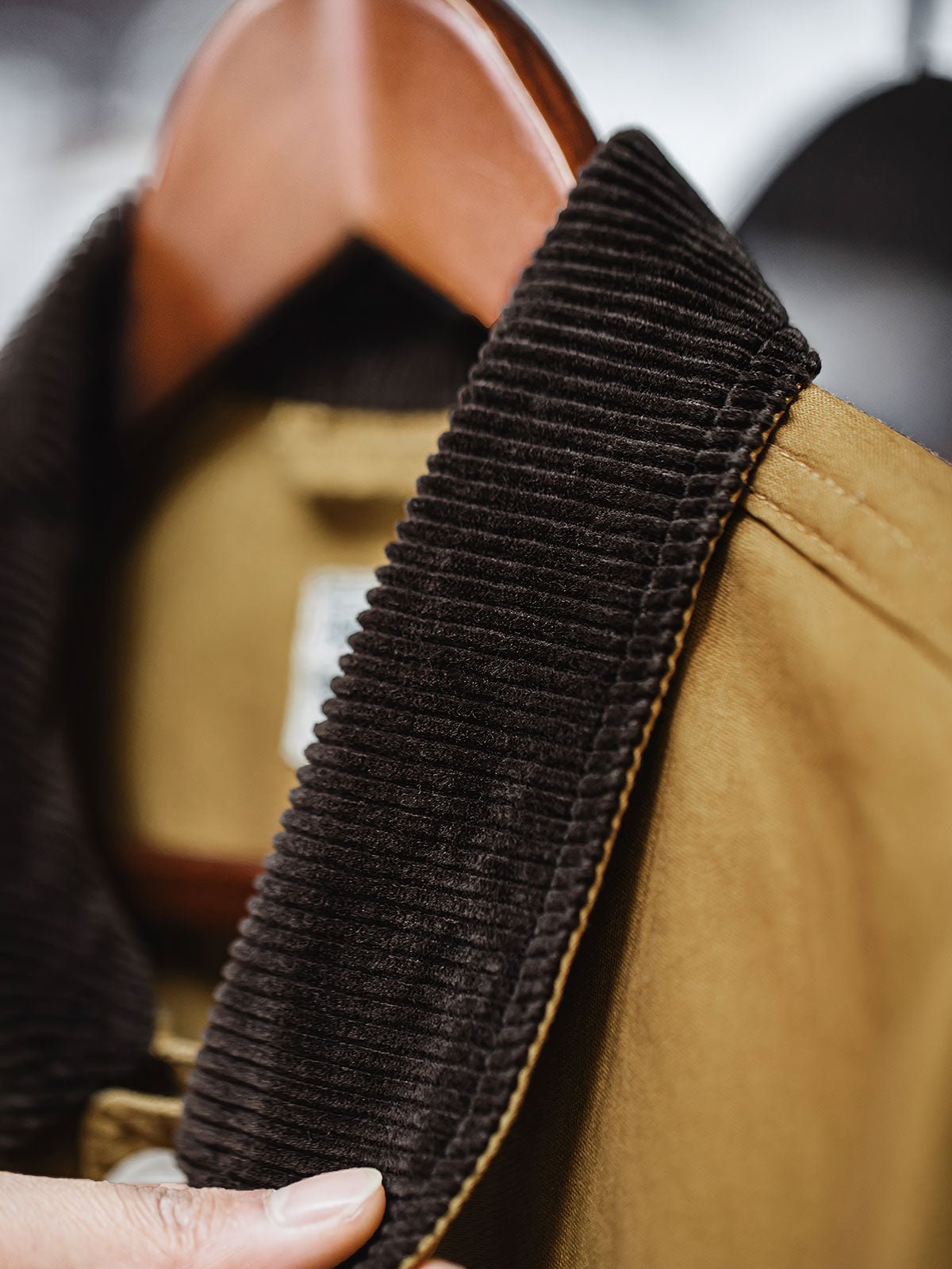 ジャケットのシルエットは、ワークウェア特有のリラックスフィットを取り入れ、快適性と動きやすさを兼ね備えています。コーデュロイの襟と袖口は寒い季節の暖かさを提供し、コットンキャンバスの堅牢さとのコントラストが独特な着心地を実現します。