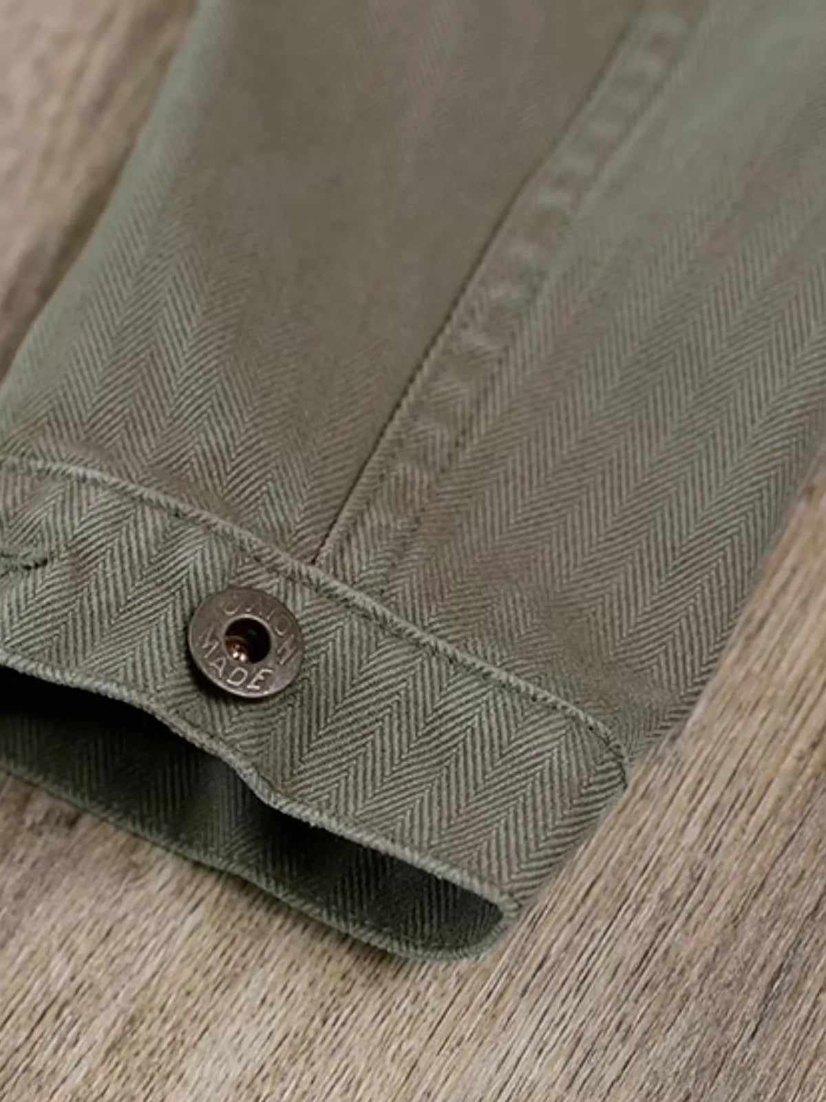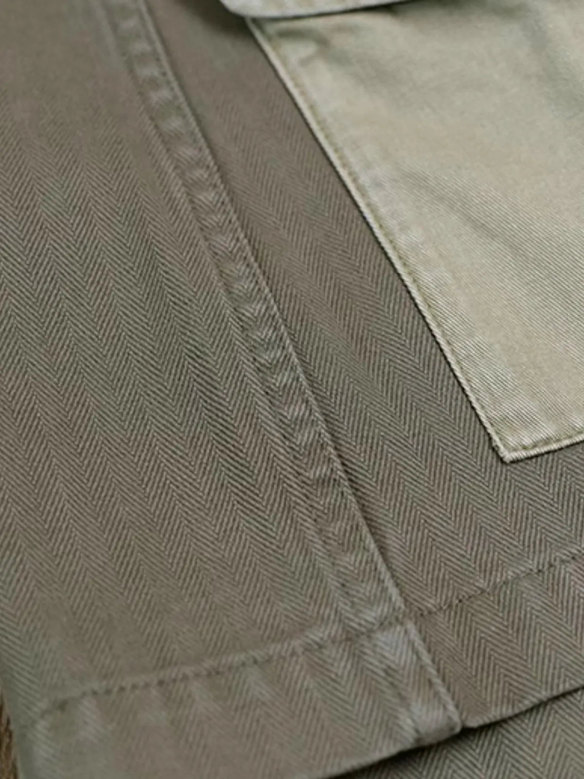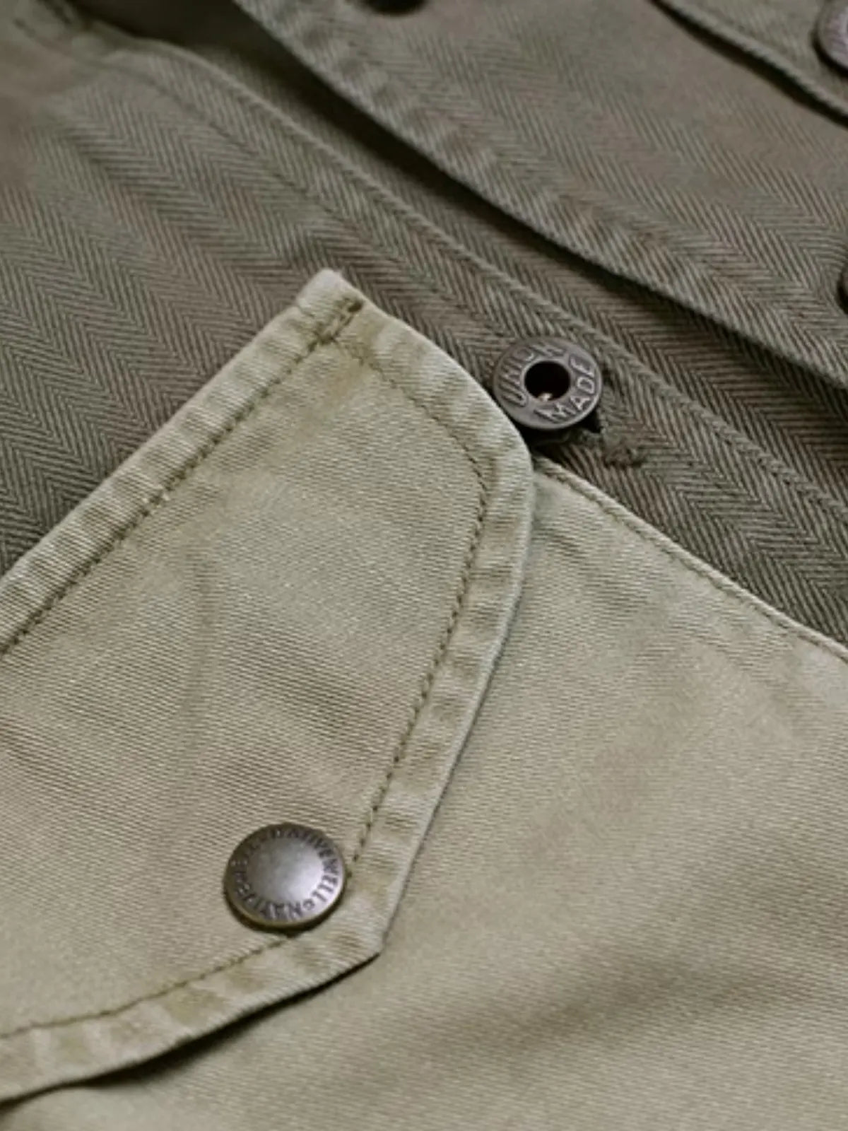 このジャケットは、伝統的なハンティングジャケットからインスピレーションを得ており、ウォッシュ加工で自然なシワ感とヴィンテージ風味を演出。100%コットンのツイード生地を使用しており、耐久性に優れ、古き良き工装スタイルを忠実に再現。左側には大きなポケット、右側には不規則なポケットを配置、収納性とヴィンテージ感を兼ね備えたデザイン。都市での通勤やアウトドアシーンにも対応可能。