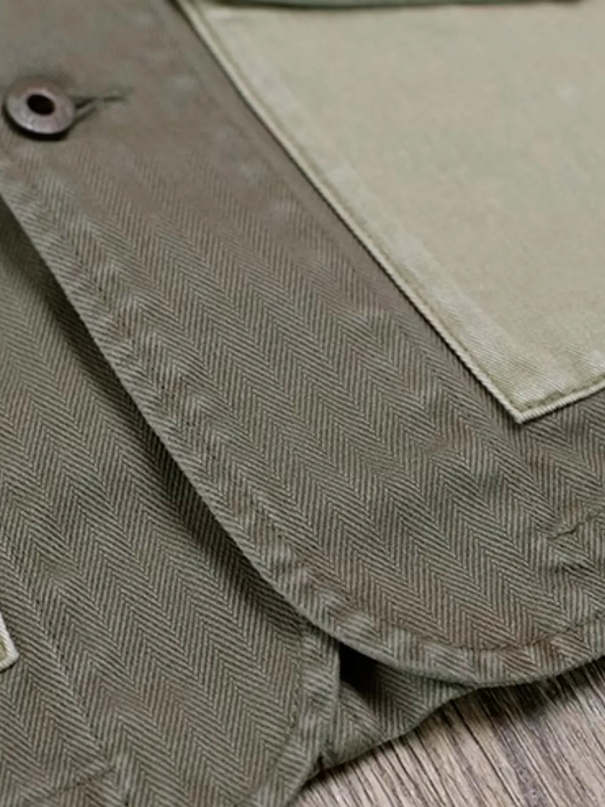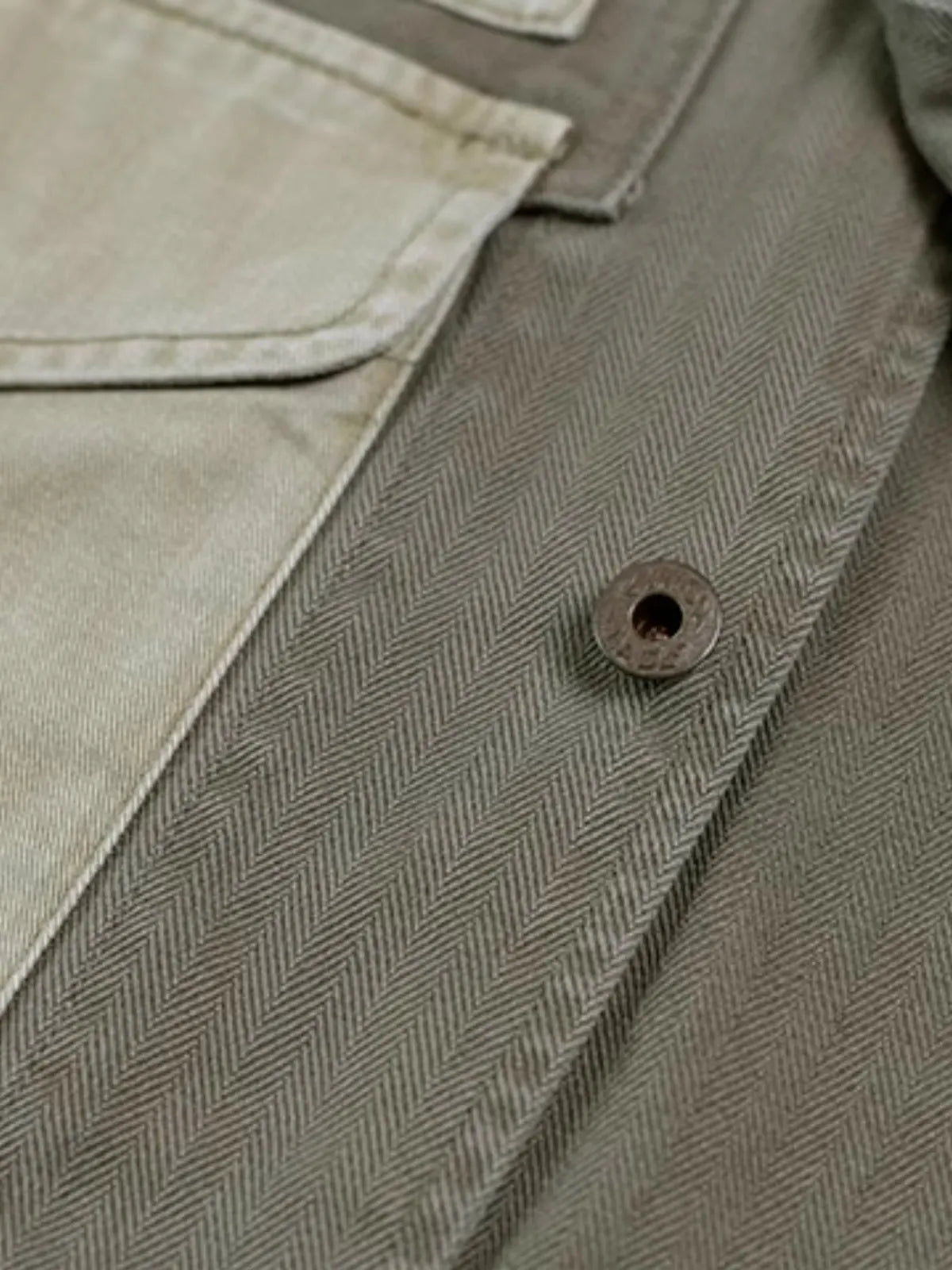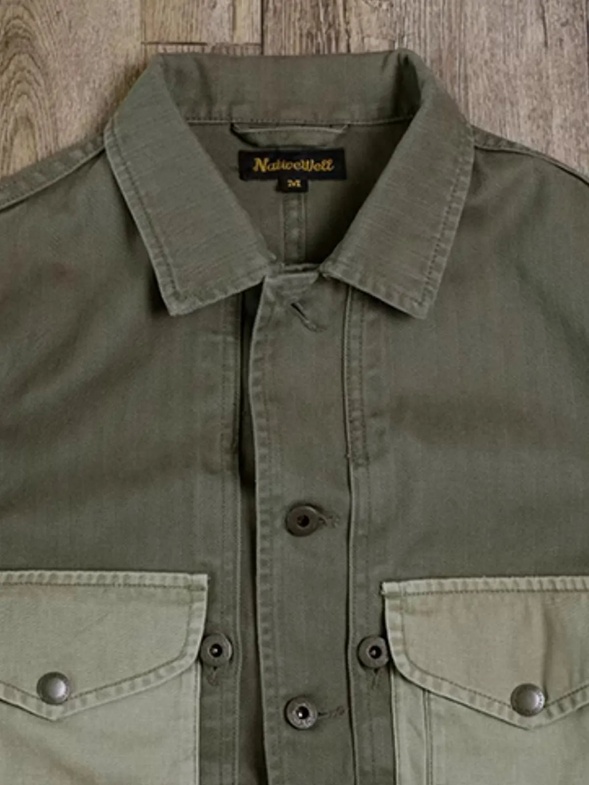 ウォッシュ加工により、クラシックなツイード生地と多機能ポケットデザインが融合した、レトロとモダン工装の魅力を兼ね備えたジャケット。