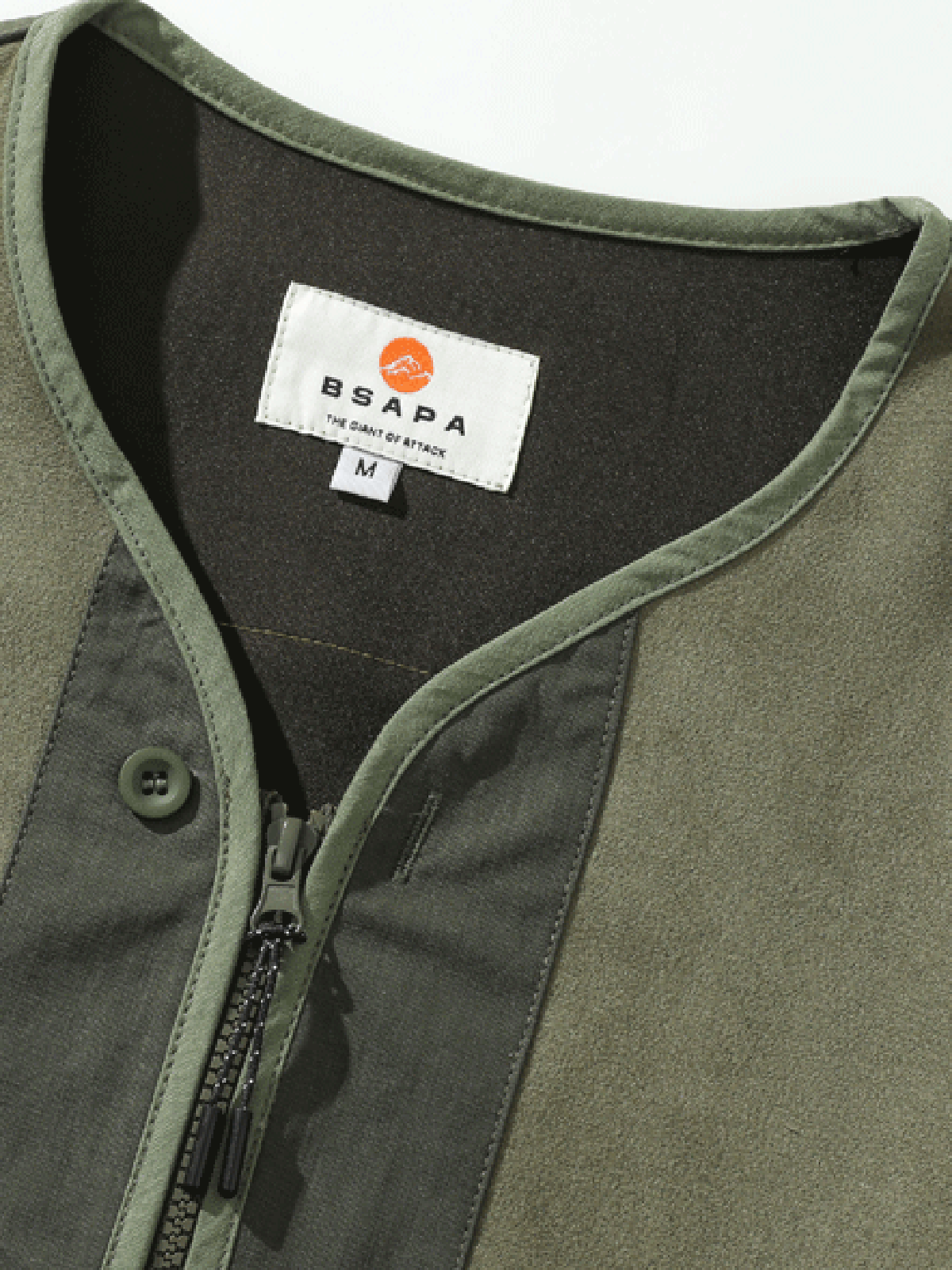 クラシックなワークデザインにスエード調素材の切り替えを施し、実用性とファッション性を両立。ブルーとグリーンの2色展開で、多彩な着こなしが楽しめる一枚。