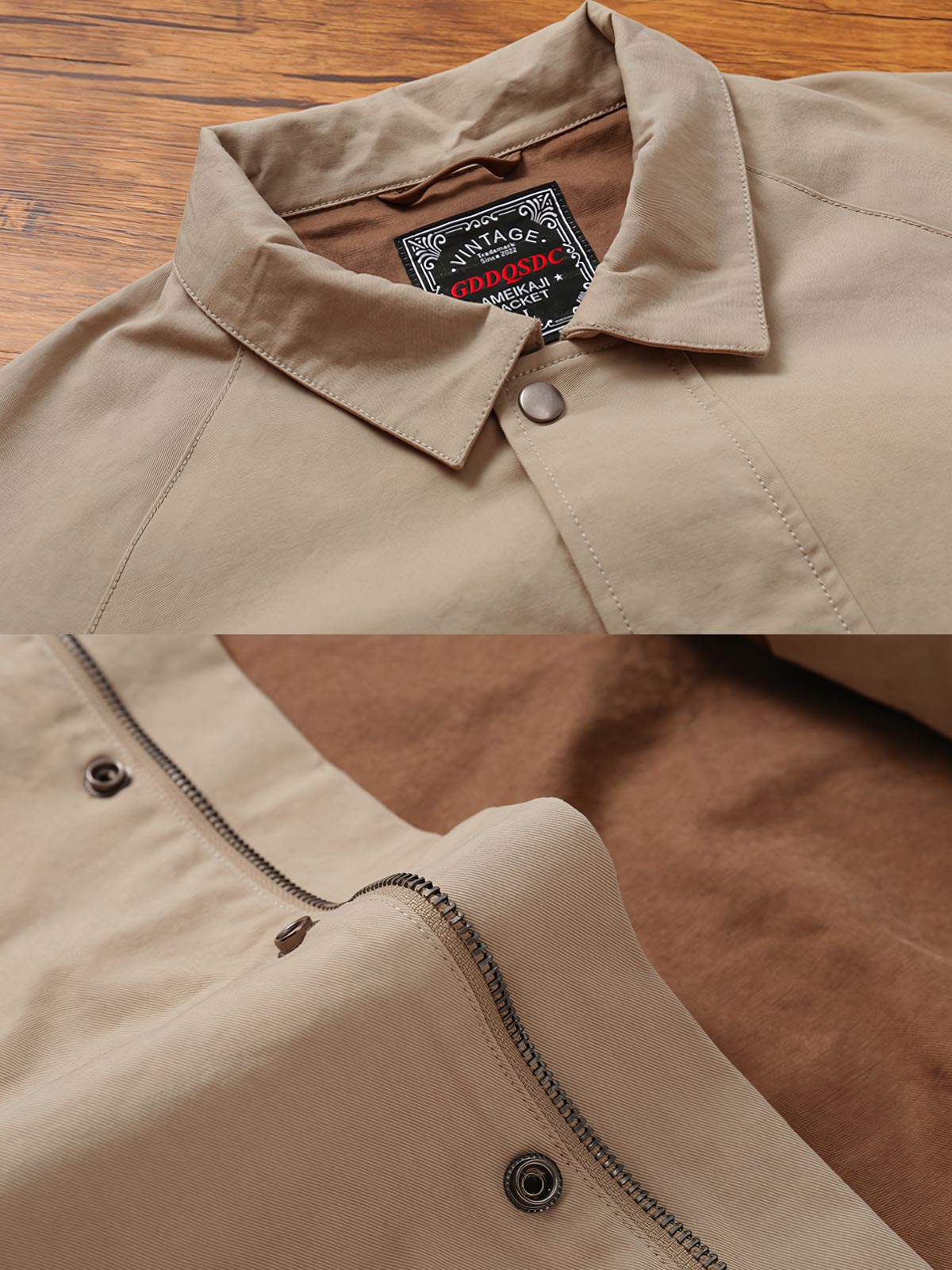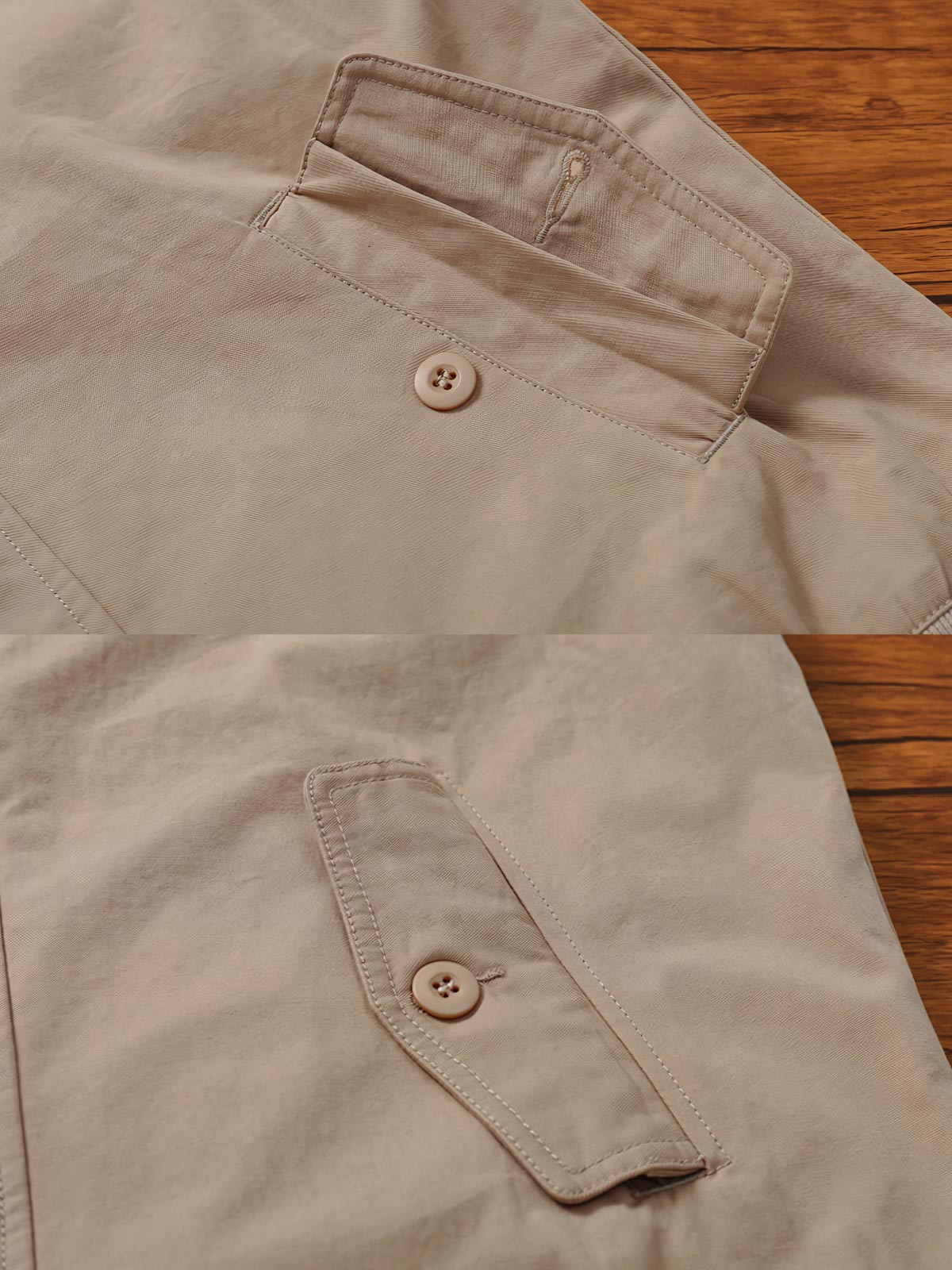 このジャケットは、高品質のコットン素材を使用し、精巧な作りで快適で耐久性のある着心地を提供しています。素材の色選びでは、このサンドカラーが温かみのあるクラシックな印象を与えます。フロントのポケットと精巧なボタンのディテールは、実用性を保ちながらも洗練された印象を与えています。