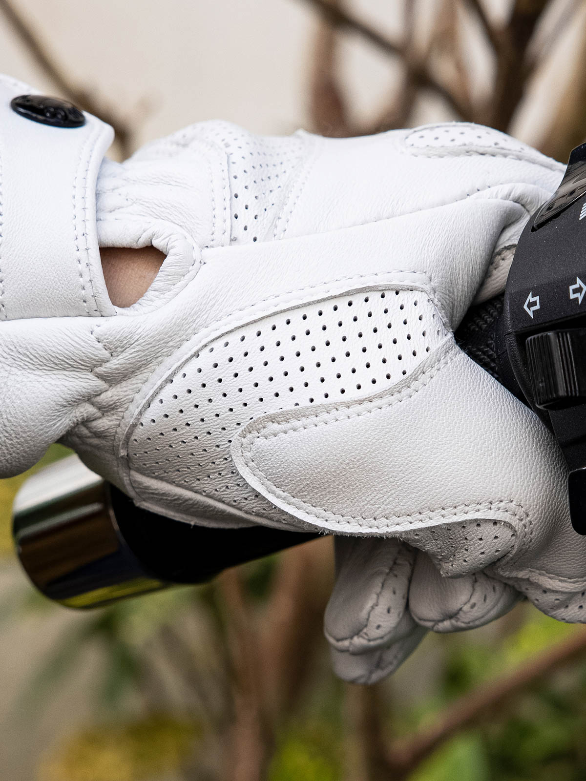 高品質の羊革を使用し、柔らかさと耐久性を兼ね備えています。丁寧な裁断により、手の動きの柔軟性と快適なフィット感が確保されています。指先にはタッチスクリーン素材が配されており、ライディング中でもスマートデバイスの操作が可能です。