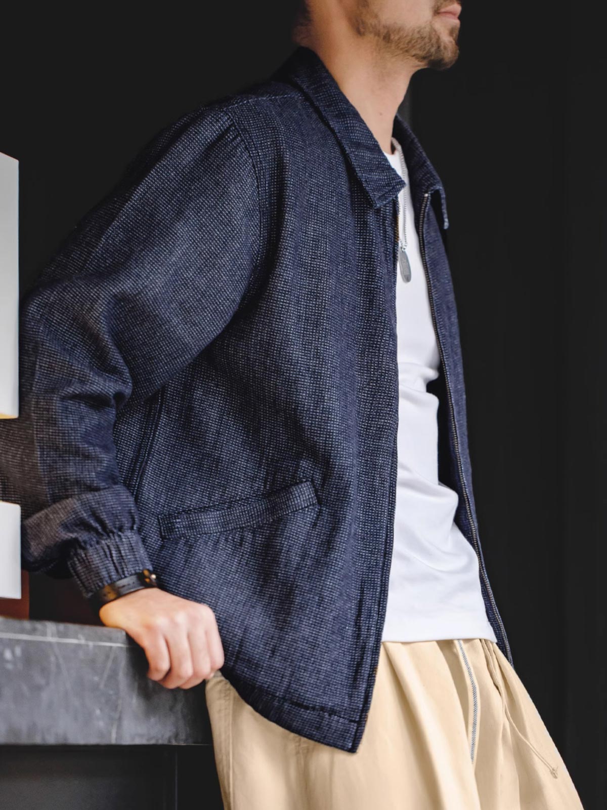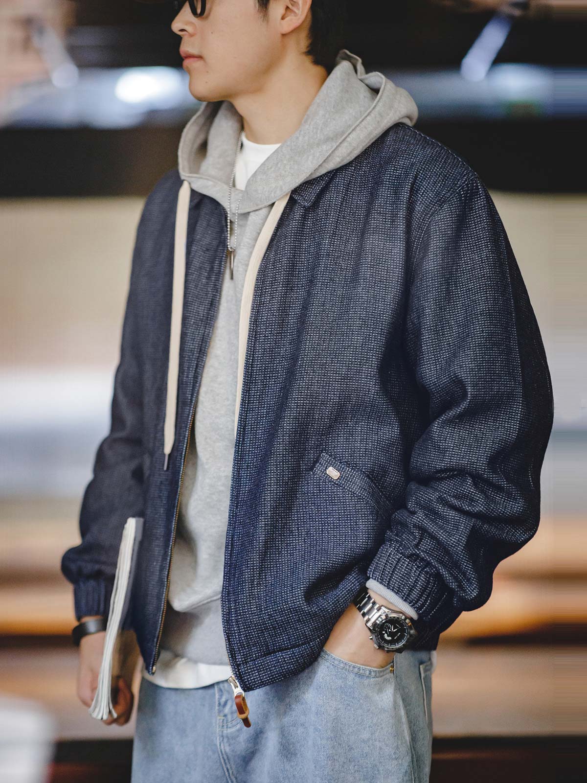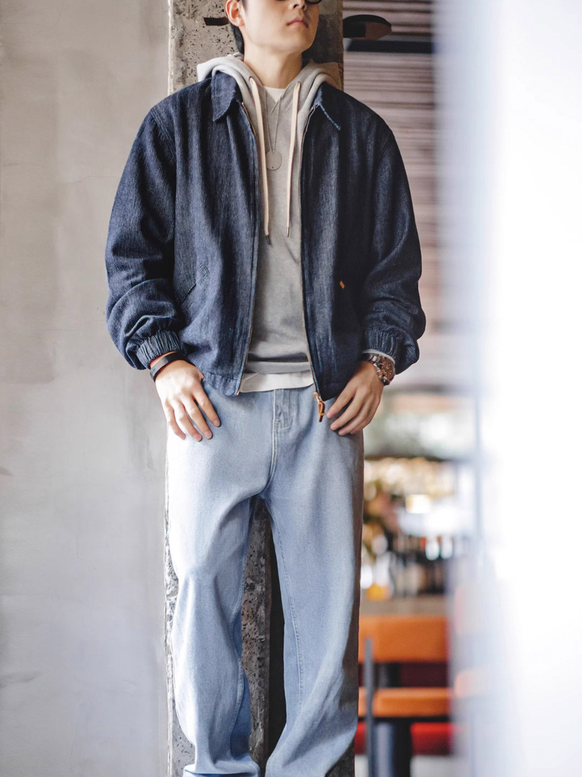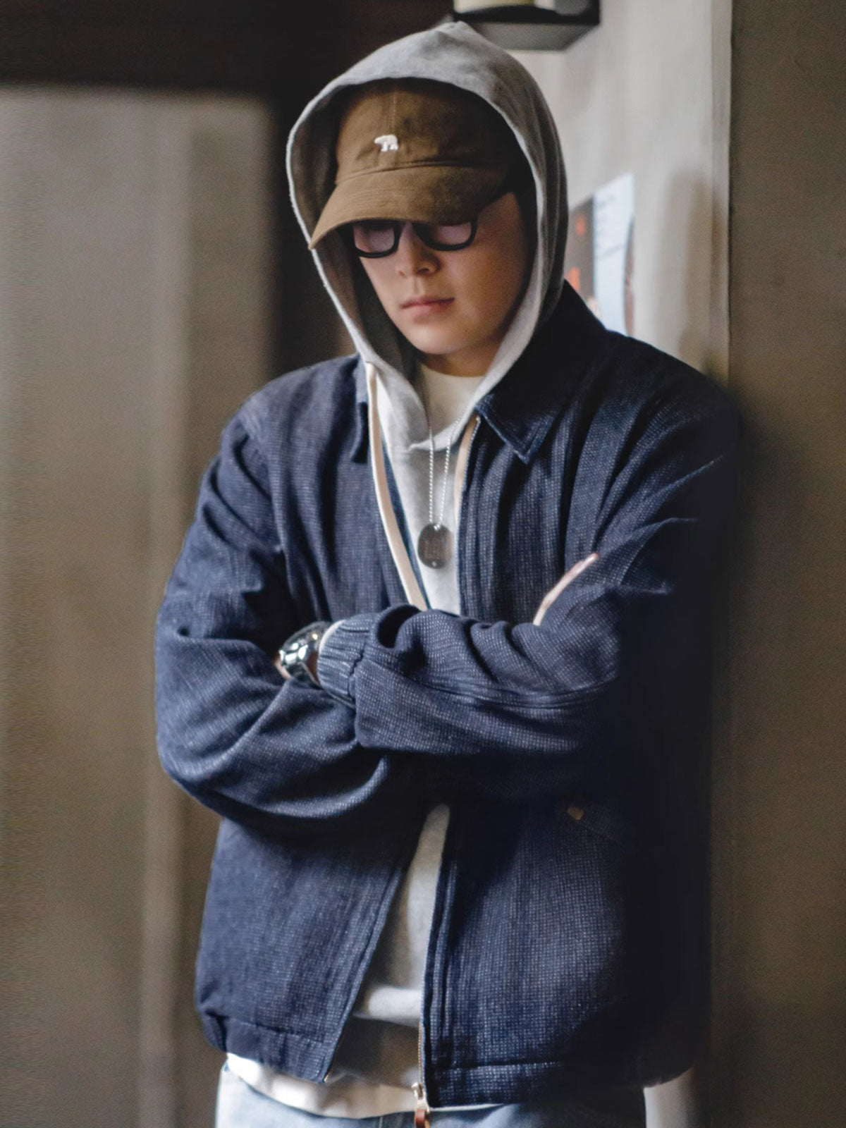 このジャケットは、デニム素材とワッフル織りの組み合わせで作られており、二重の素材がもたらすスタイルの融合——デニムのカジュアルでタフな雰囲気とワッフル織りの繊細なレトロ感が特徴です。さらに、ジャケットの襟、袖口、裾は通常リブデザインで、スポーティーさを増すとともに快適さも向上しています。デニムの織り柄の使用は、クラシックなコーチジャケットの素材に新たな息吹を吹き込み、ジャケットの質感と耐久性を高めています。アイテムサイズ