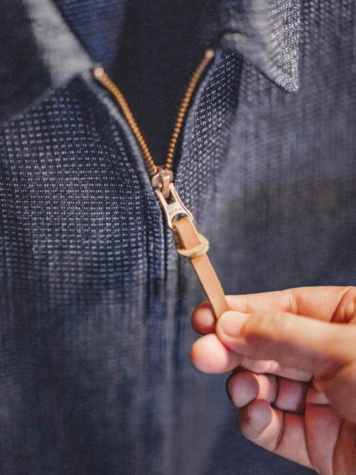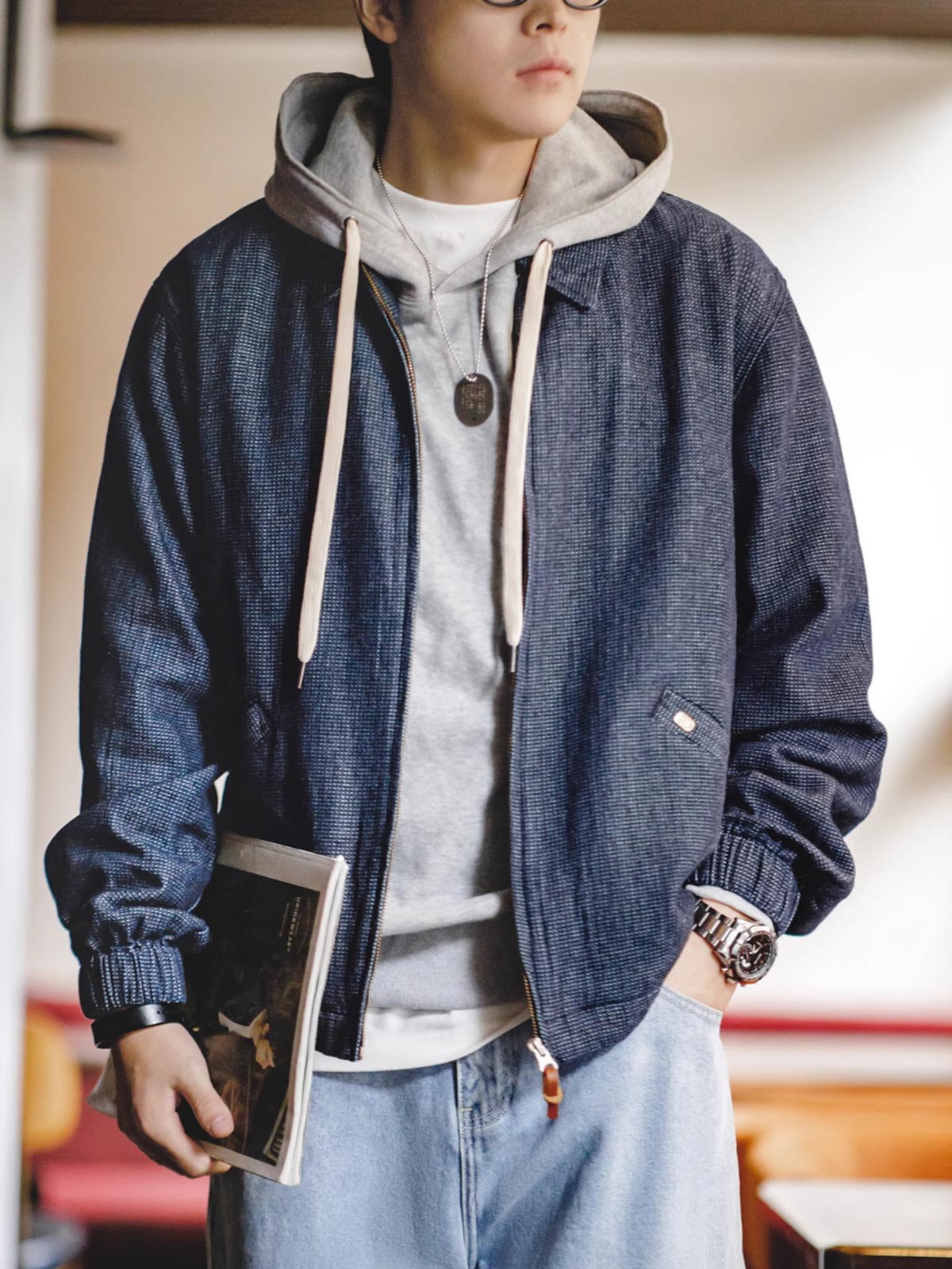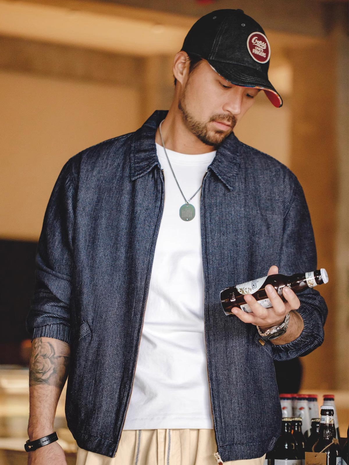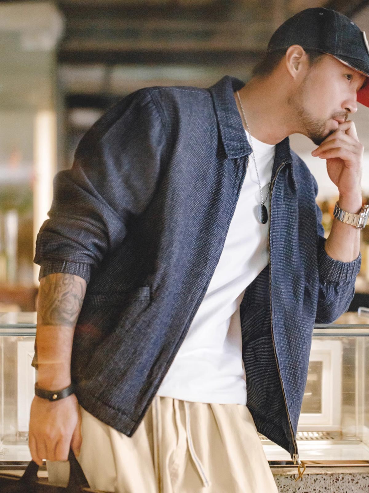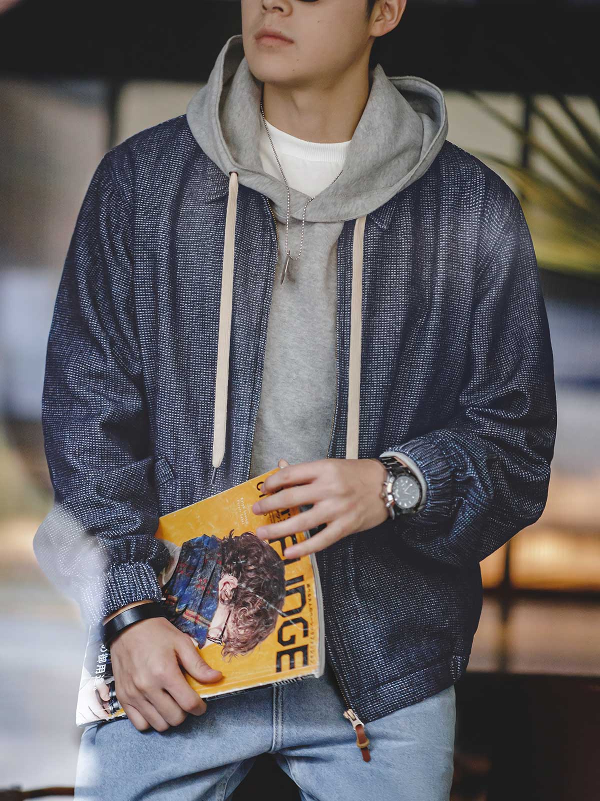 このジャケットは、デニム素材とワッフル織りの組み合わせで作られており、二重の素材がもたらすスタイルの融合——デニムのカジュアルでタフな雰囲気とワッフル織りの繊細なレトロ感が特徴です。さらに、ジャケットの襟、袖口、裾は通常リブデザインで、スポーティーさを増すとともに快適さも向上しています。デニムの織り柄の使用は、クラシックなコーチジャケットの素材に新たな息吹を吹き込み、ジャケットの質感と耐久性を高めています。アイテムサイズ