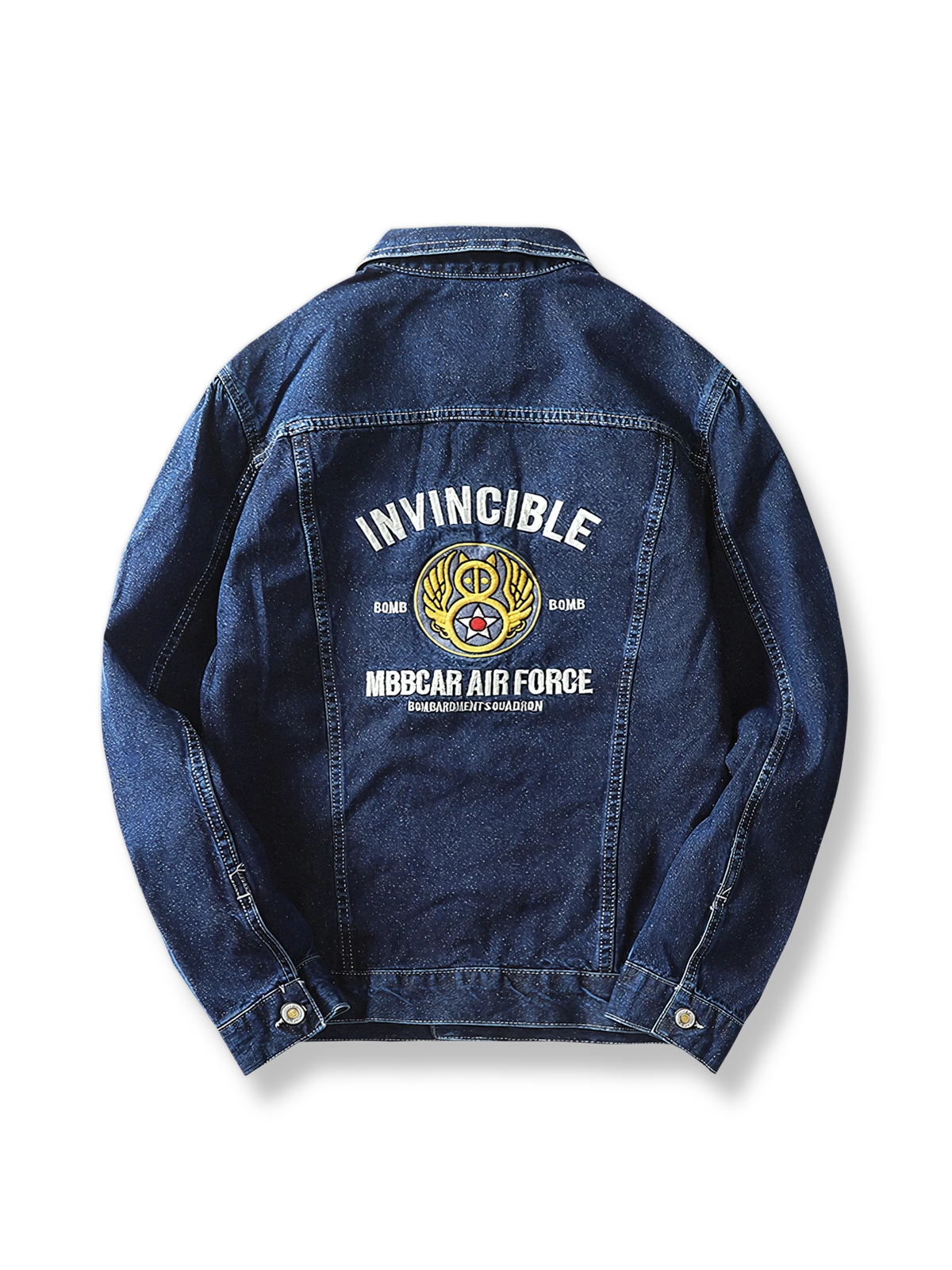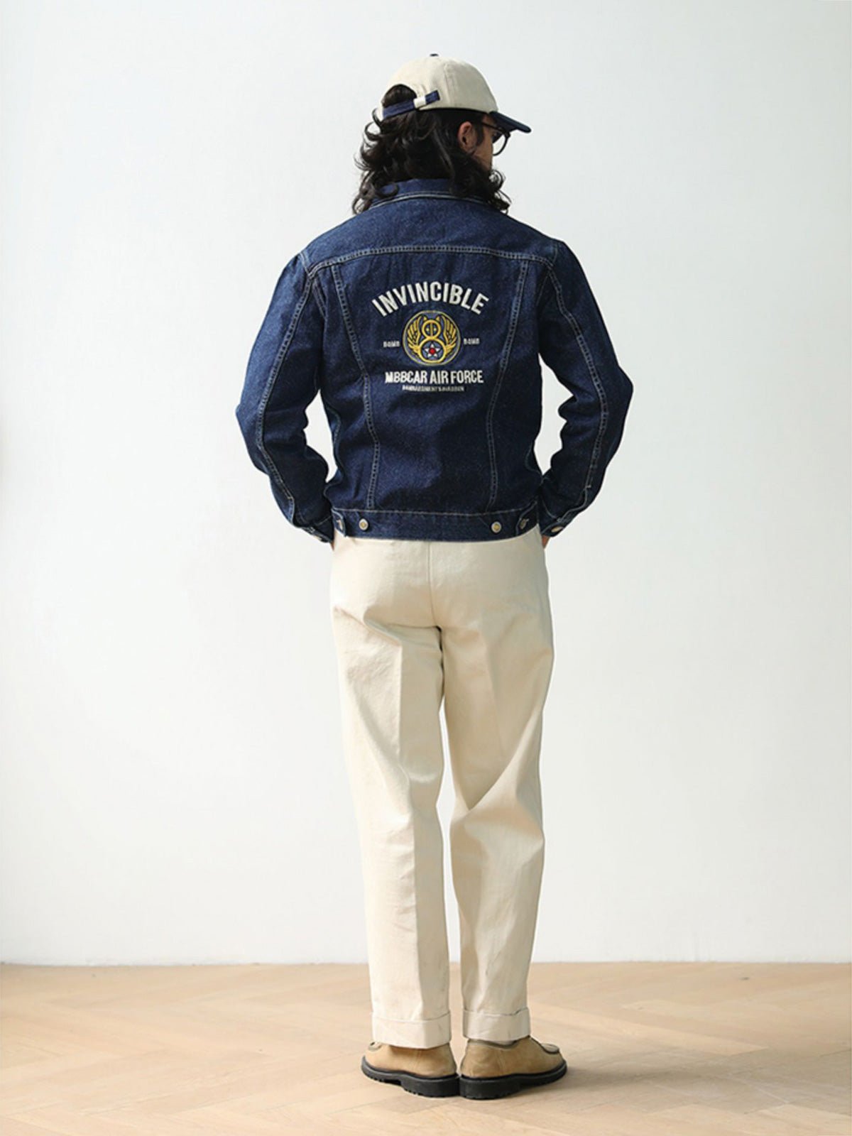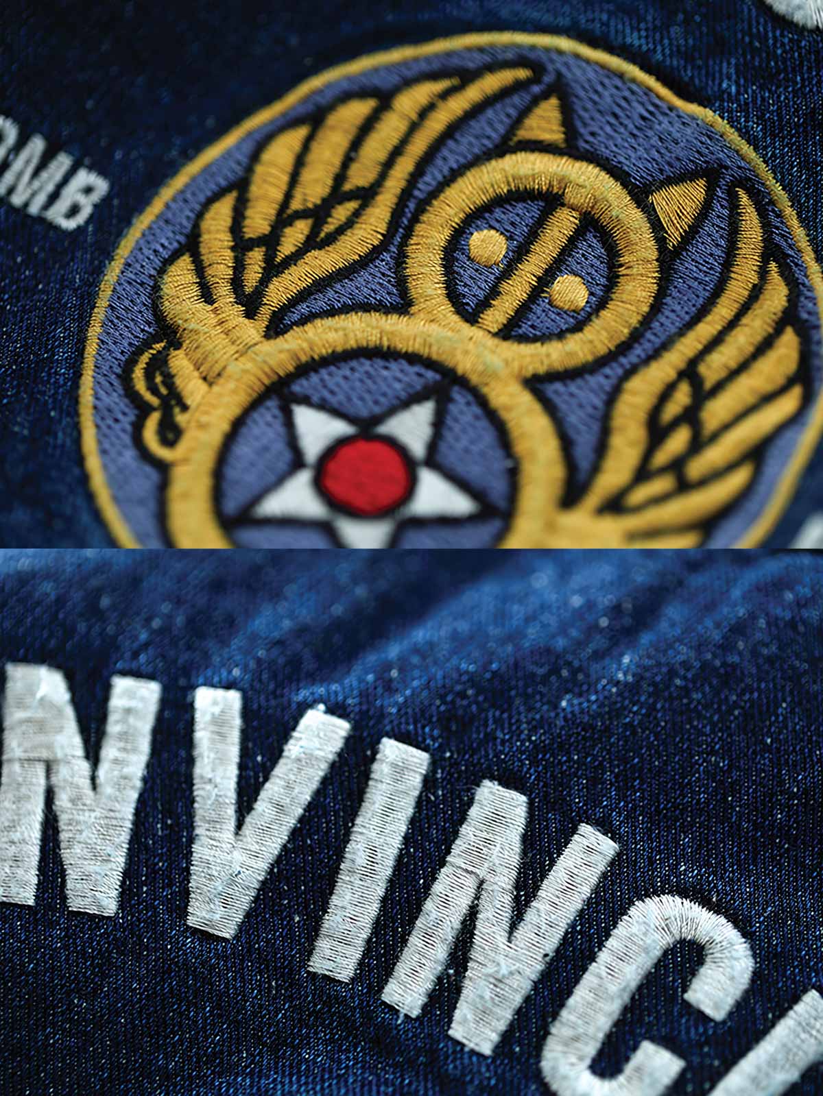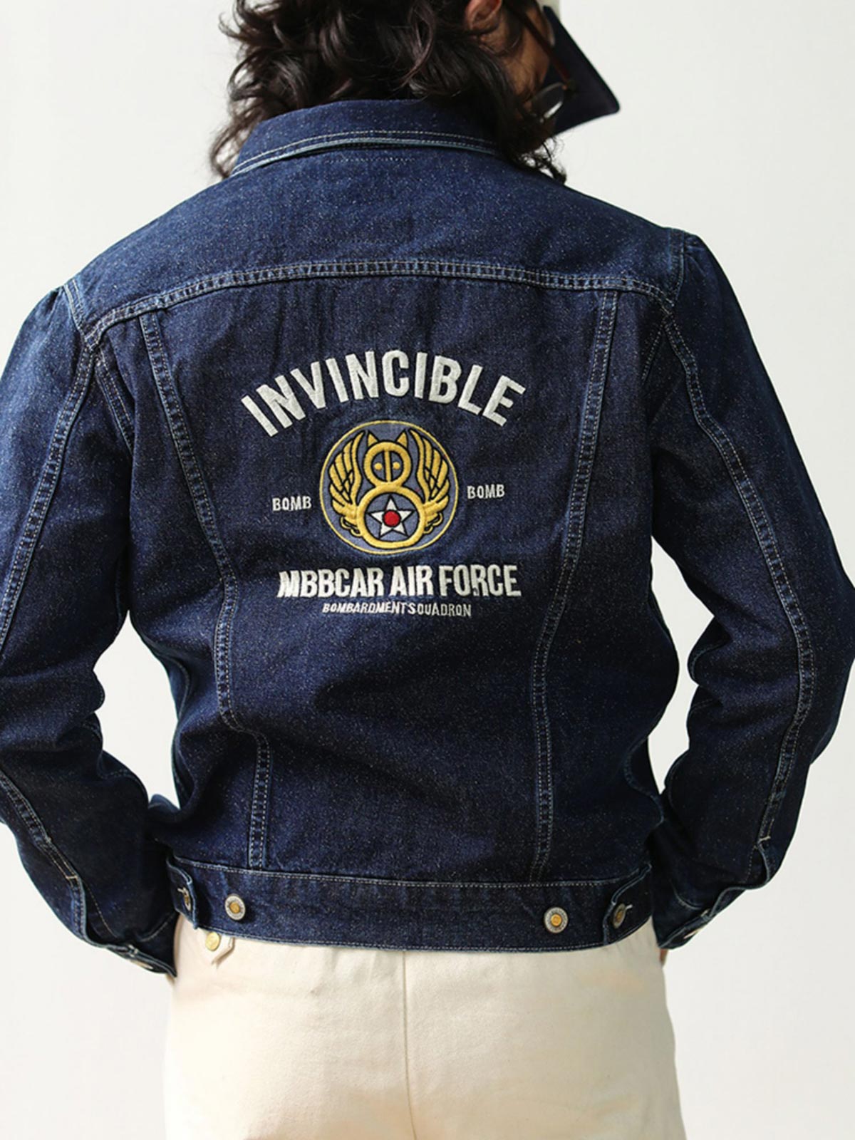 このジャケットは、軍事的要素と現代ファッションの融合を体現しています。背面にある精巧な「INVINCIBLE」の刺繍と空軍モチーフが、軍服への敬意と着用者の力強さ、冒険心を象徴しています。使用されているレッドイヤーセルビッジデニムは、日本の精緻な技術とヴィンテージデニム文化の継承を物語っています。