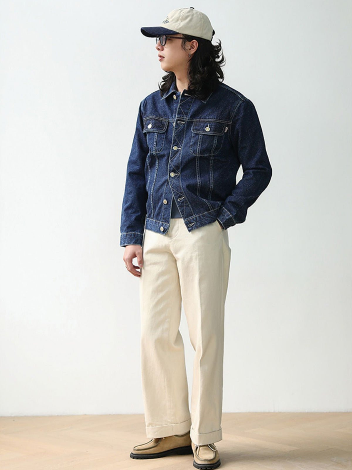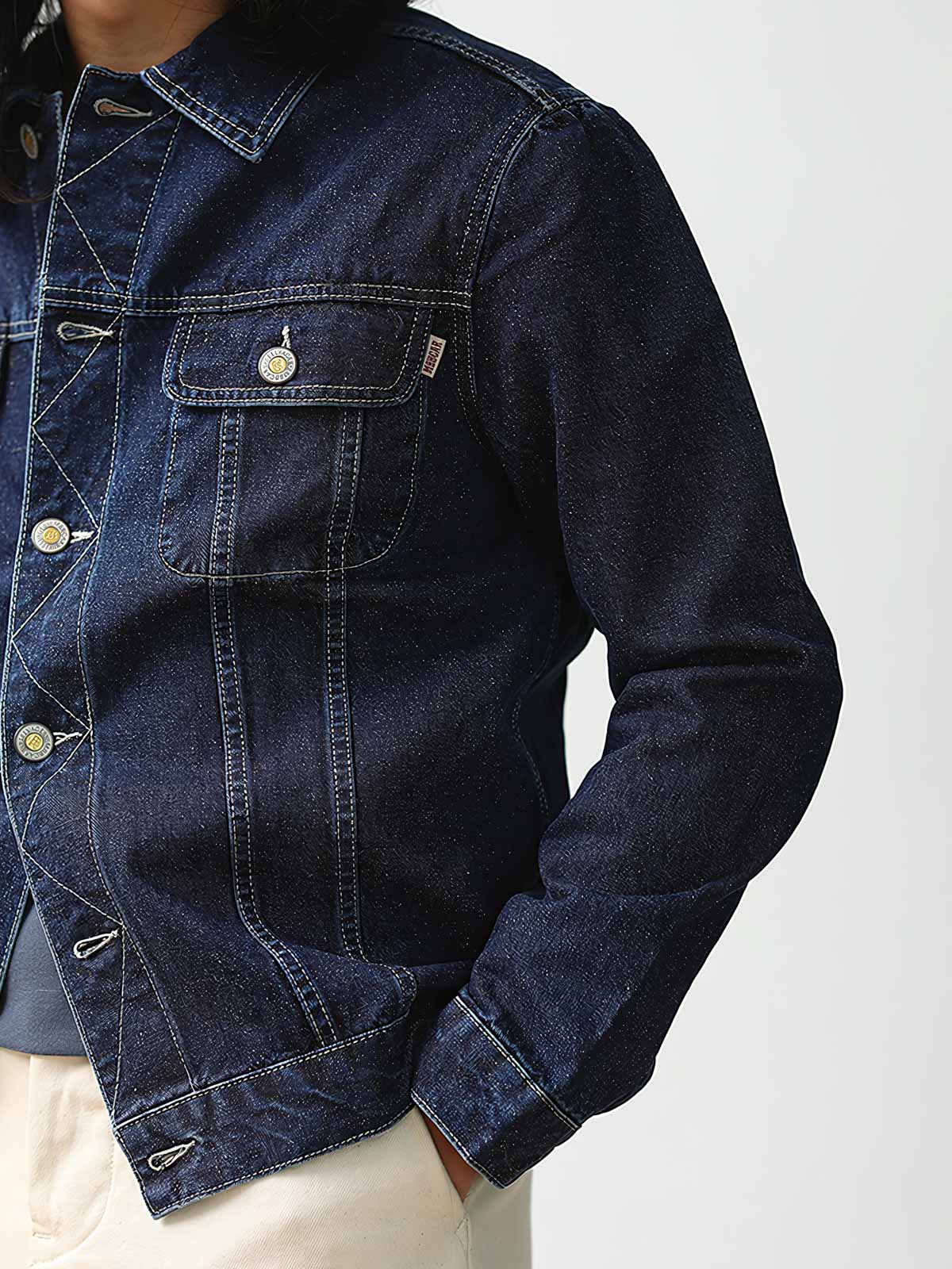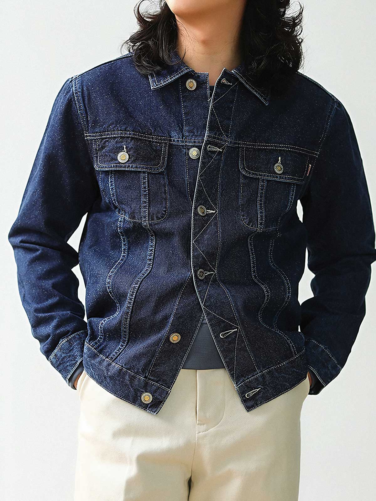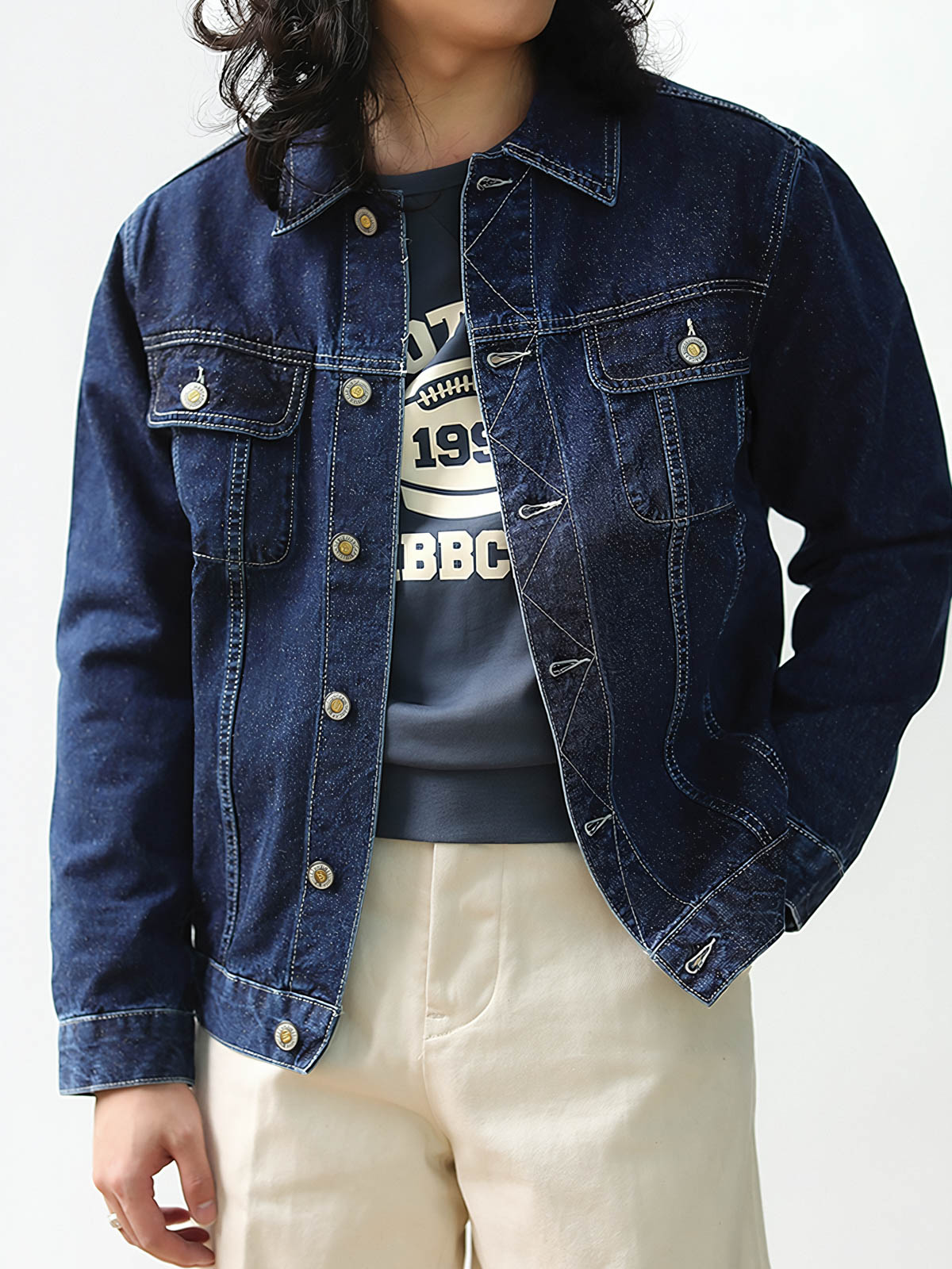 伝統的なワークジャケットの型を採用し、快適で幅広い体型にフィットします。高品質なデニム生地は、着用者の個性と体型に合わせて経年変化し、独自の着用感を提供します。