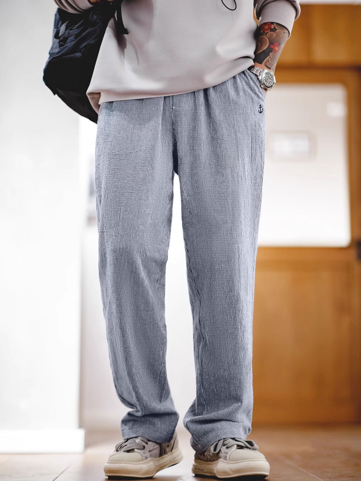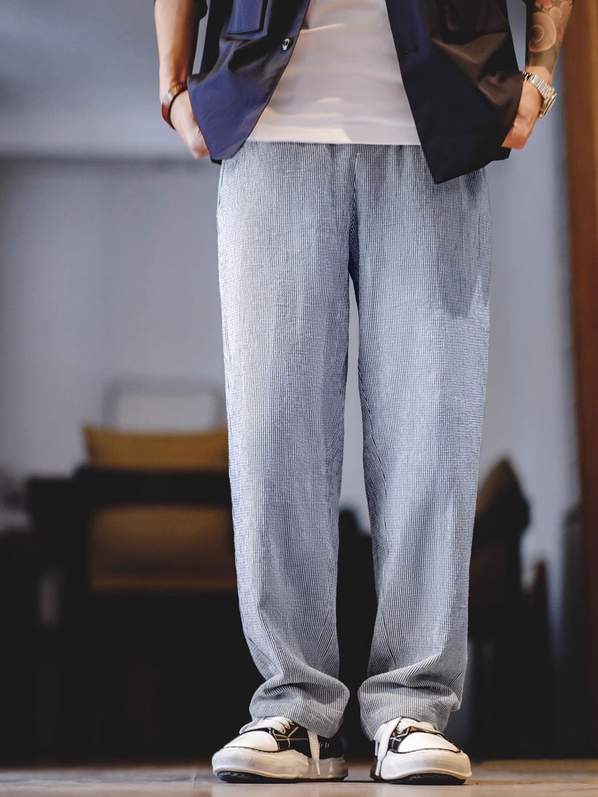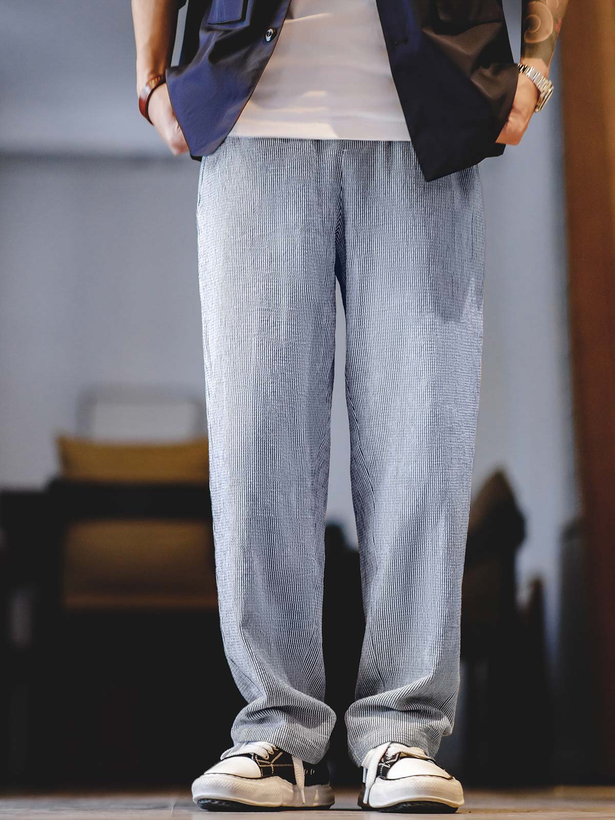 このEasypants ストライプカジュアルパンツは、柔軟性と快適性を追求した現代的なデザインです。グレーブルーのストライプパターンは、視覚的鮮度とクラシックなストライプの現代的再解釈を提供します。このストライプデザインは、秩序とシンプルな美学を象徴し、海軍の制服からインスピレーションを受けています。