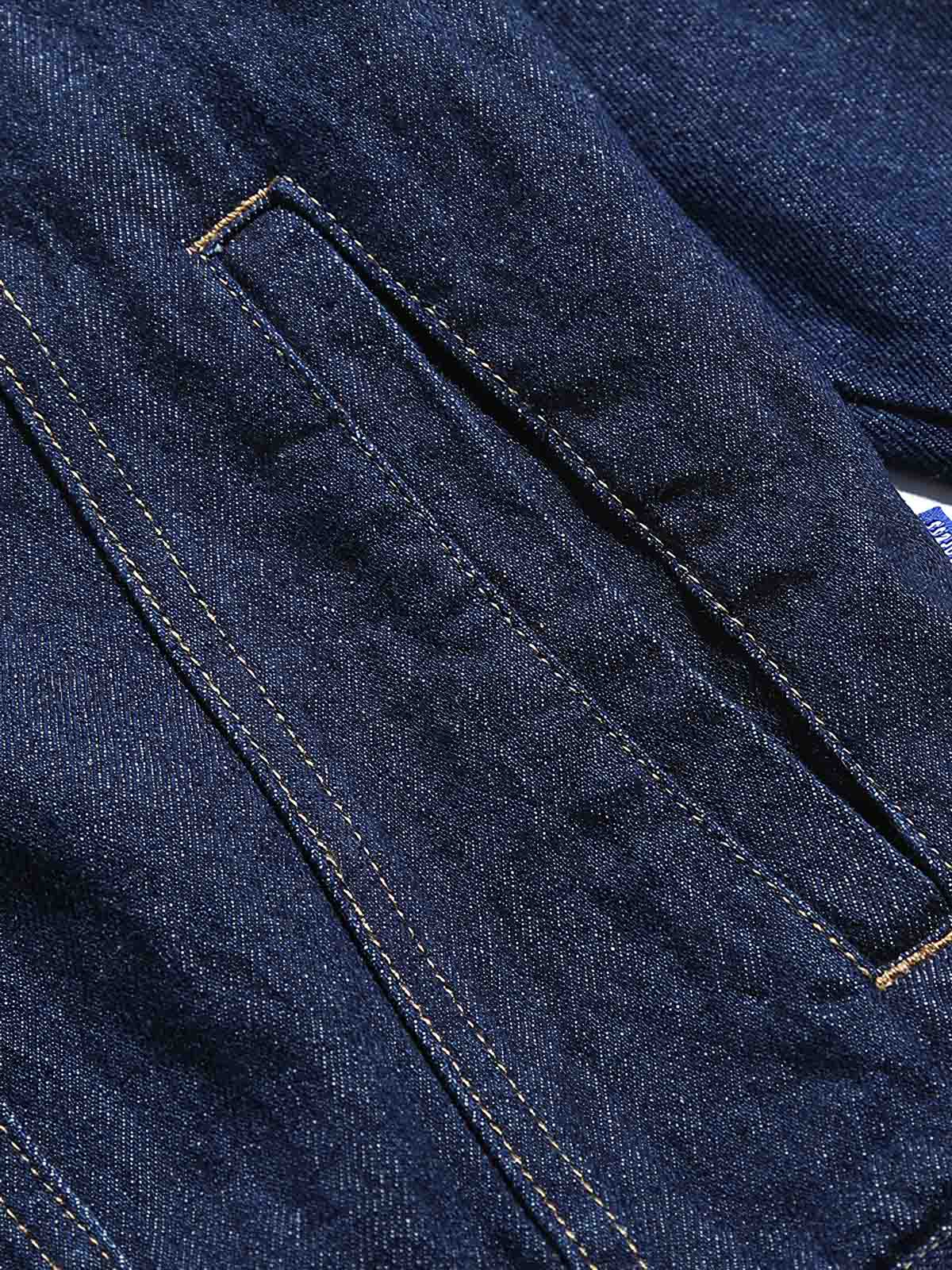 ジャケットは標準的なターンダウンカラーと胸ポケットを採用し、黄色いダブルステッチでレトロ感を加え、ワークウェアの特徴を強調しています。ジャケットのストレートカットは、快適な着心地を保証し、様々な体型の男性に適しています。