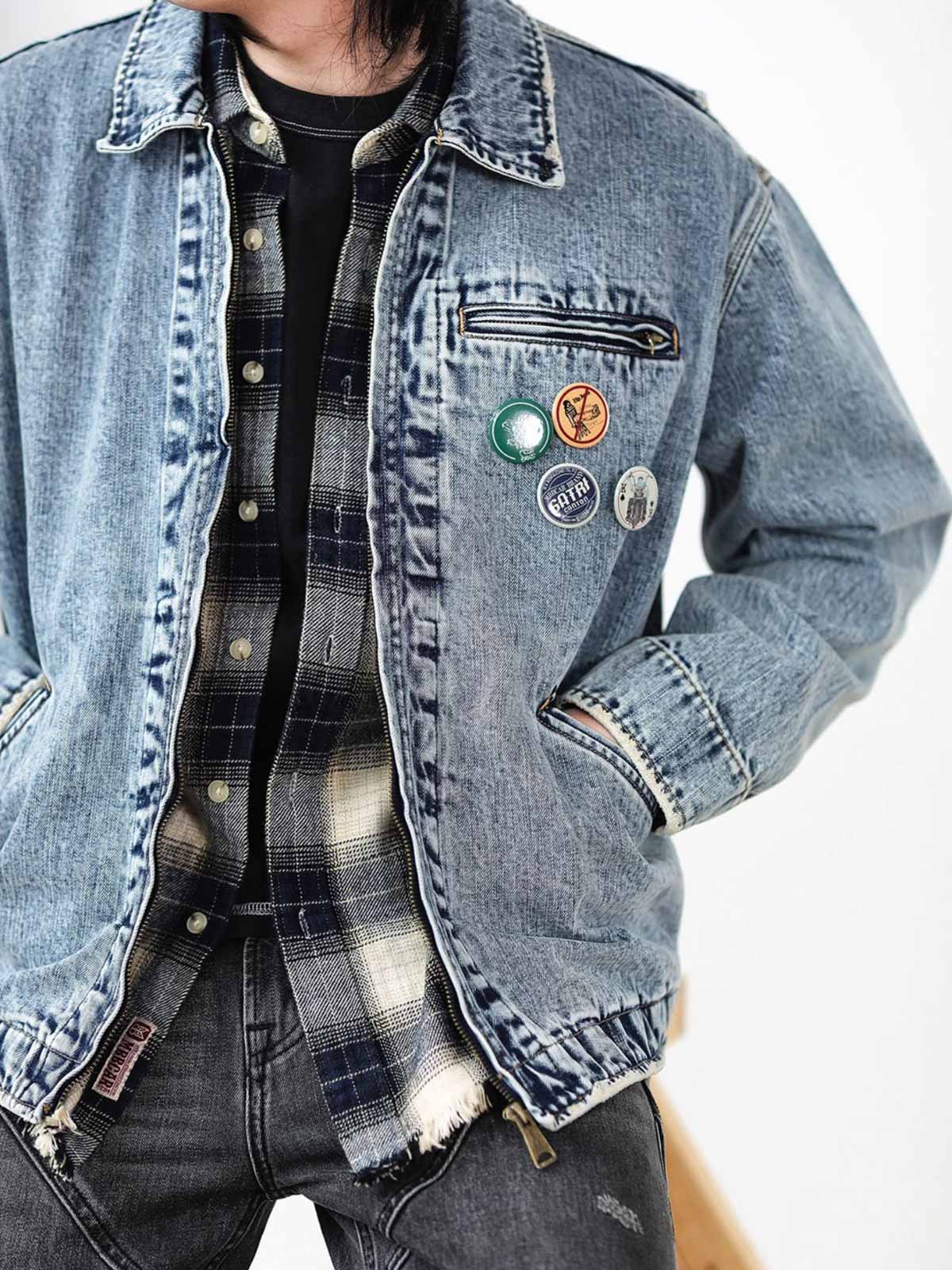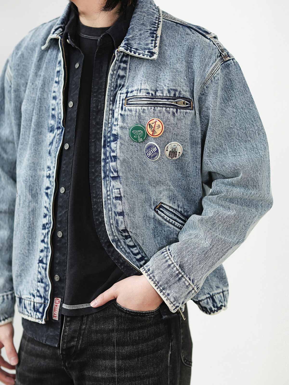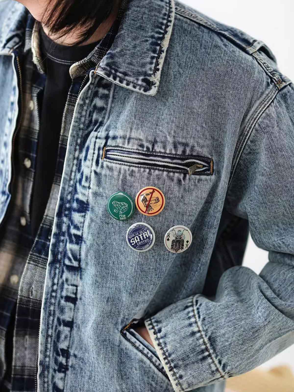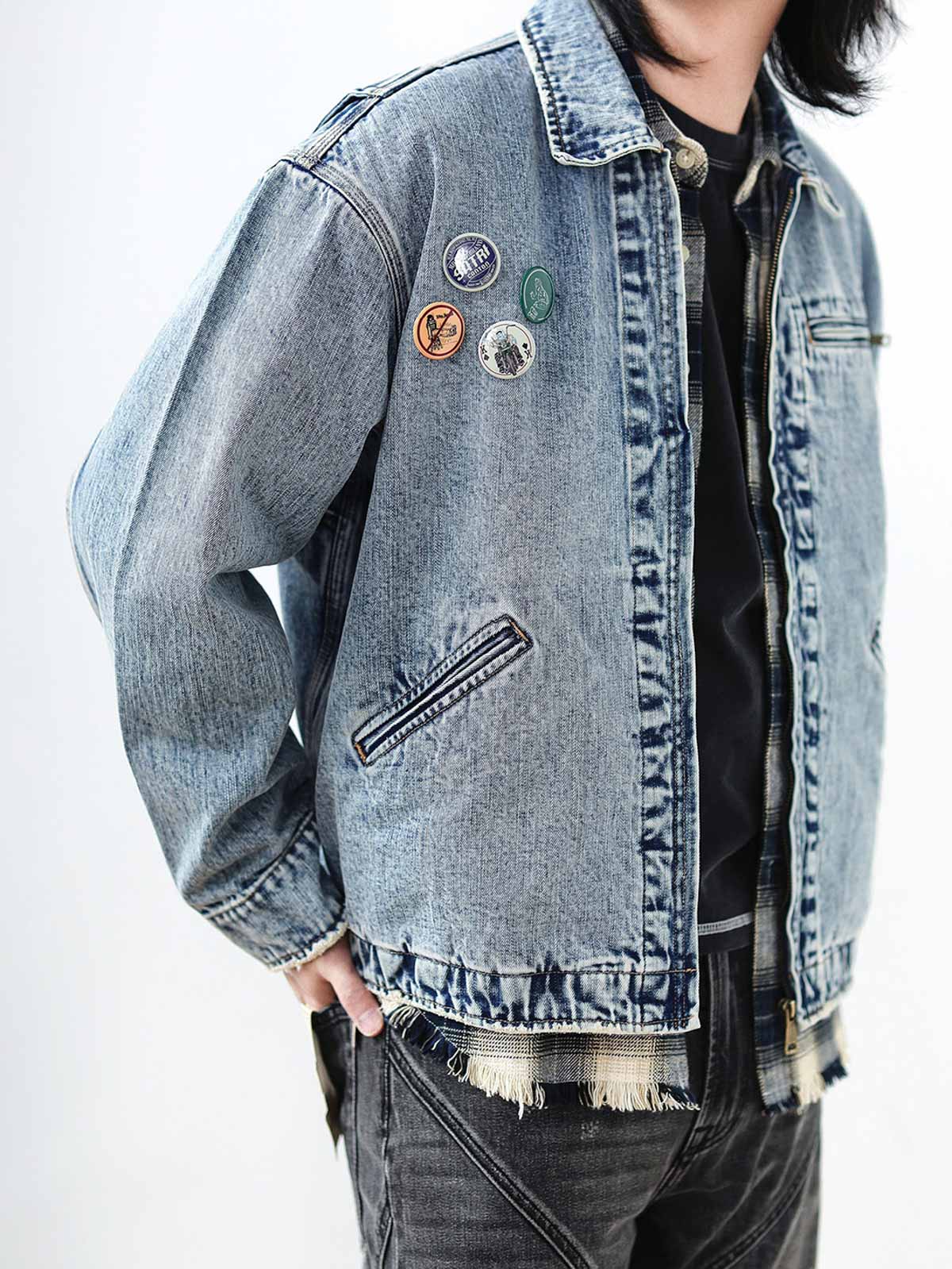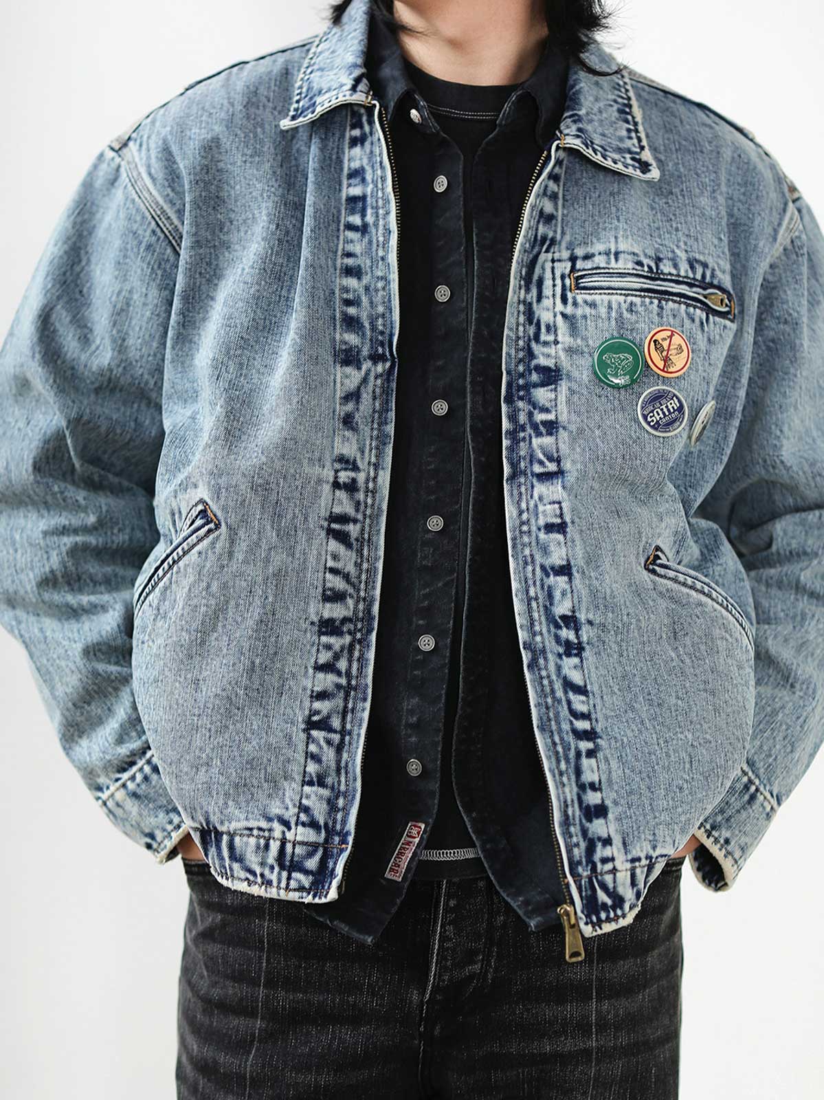 ジャケットの素材はデニムで、耐久性に優れたクラシックな素材です。ウォッシュ加工により、素材はより柔らかく快適になります。フロントのポケット、ボタン、縫製のディテールは、ヴィンテージワークウェアのスタイルを反映しています。胸元の小さなポケットとバッジは、個性とファッション性を加えています。
