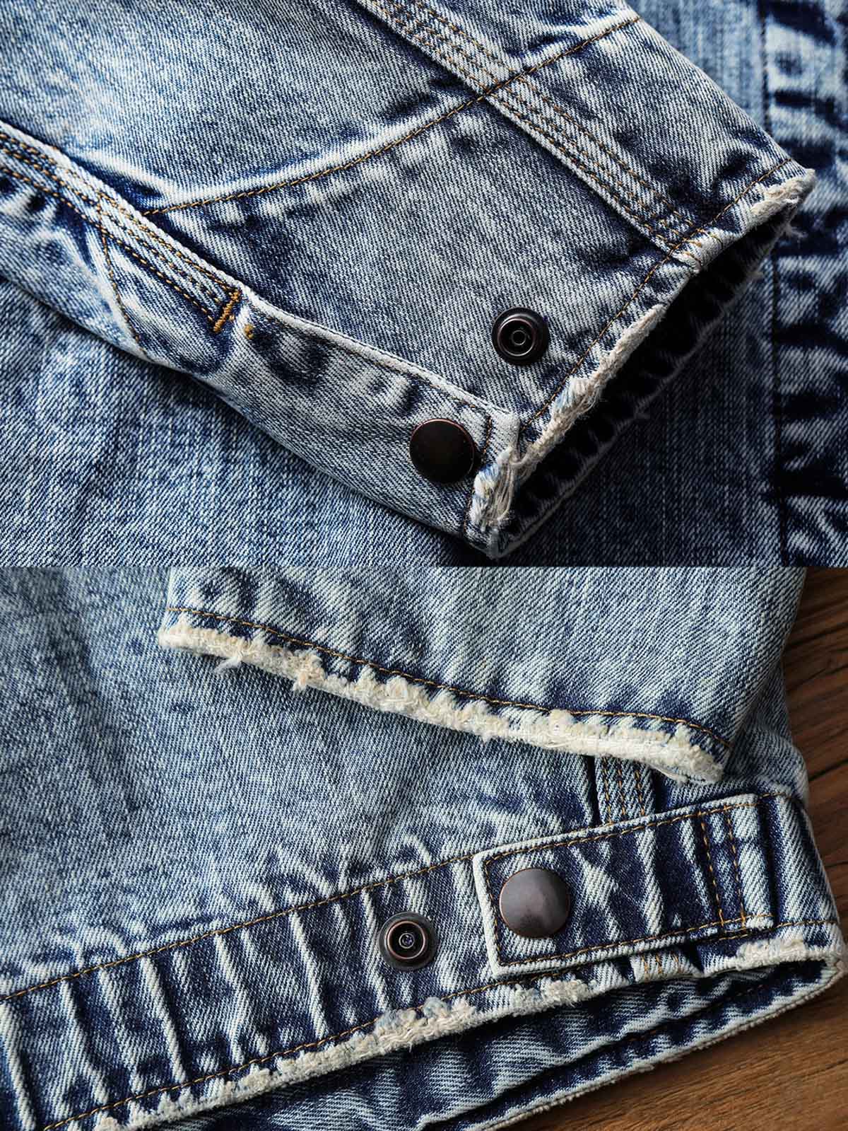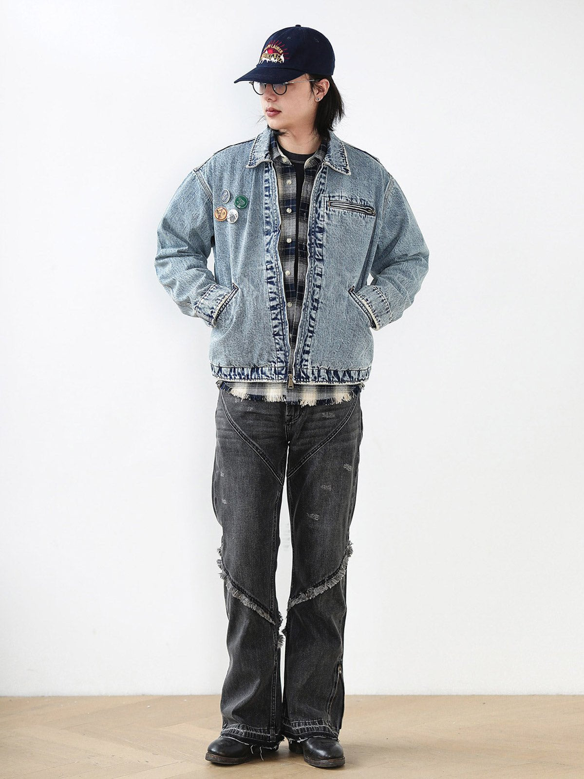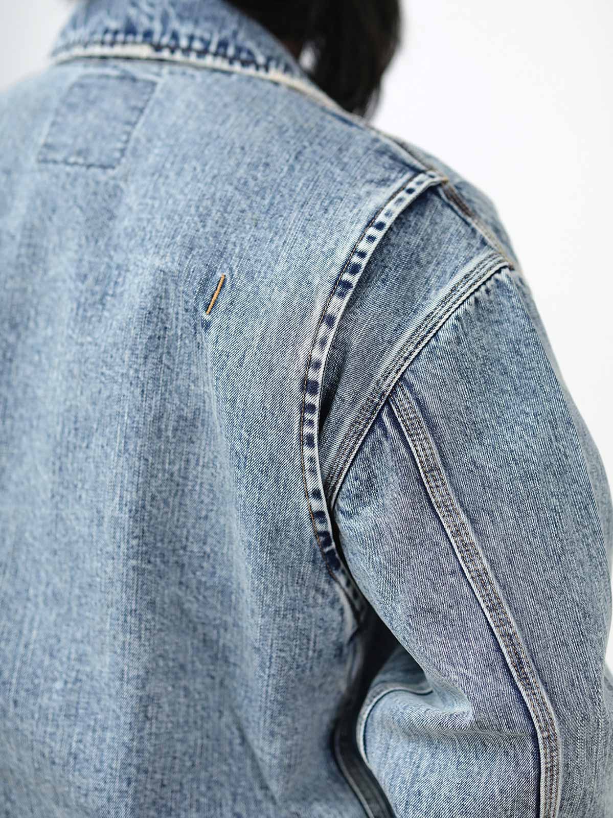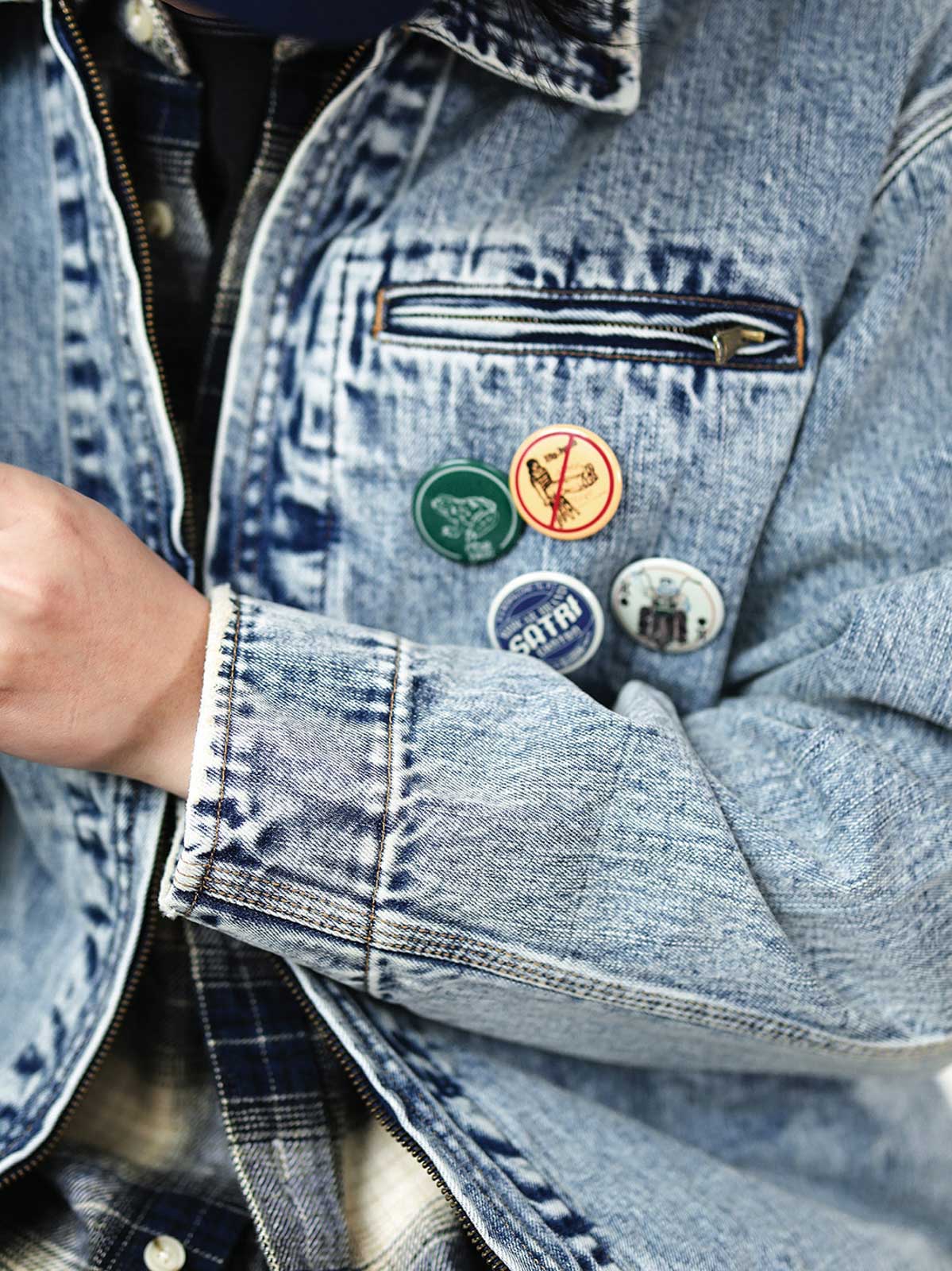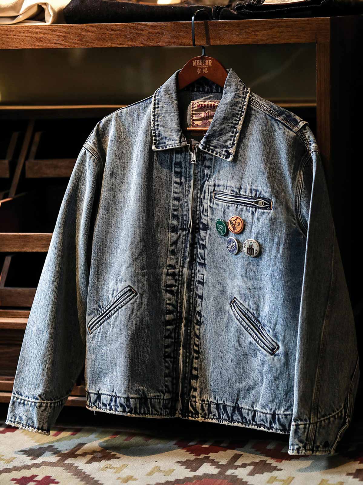 ジャケットの素材はデニムで、耐久性に優れたクラシックな素材です。ウォッシュ加工により、素材はより柔らかく快適になります。フロントのポケット、ボタン、縫製のディテールは、ヴィンテージワークウェアのスタイルを反映しています。胸元の小さなポケットとバッジは、個性とファッション性を加えています。