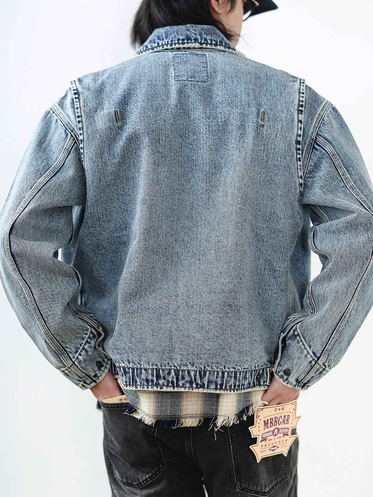 このデニムジャケットは、アメリカ・デトロイトの産業精神に触発されたもので、ヴィンテージの要素と実用的な現代の服装を融合させています。J97というモデル名は、特定の歴史的なスタイルや時代を象徴しており、古着のトレンドを反映しています。ウォッシュ加工により、それぞれのジャケットにユニークな質感と色合いが与えられています。ヘビーデューティーな仕上げは、細かな縫製と耐久性のある構造に反映されており、20世紀のデニムウェアにおいて人気があり、アメリカのワークウェア文化の重要な一部を形成しています。
