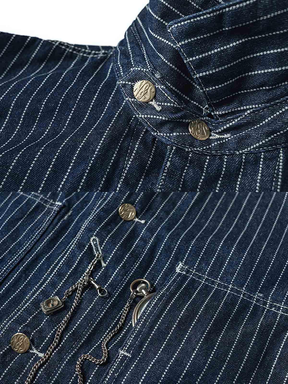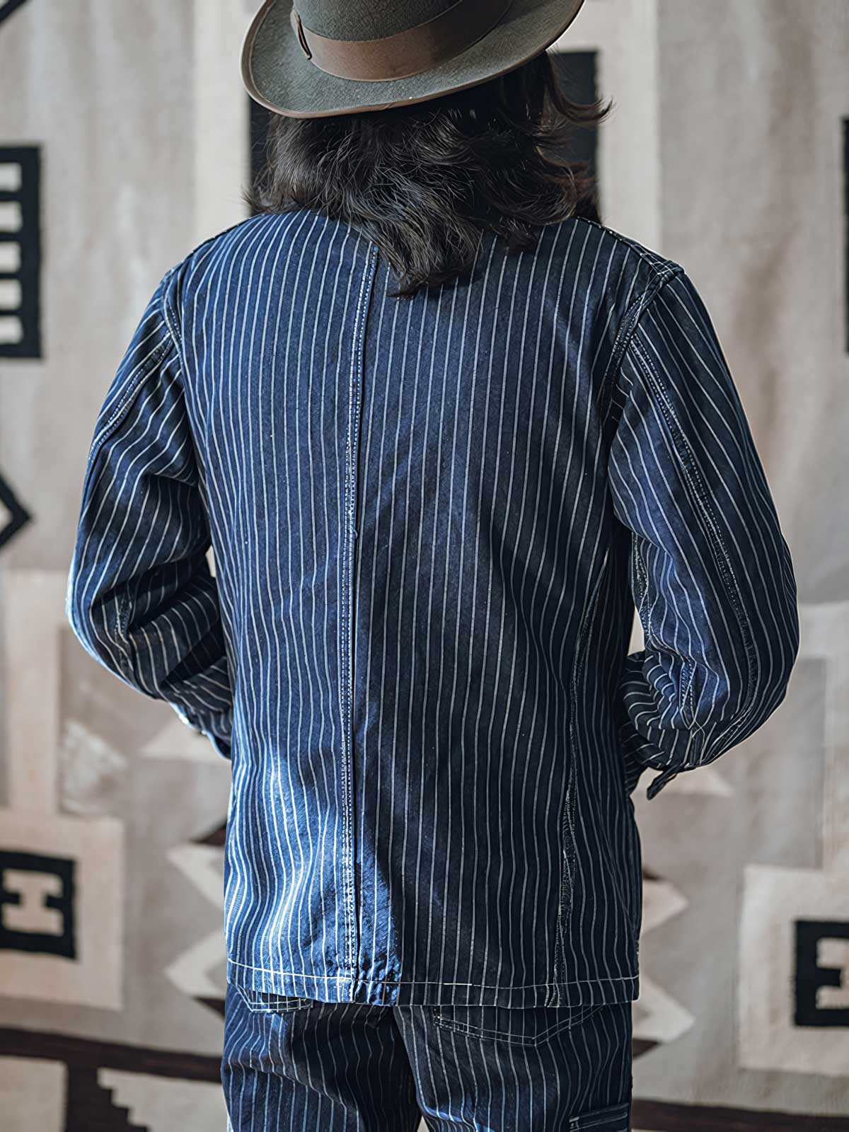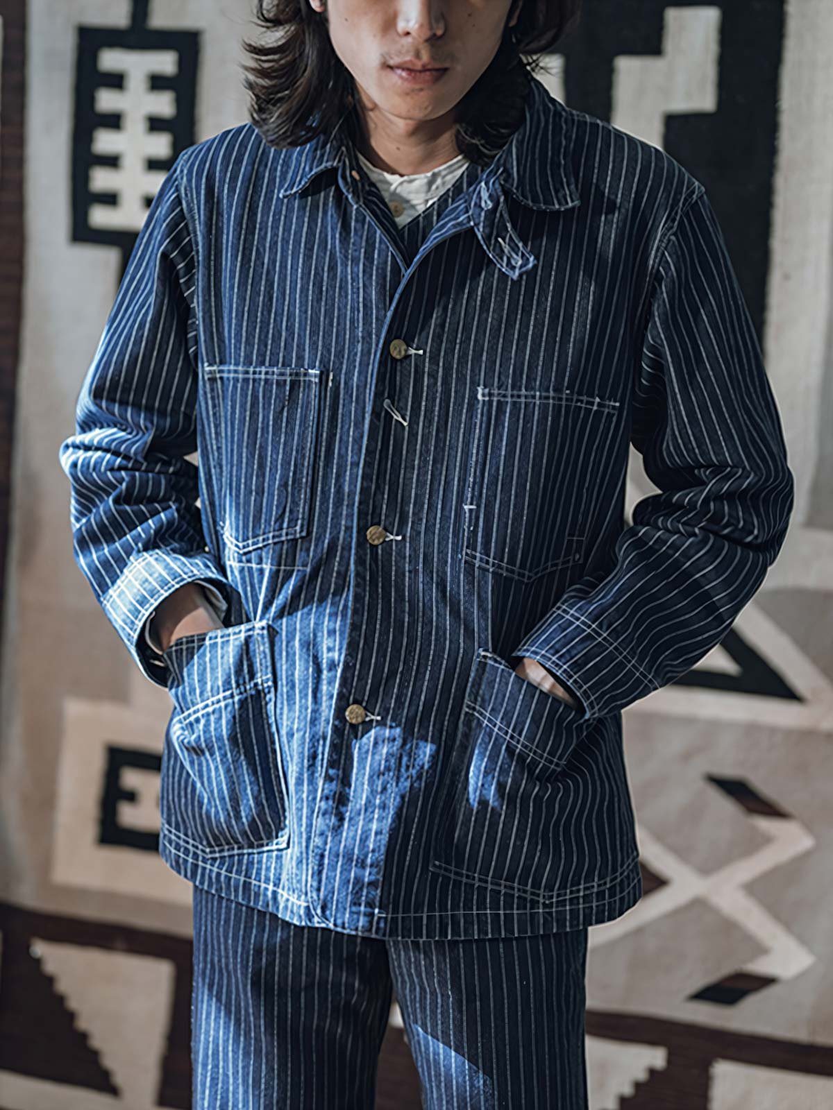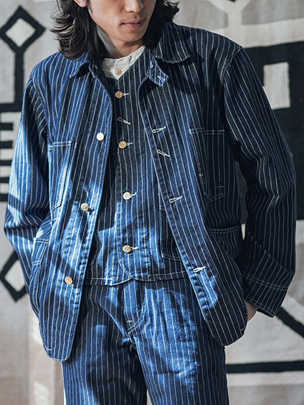 1930年代のヴィンテージスタイルにインスパイアされたこのウォバッシュストライプのワークジャケットは、Aラインのシルエットとインディゴ染めが特徴です。ワークウェアのクラシックなディテールを持ちつつ、繊細なデザインが現代的な感覚をプラスしています。
