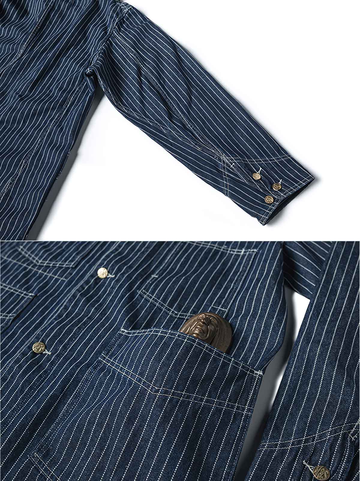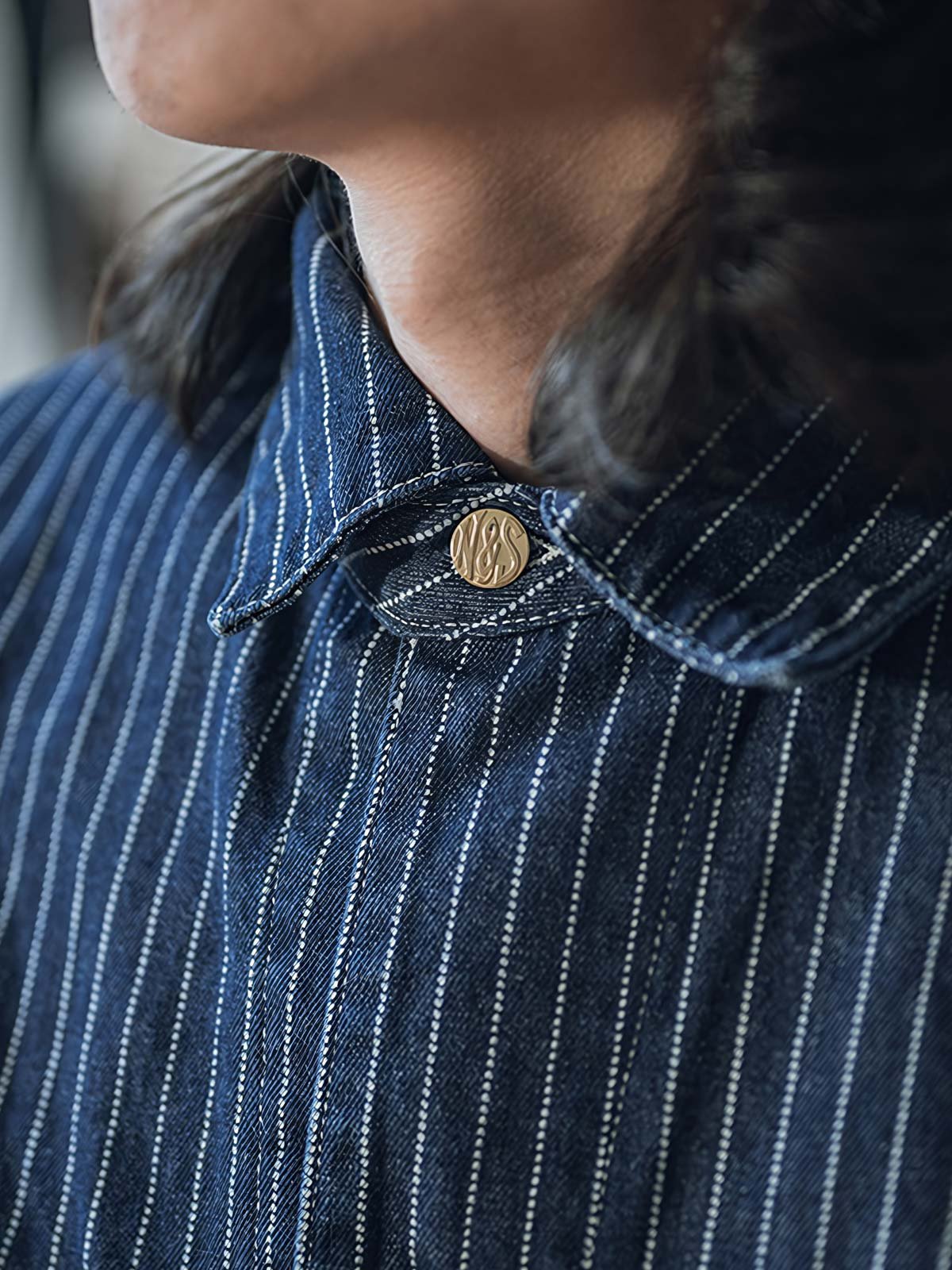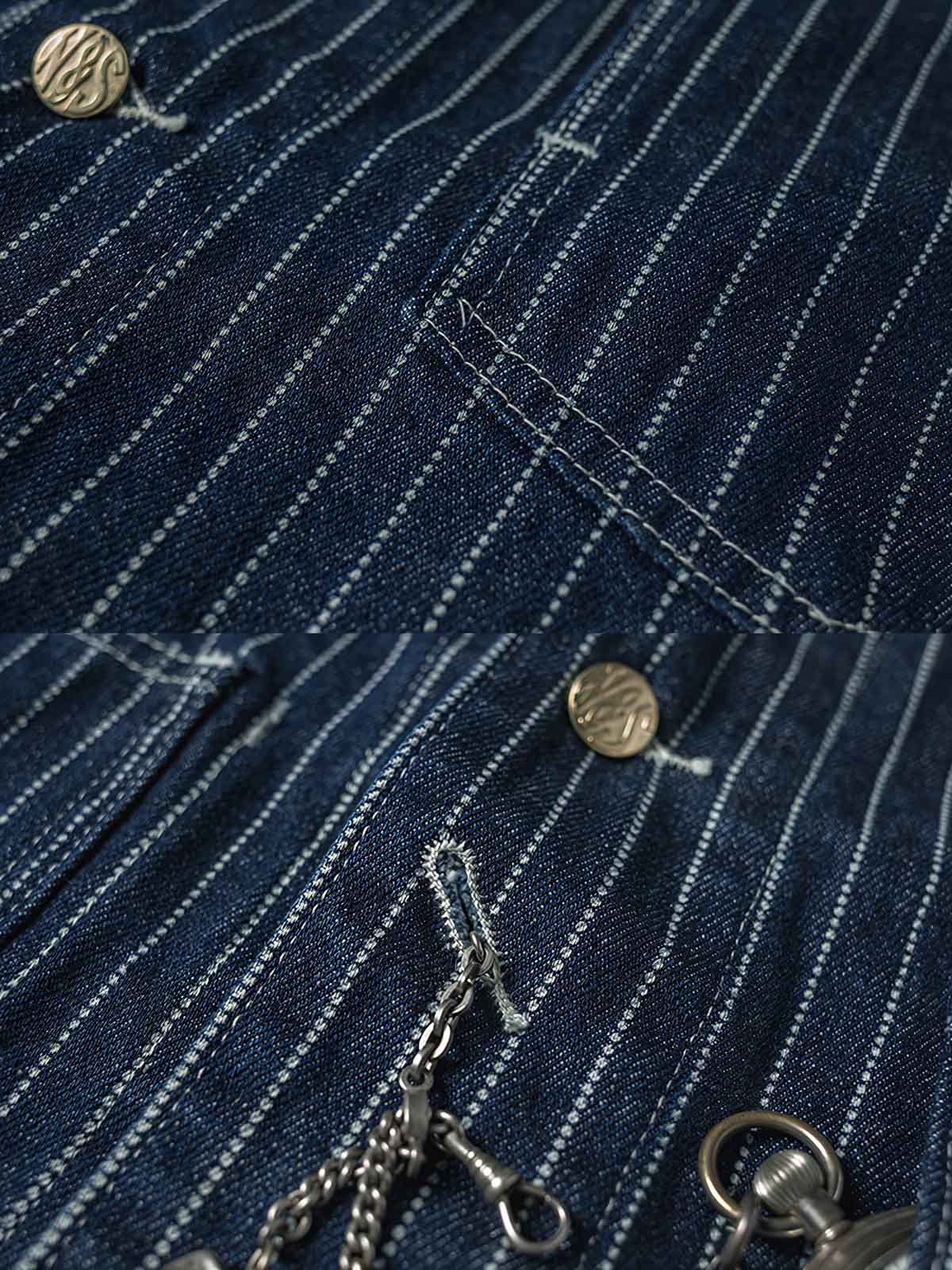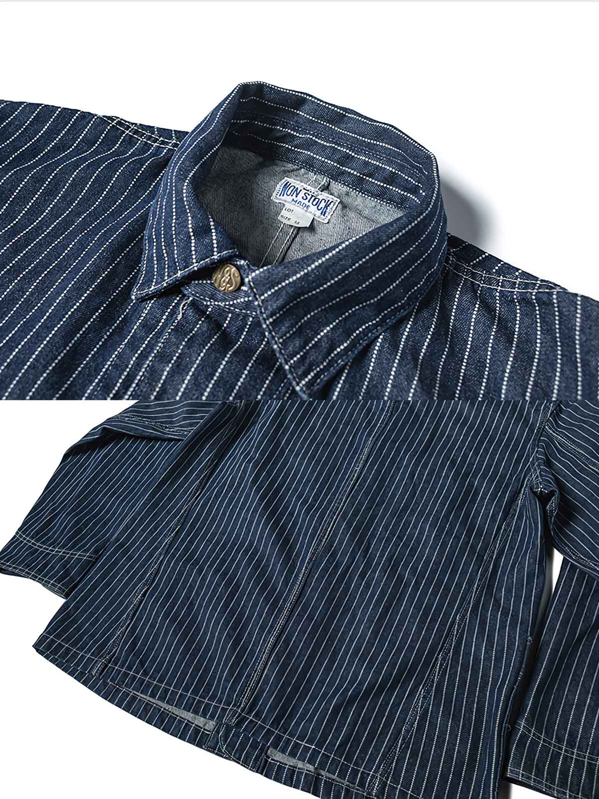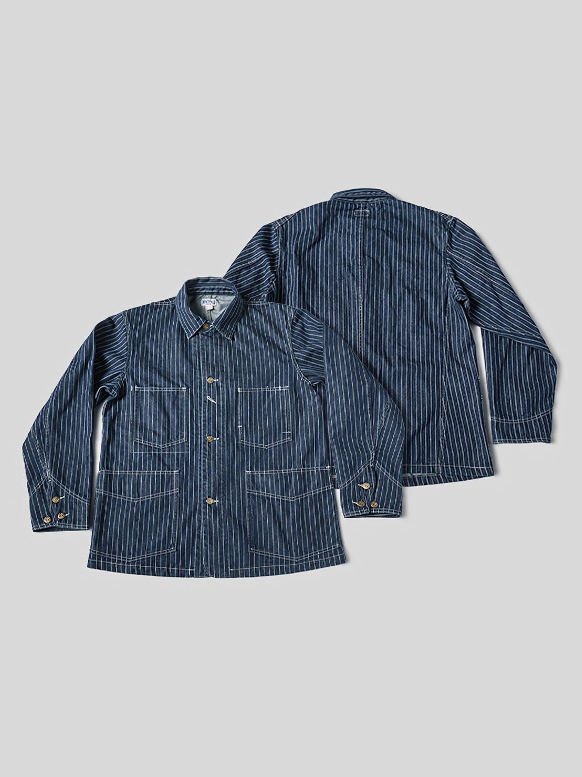 1930年代のヴィンテージスタイルにインスパイアされたこのウォバッシュストライプのワークジャケットは、Aラインのシルエットとインディゴ染めが特徴です。ワークウェアのクラシックなディテールを持ちつつ、繊細なデザインが現代的な感覚をプラスしています。