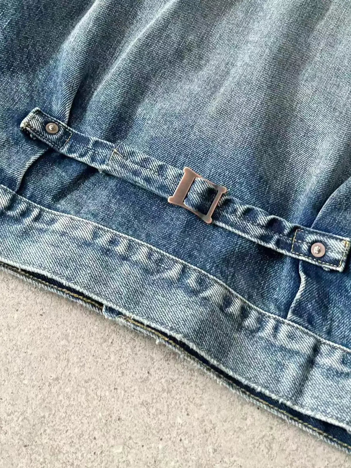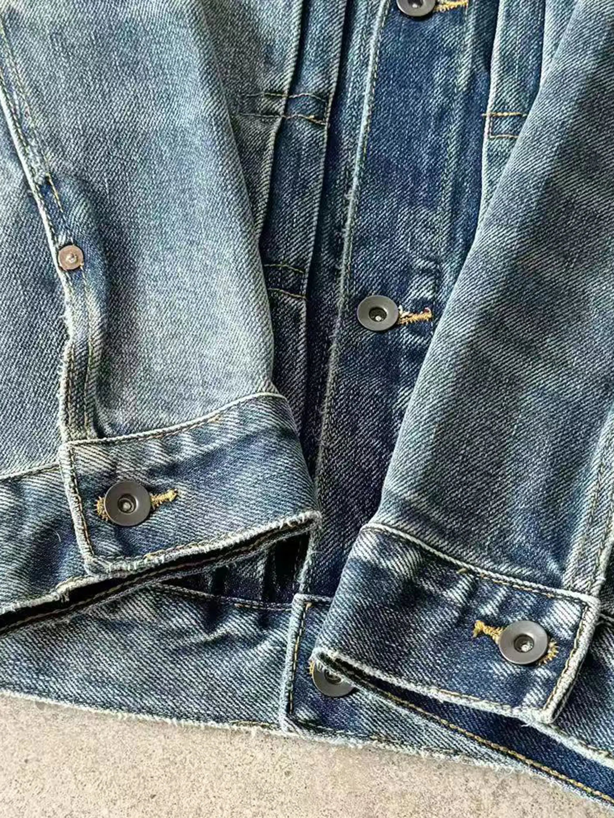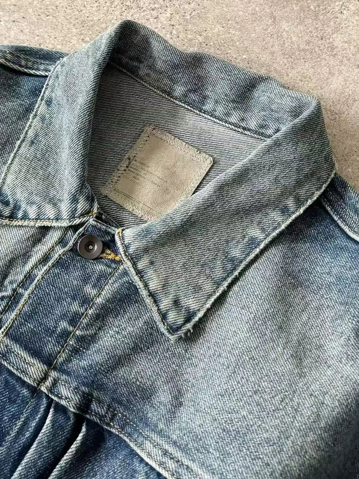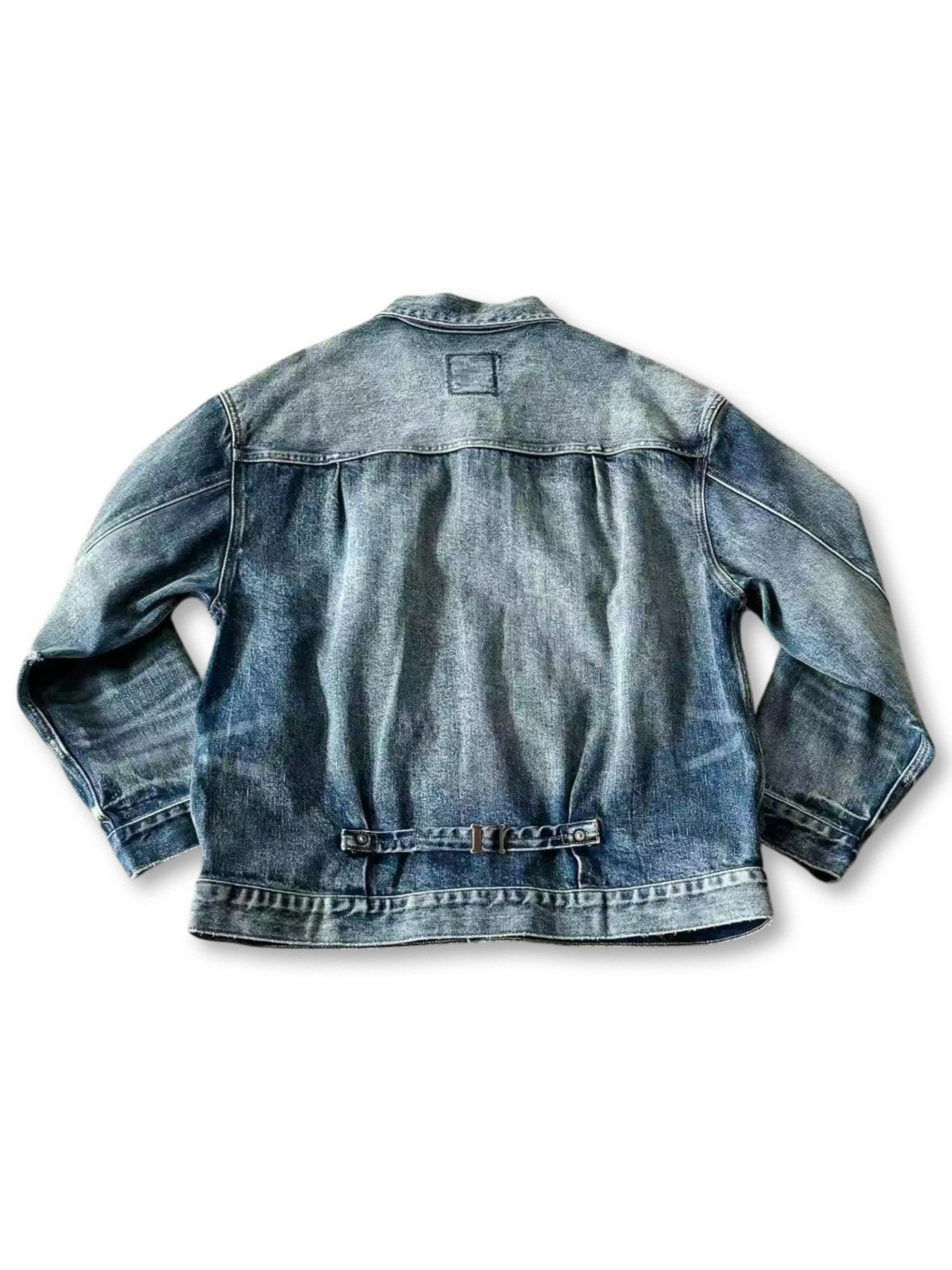 クラシックなヴィンテージスタイルのウォッシュ加工デニムジャケット。モダンなシルエットとレトロな風合いを兼ね備えた一着。