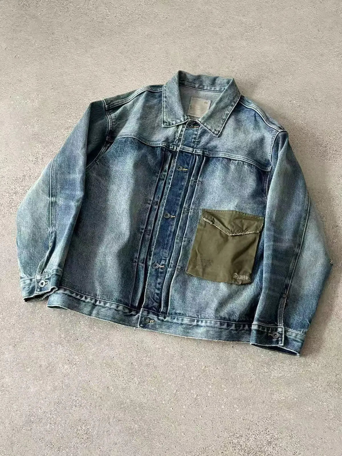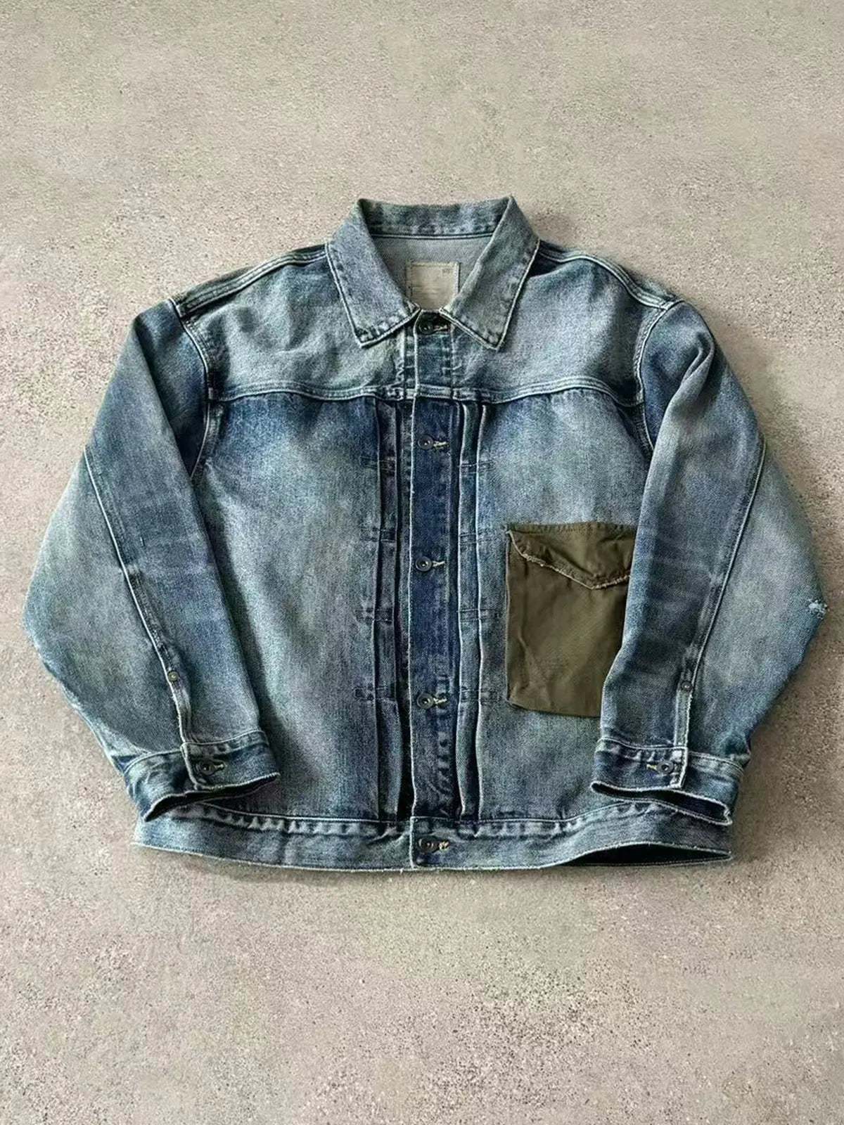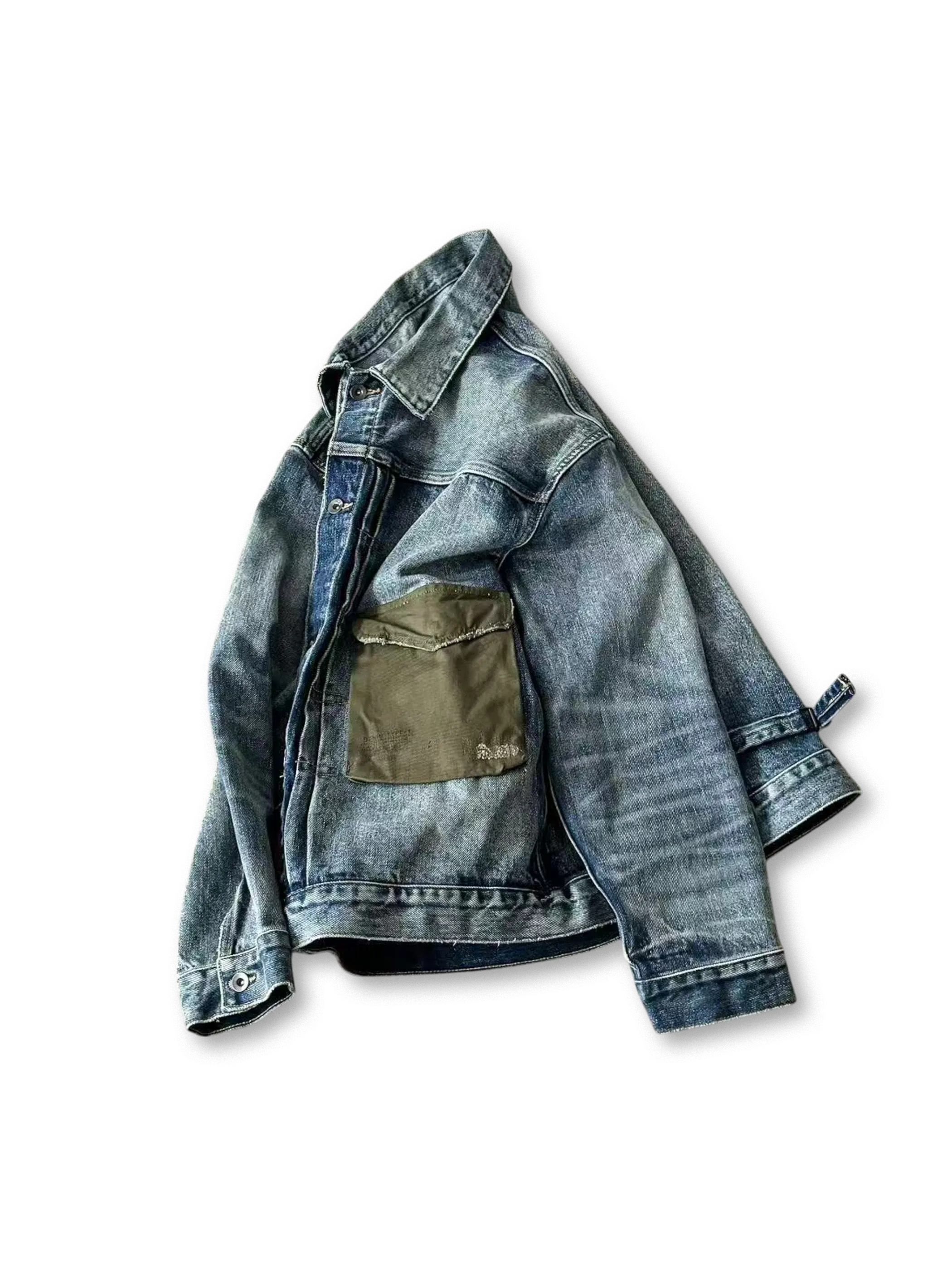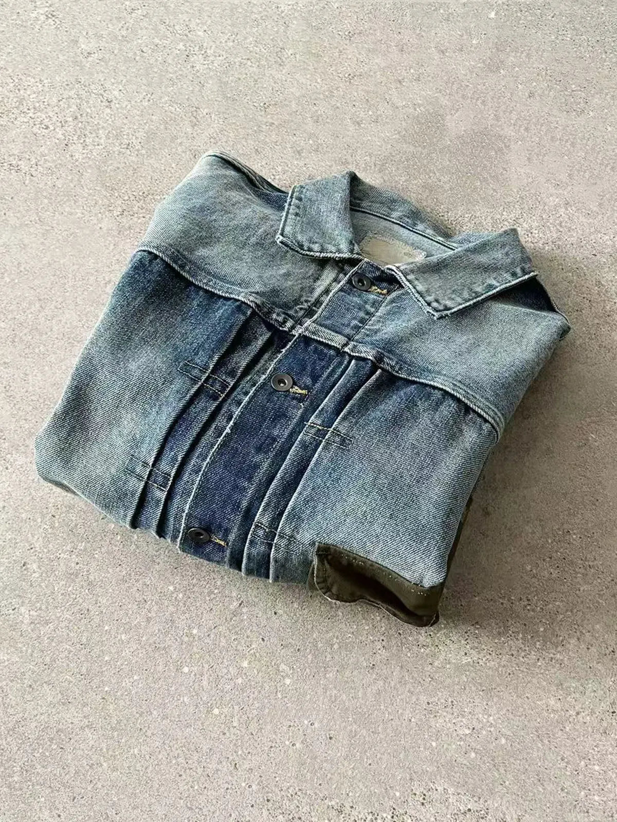 クラシックなヴィンテージスタイルのウォッシュ加工デニムジャケット。モダンなシルエットとレトロな風合いを兼ね備えた一着。