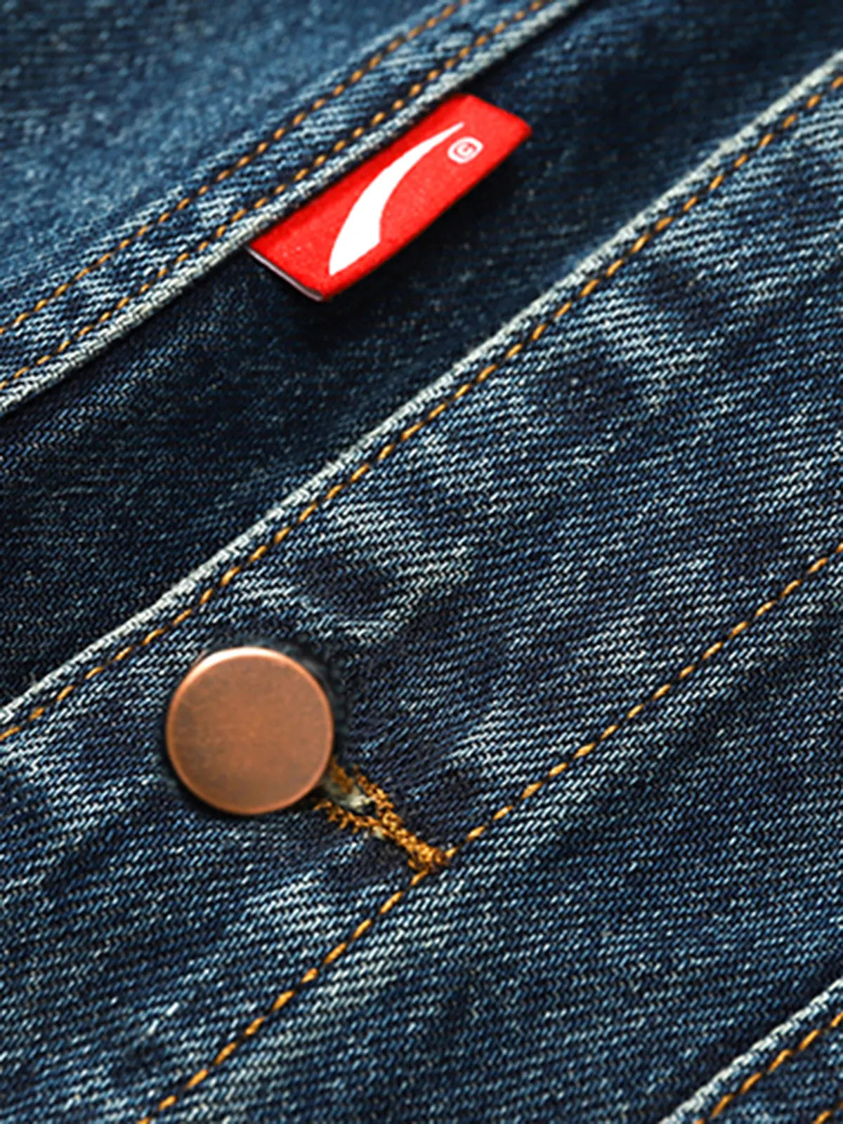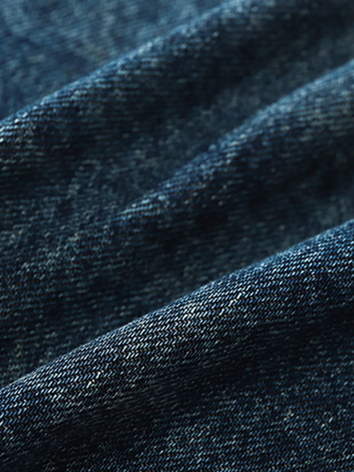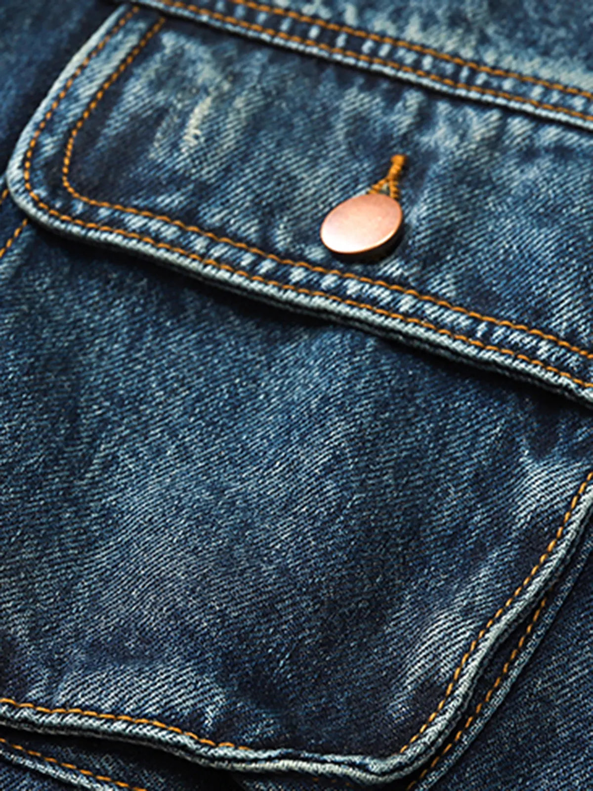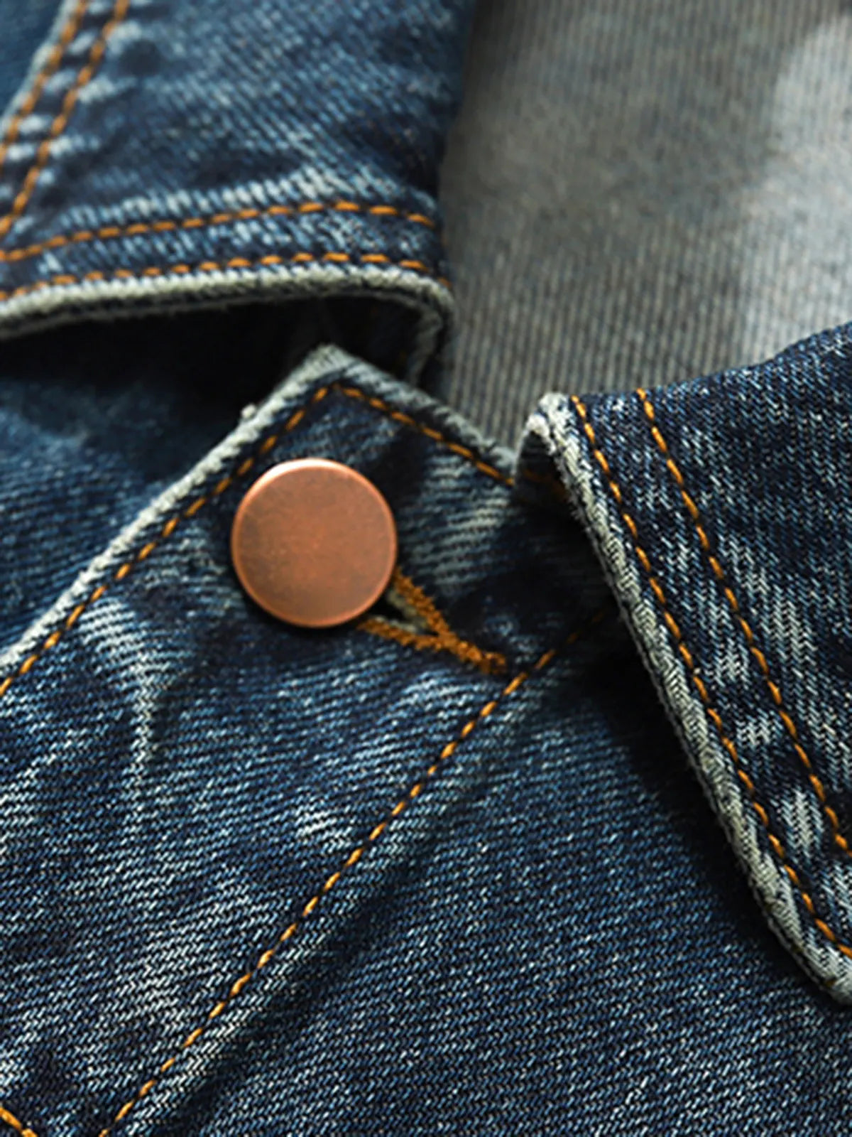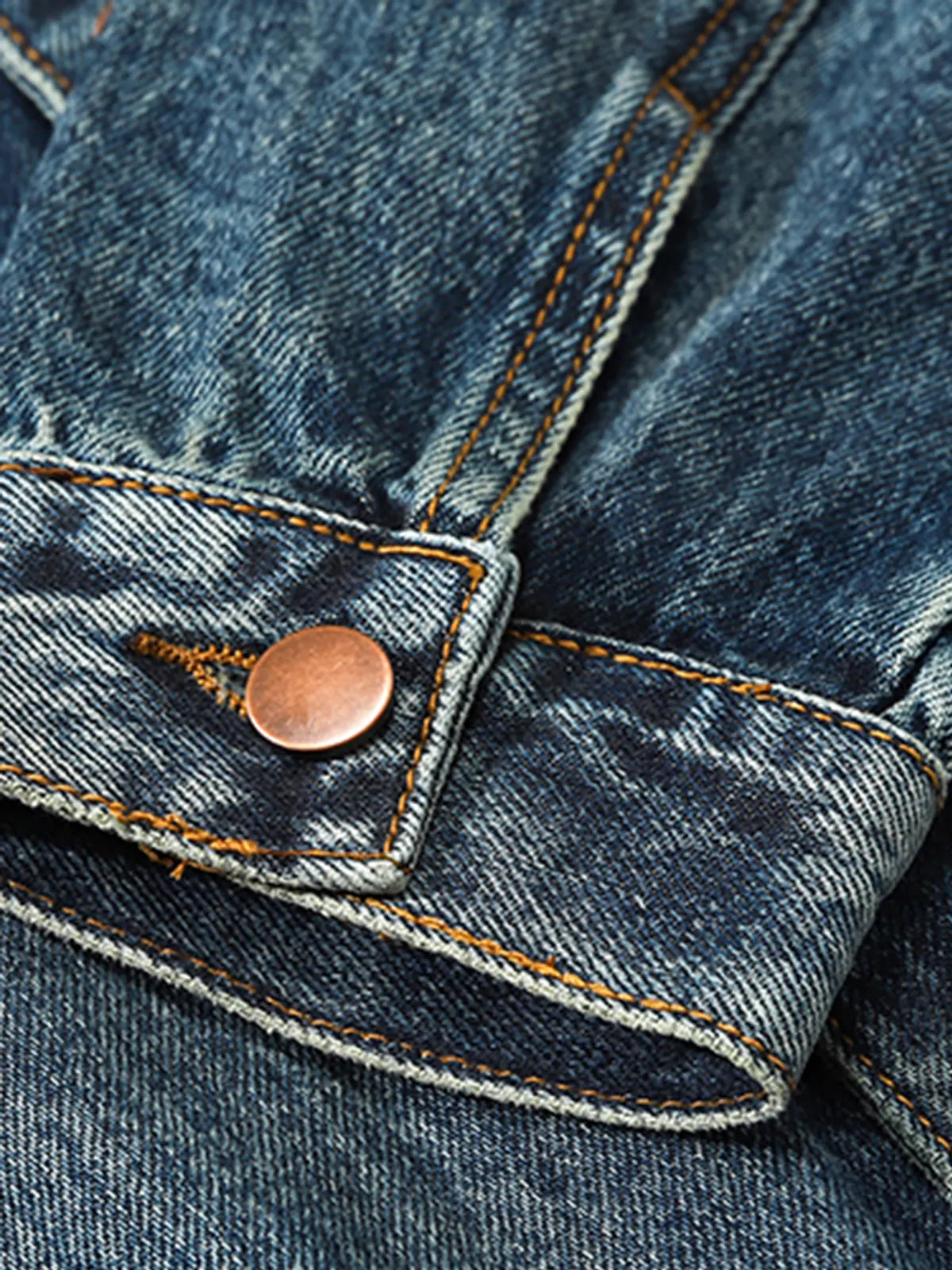 ウォッシュ加工と金属ボタンが魅力のヴィンテージデニムジャケットは、都会の通勤にも休日のカジュアルシーンにも最適な実用性とスタイルを兼ね備えています。