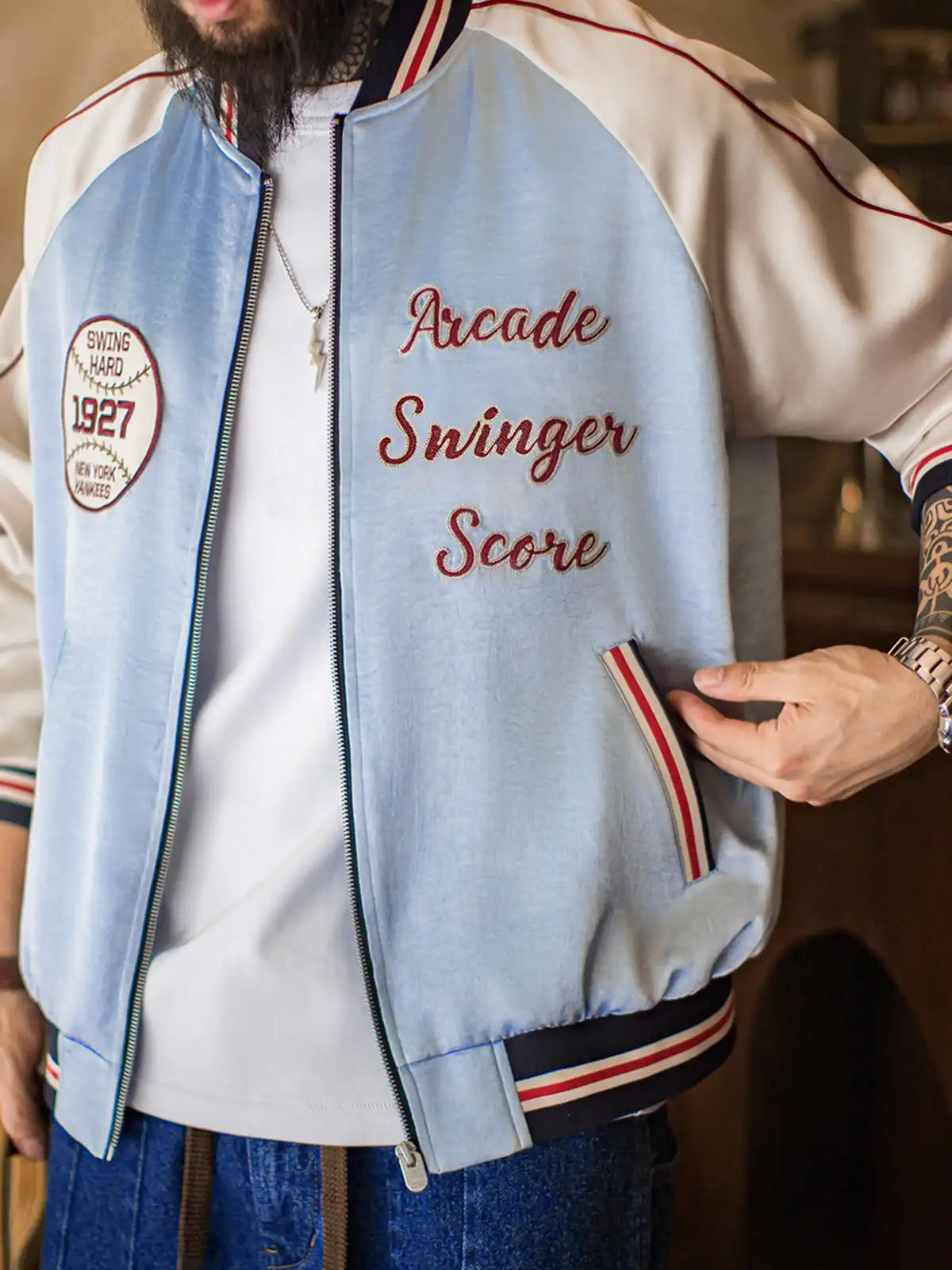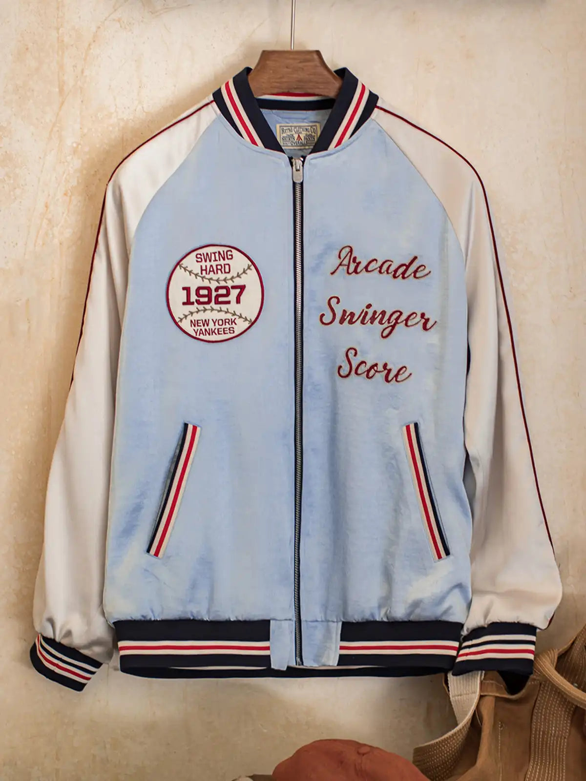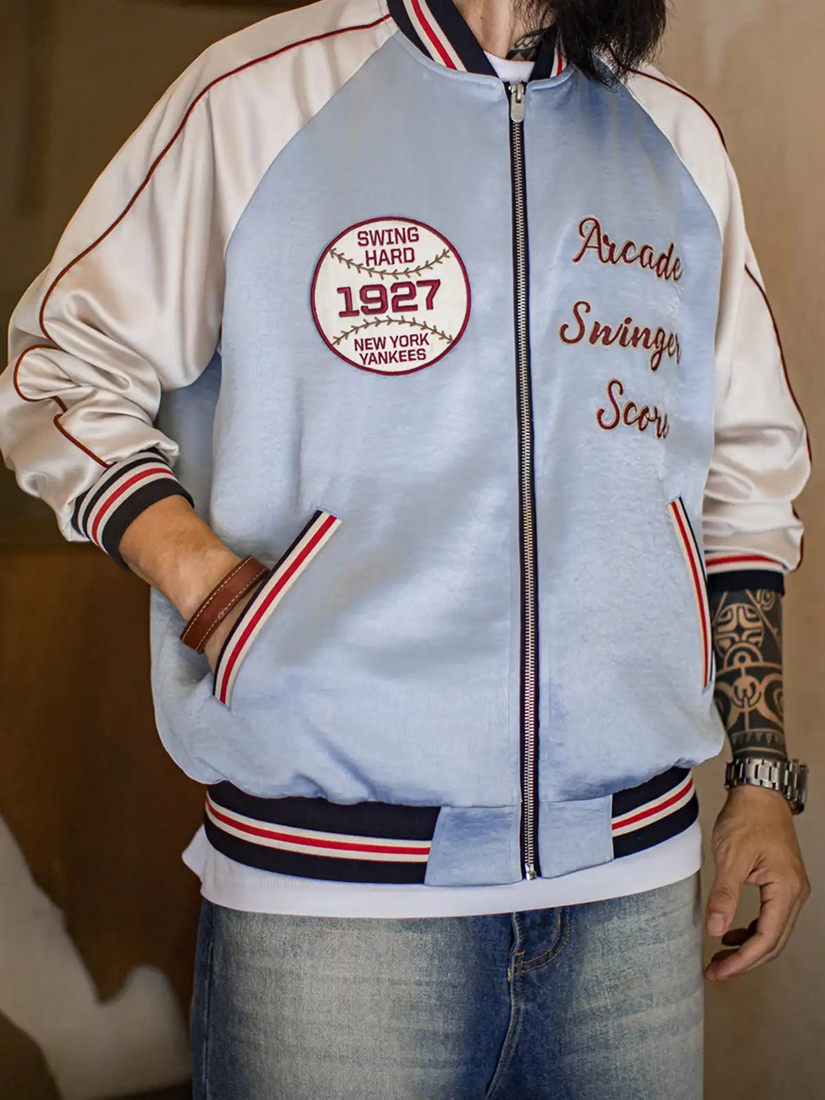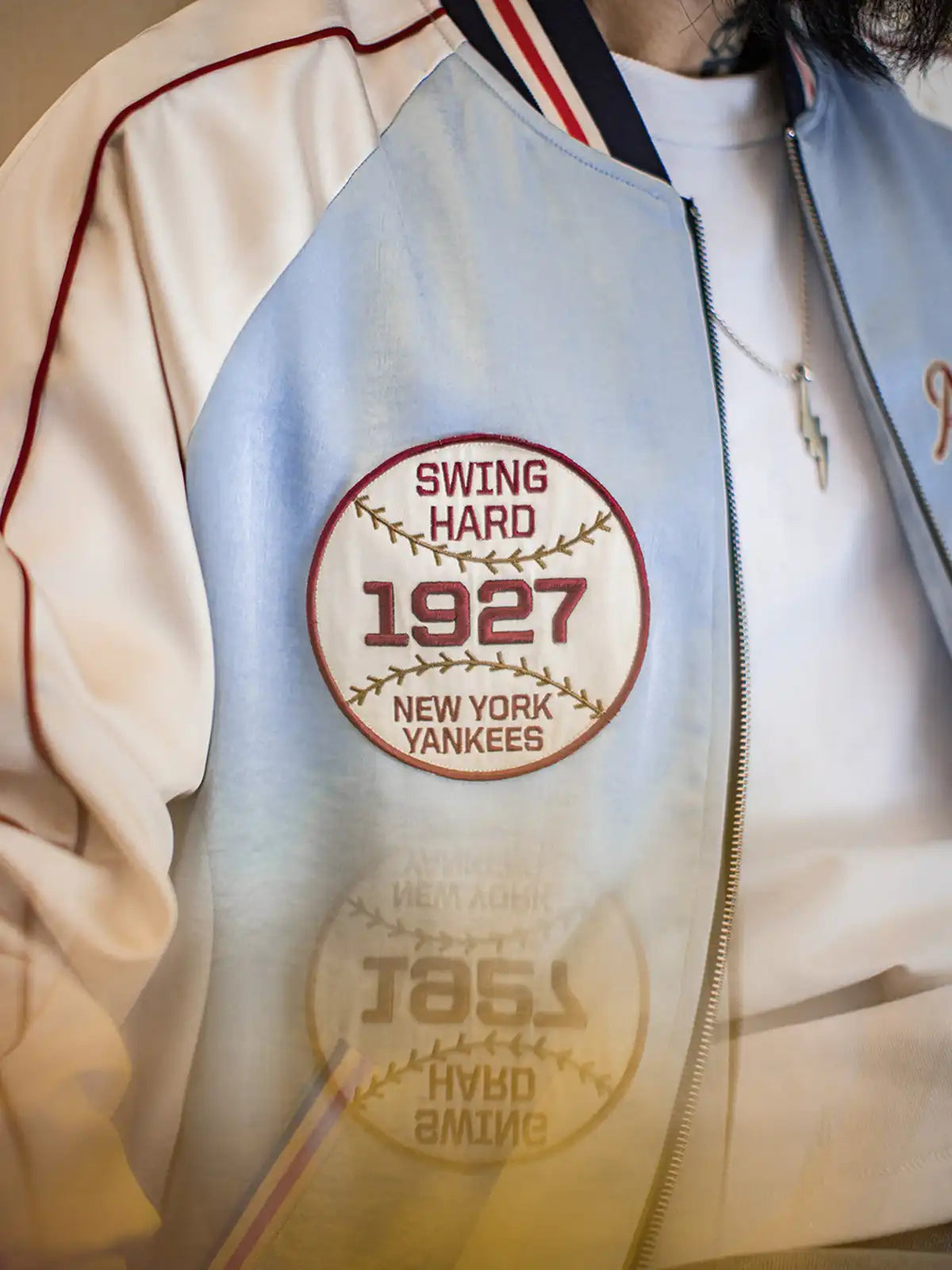 210g/m²の光沢あるアセテートサテンを使用。淡い湖水色のボディに白ラグランスリーブ、1927年ヤンキース刺繍章、赤白の鎖刺繍ロゴを配し、スポーツ精神を表現。シルクのような滑らかな肌触りで高級感とヴィンテージ感を両立。白銅製カスタムジッパーが耐久性と光沢を兼ね備え、秋のスタイルに映える一着。