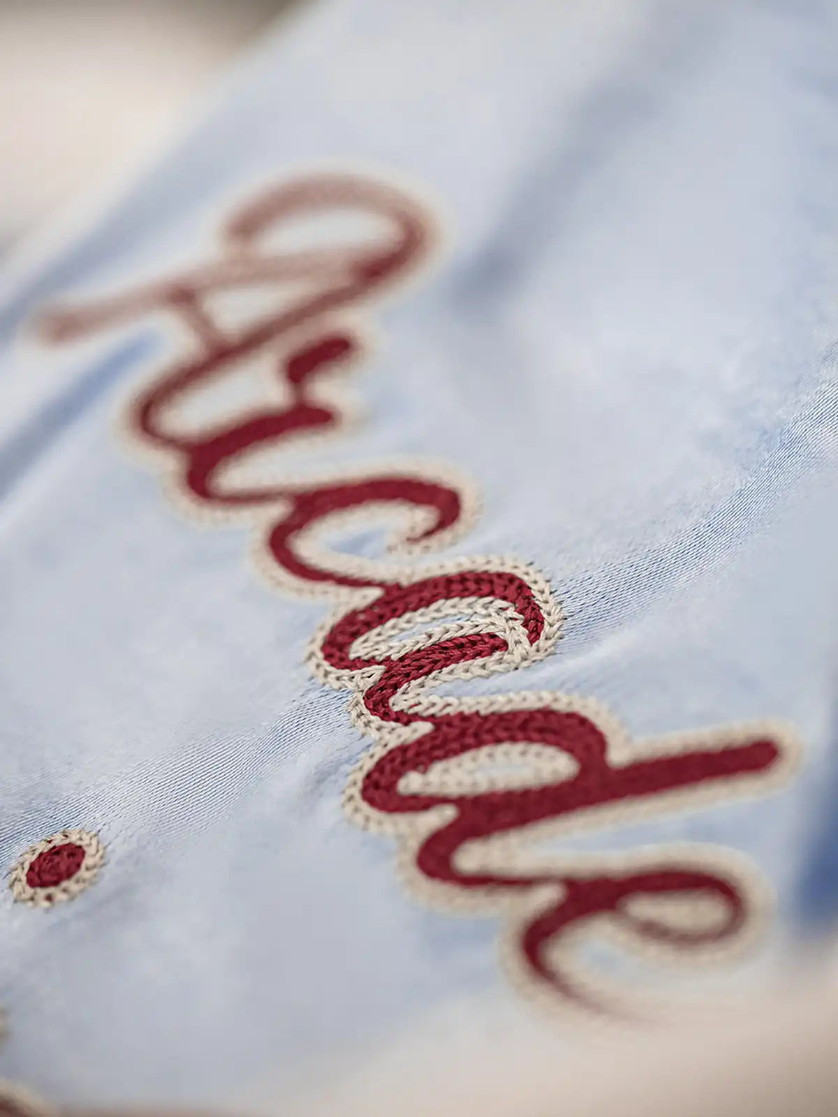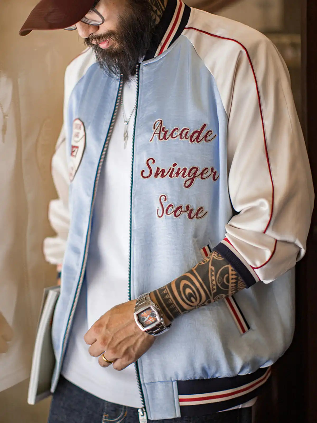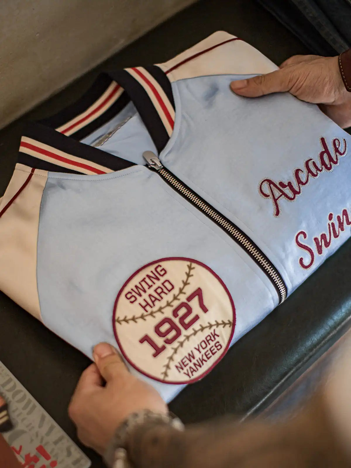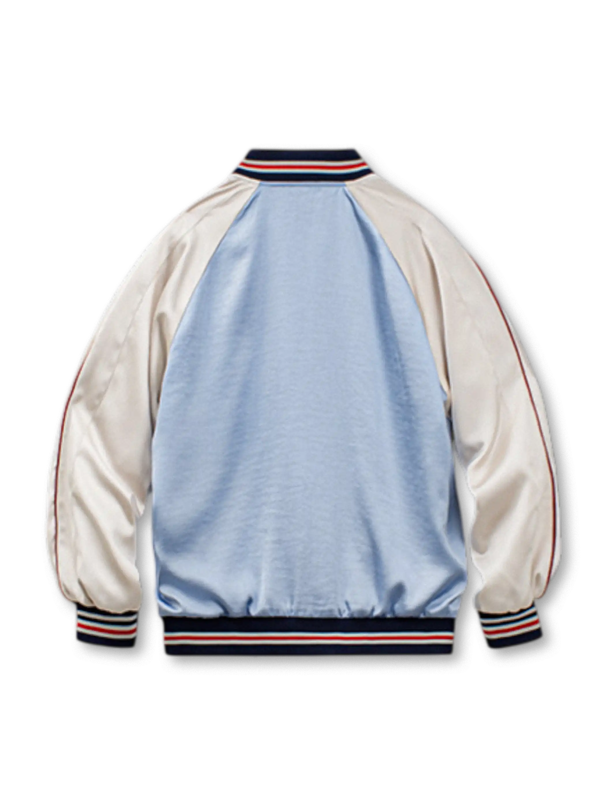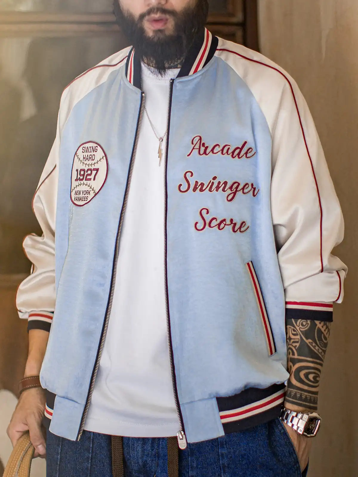 210g/m²の光沢あるアセテートサテンを使用。淡い湖水色のボディに白ラグランスリーブ、1927年ヤンキース刺繍章、赤白の鎖刺繍ロゴを配し、スポーツ精神を表現。シルクのような滑らかな肌触りで高級感とヴィンテージ感を両立。白銅製カスタムジッパーが耐久性と光沢を兼ね備え、秋のスタイルに映える一着。