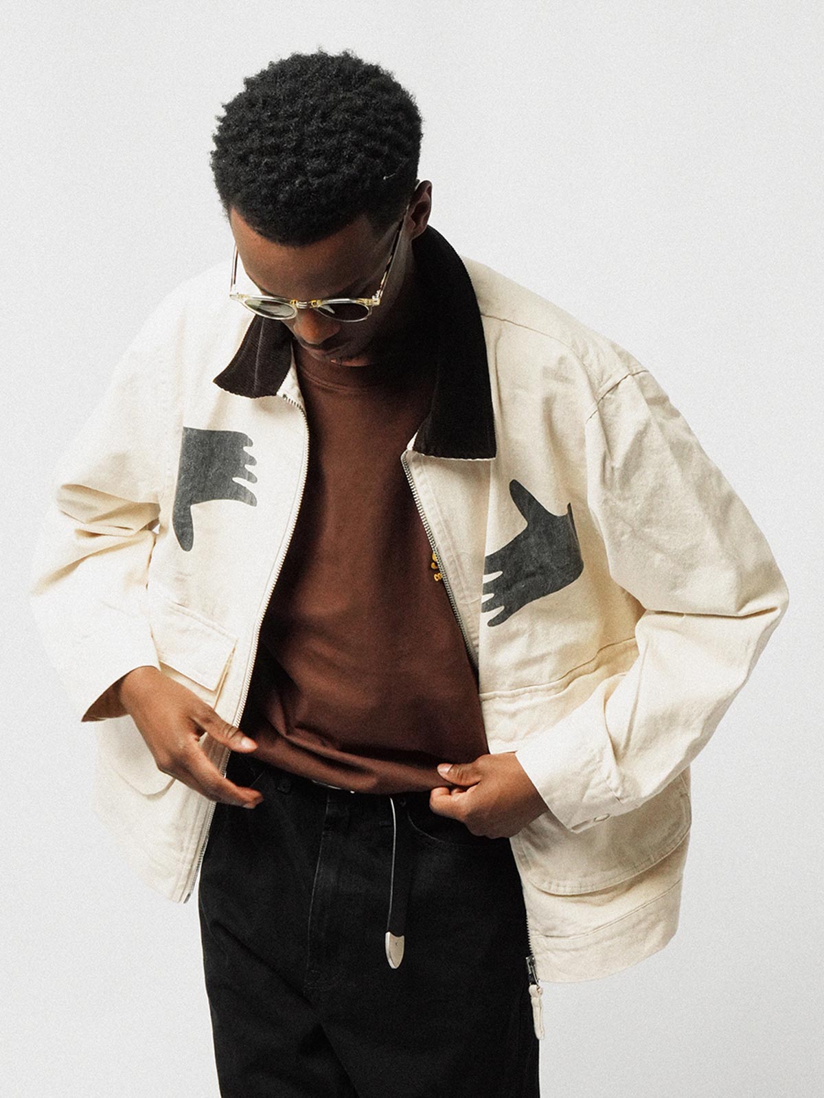 このジャケットは、1970年代のワークウェアジャケットからインスパイアされたデザインで、ルーズなシルエットにナチュラルカラーのコットンツイルキャンバスを使用し、自然なテクスチャーとヴィンテージ感を演出しています。生地には天然のコットンシェルを織り込んだ上で、ウォッシュド加工を施し、より豊かでユニークな質感を実現しました。IDEAL™のマットシルバーメタルジッパーとYKK™のスナップボタンがディテールの質感を高めています。胸の「ハンドグラフィック」デザインがアクセントとなり、クラシックなワークウェアスタイルにモダンな都市感覚を加え、着用者に友善で開放的な印象を与えます。このデザインは特に、カジュアルやストリートファッションのシーンにおいて、その独自の存在感を発揮します。