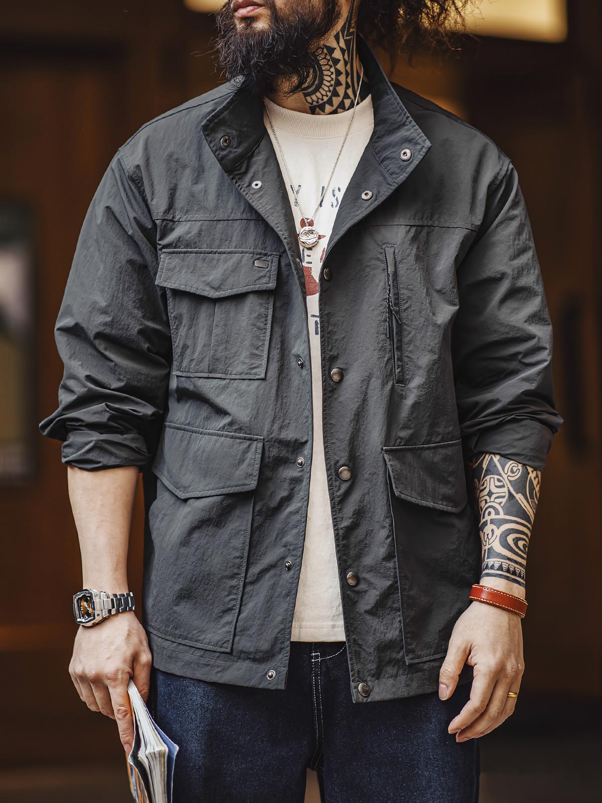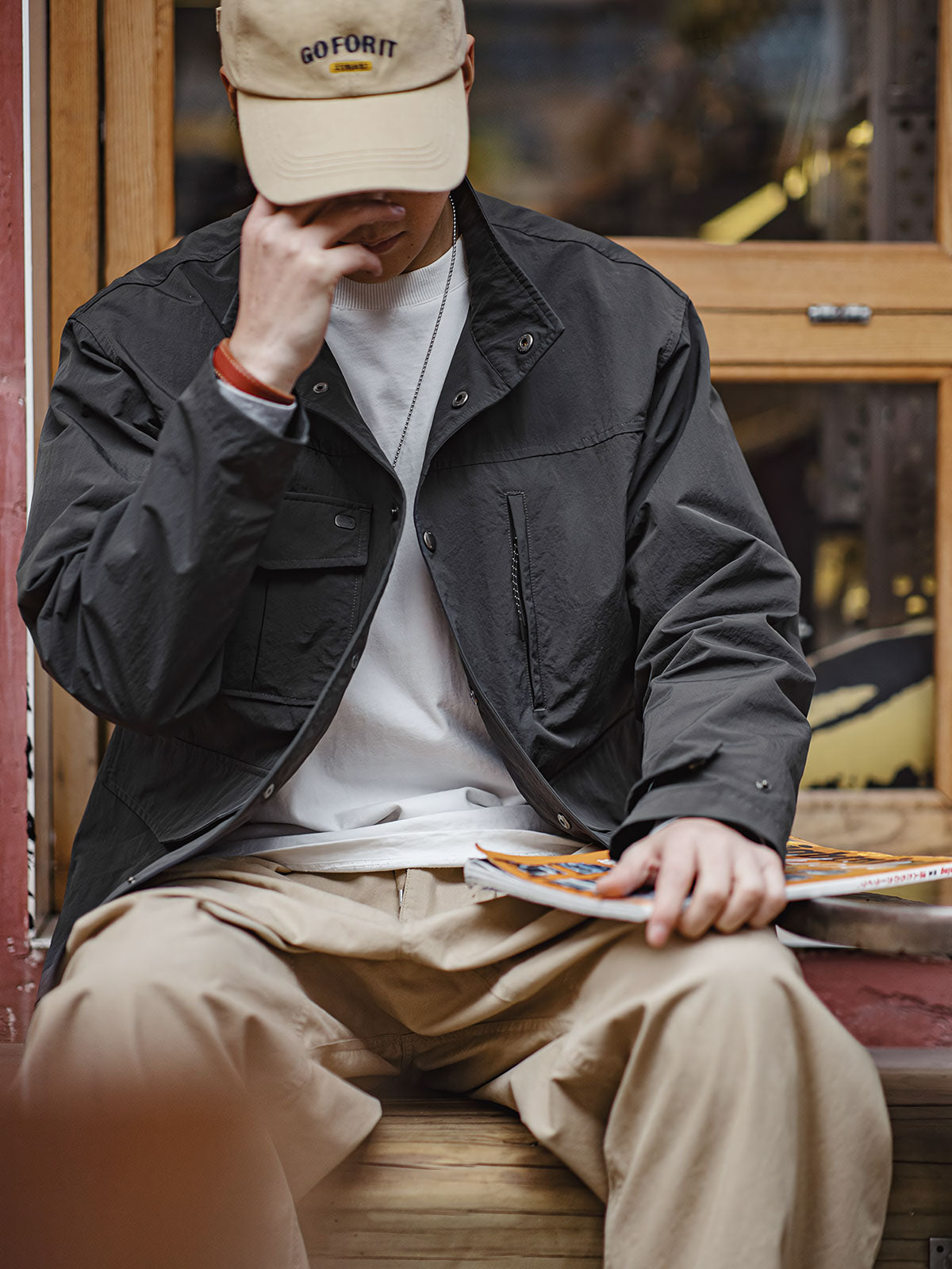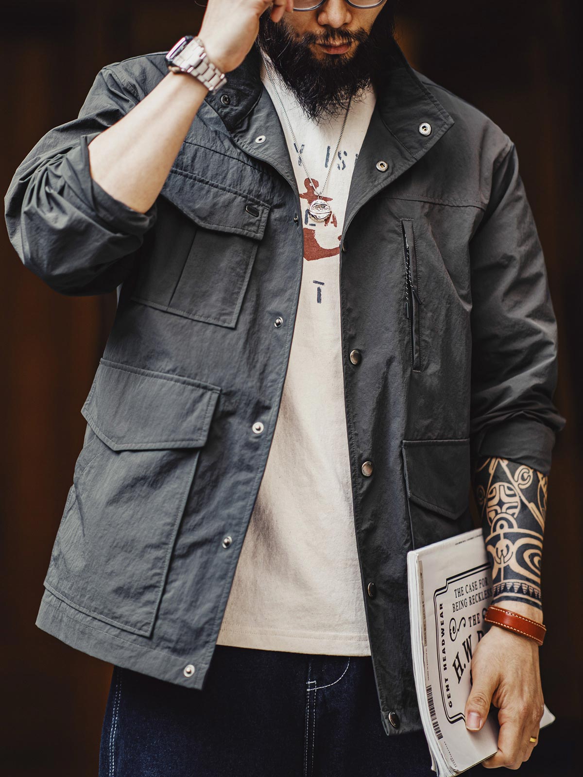 防水性のあるナイロン素材で作られて、軽量かつ耐久性があり、悪天候や湿気のある環境でも快適に着用する。雨や水しぶきから身体を保護し、衣服の内部を乾燥させることで快適さを確保。
