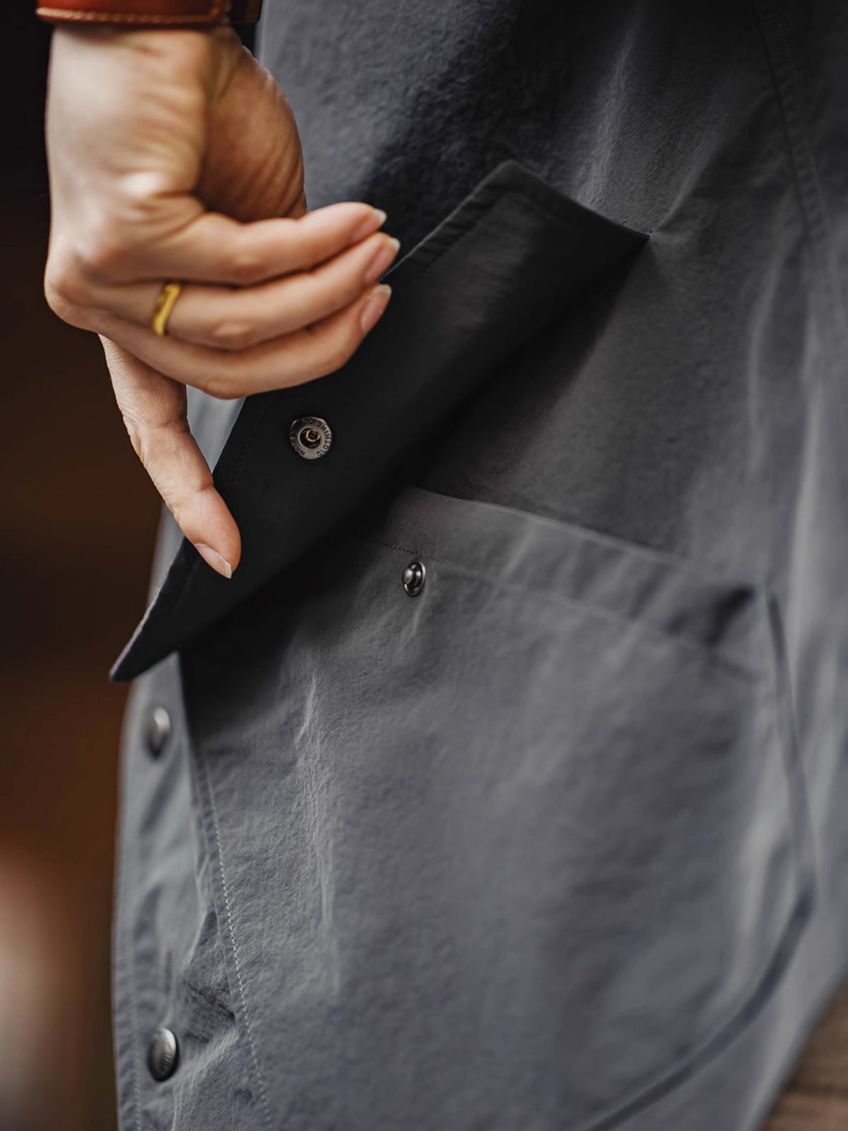 前立てを閉じるためにスナップボタンが使用されて、素早く開閉することができ、取り扱いが簡単。ワークスタイルの機能性と快適さを高める一方で、スタイリッシュな外観を与える。