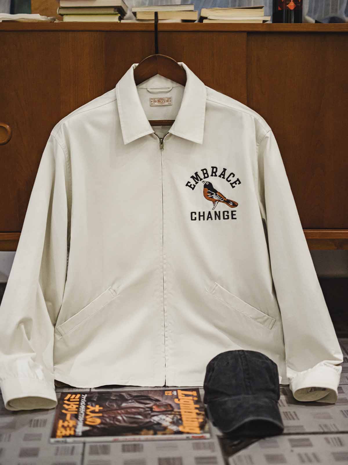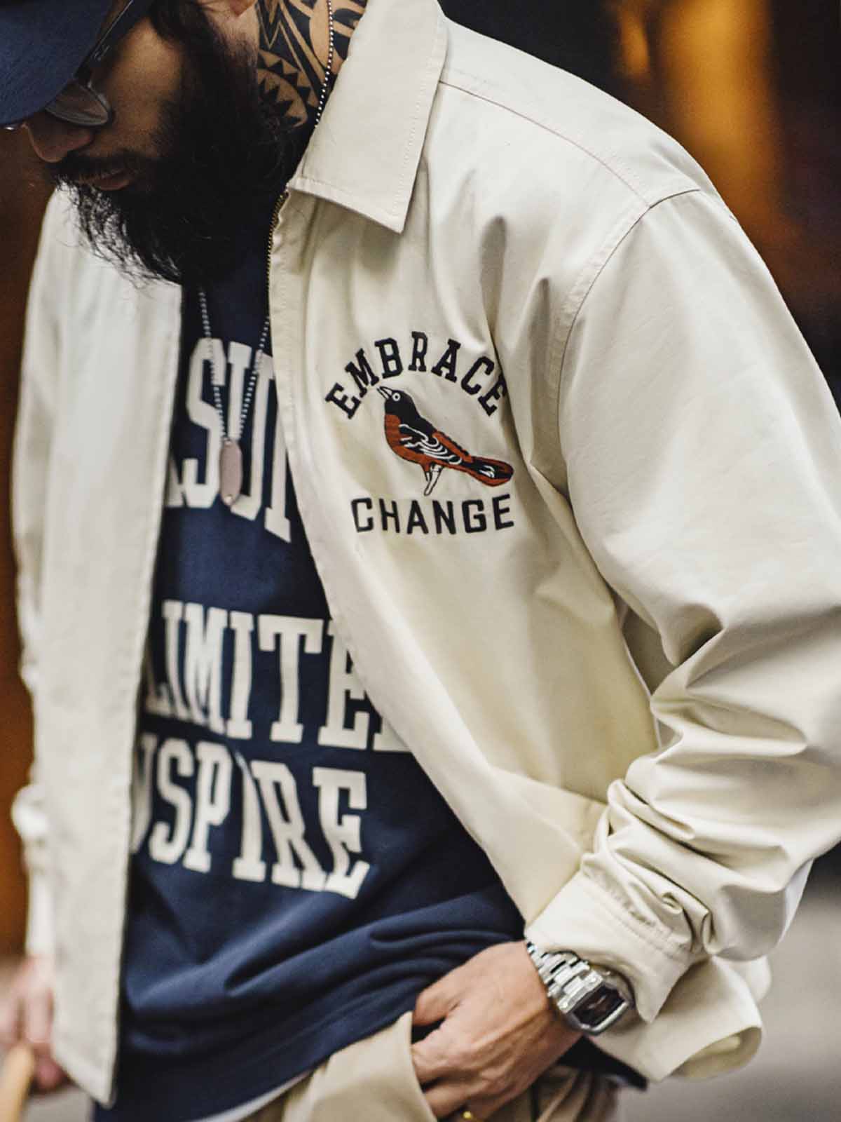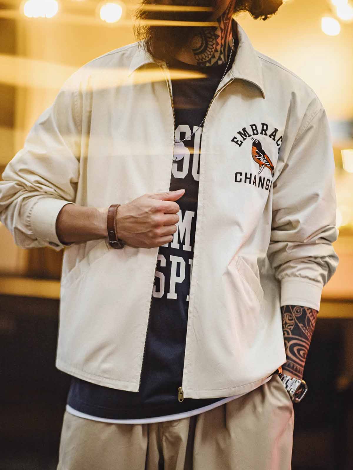 このジャケットは、野球リーグのチームエッセンスに触発されたデザインで、オレンジとブラックの「モキンイング」刺繍がアクセントとして施されています。米杏色の織布コットン生地はシルク光仕上げ加工により、上品な光沢と柔らかな手触りを実現。古銅ジッパーがヴィンテージ感を強調し、胸部のフラップポケットなどのディテールが実用性とデザイン性を両立しています。ゆったりとしたルーズフィットのシルエットが、カジュアルなストリートスタイルだけでなく、スポーティなエッセンスも感じさせる一着に仕上がっています。