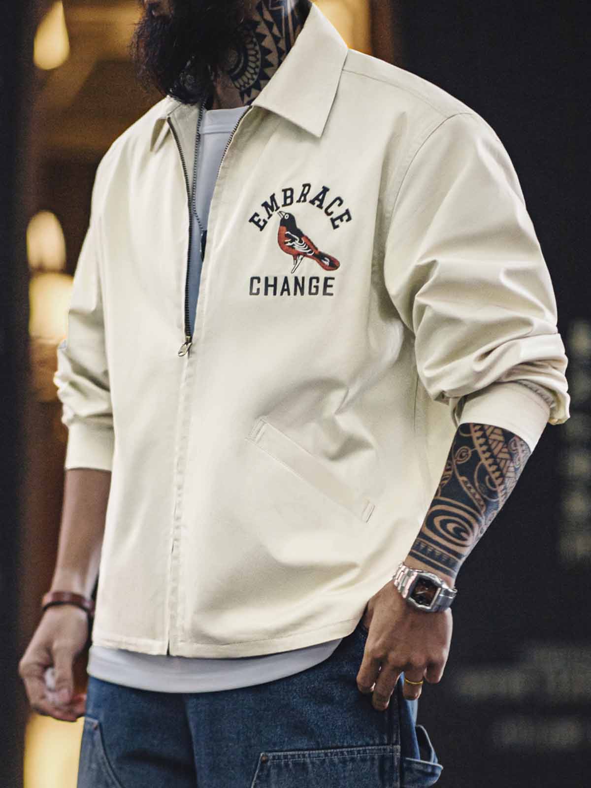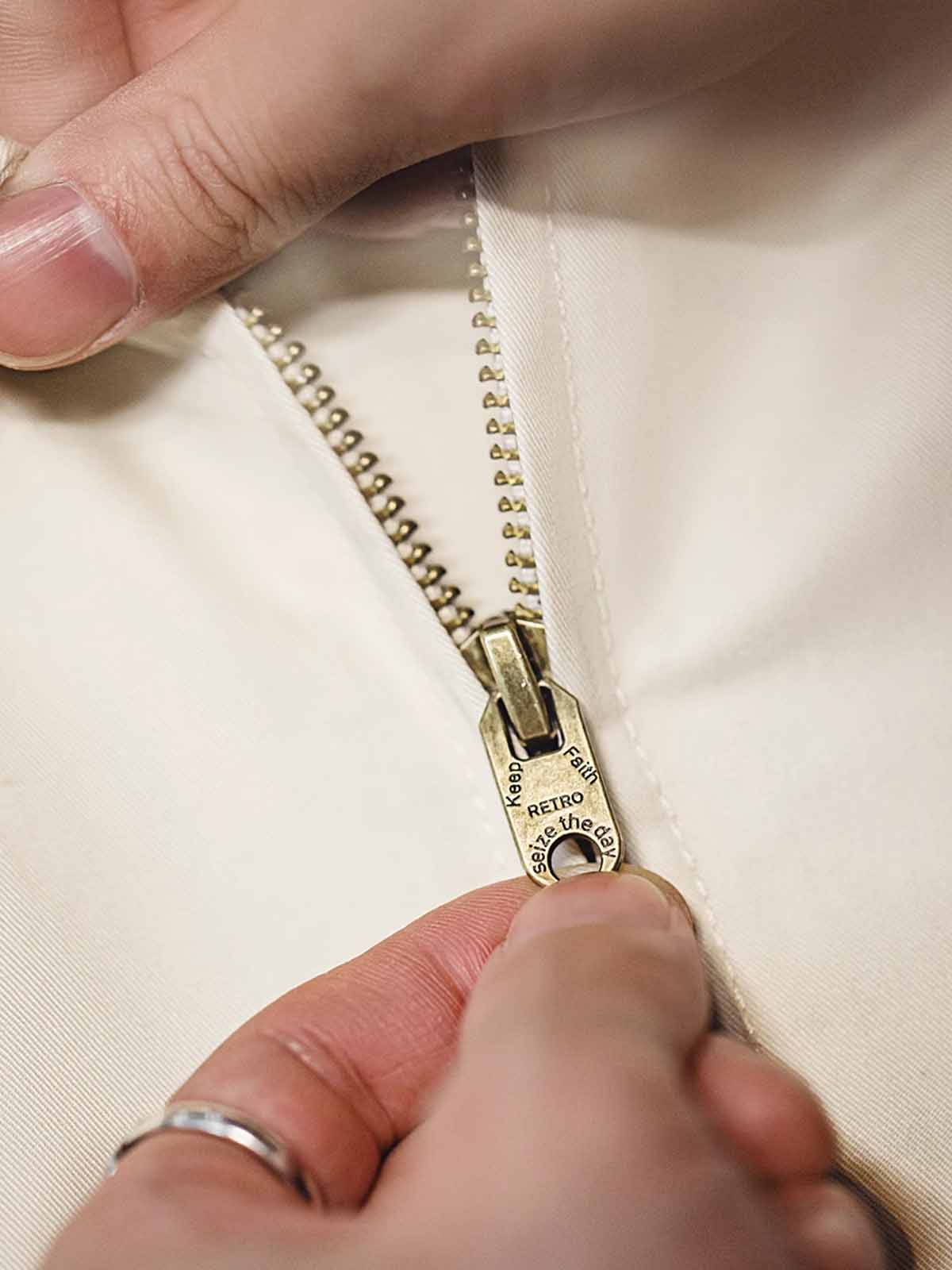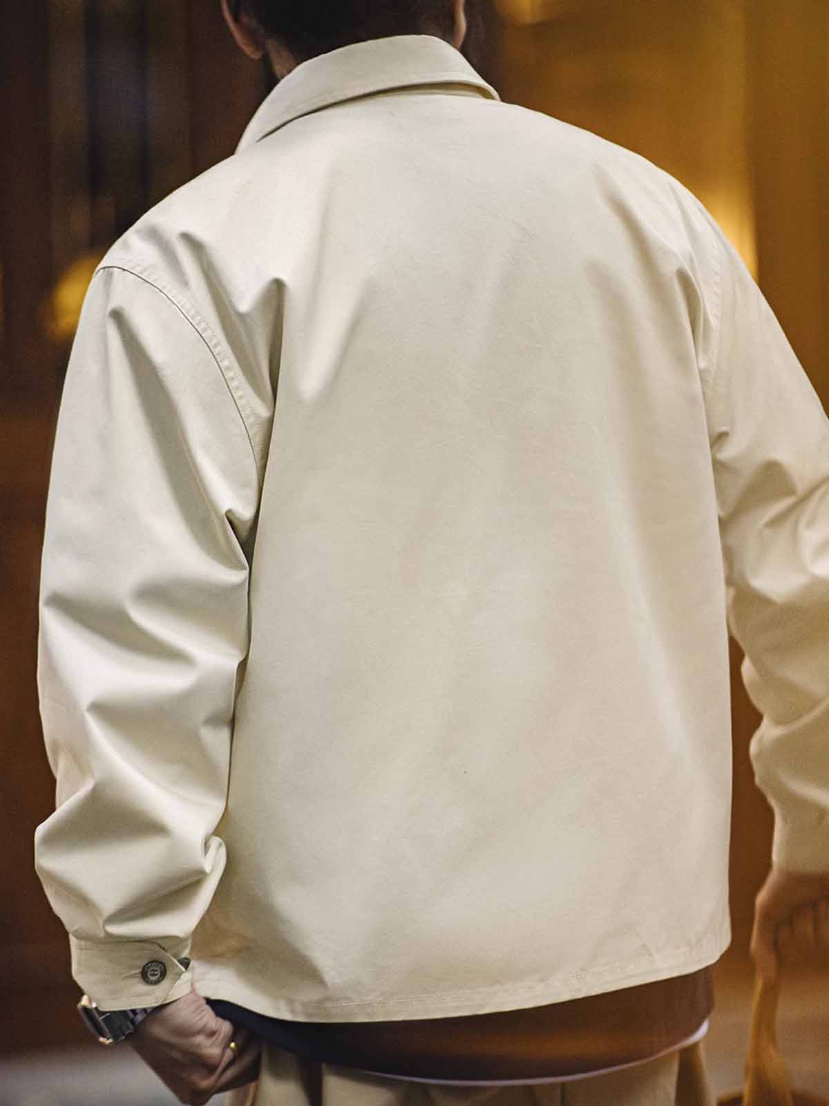 このジャケットは、野球リーグのチームエッセンスに触発されたデザインで、オレンジとブラックの「モキンイング」刺繍がアクセントとして施されています。米杏色の織布コットン生地はシルク光仕上げ加工により、上品な光沢と柔らかな手触りを実現。古銅ジッパーがヴィンテージ感を強調し、胸部のフラップポケットなどのディテールが実用性とデザイン性を両立しています。ゆったりとしたルーズフィットのシルエットが、カジュアルなストリートスタイルだけでなく、スポーティなエッセンスも感じさせる一着に仕上がっています。
