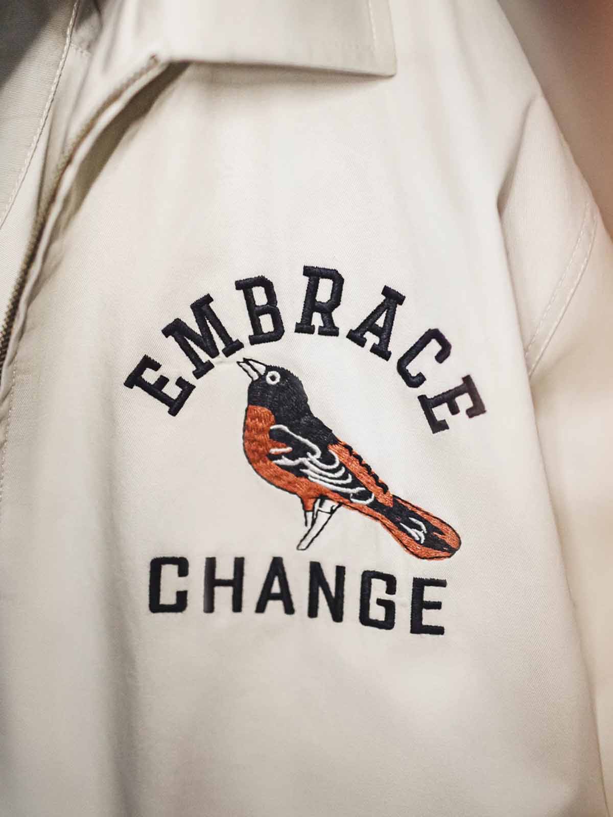 オレンジとブラックの「モキンイング」刺繍モチーフとクラシックなコーチジャケットのシルエットが融合し、ストリートで映えるヴィンテージな魅力を演出します。