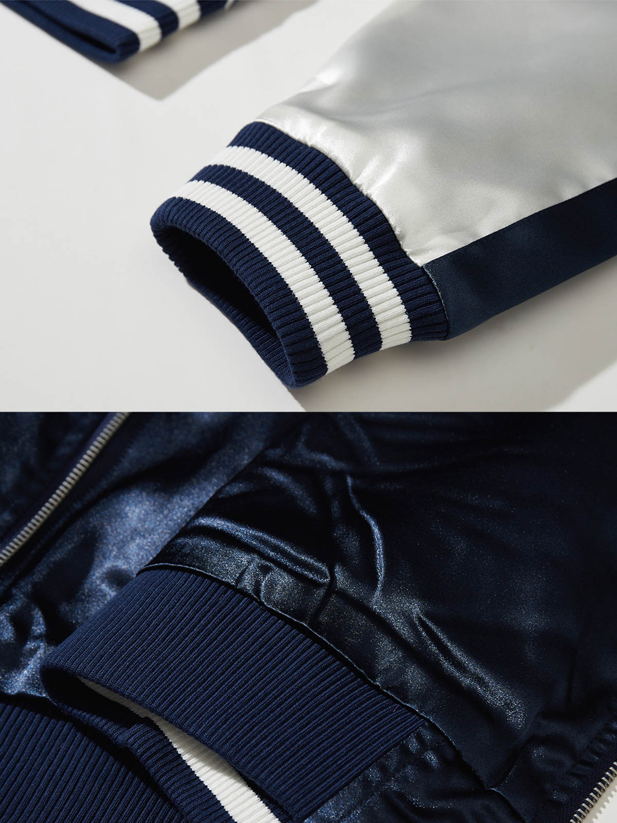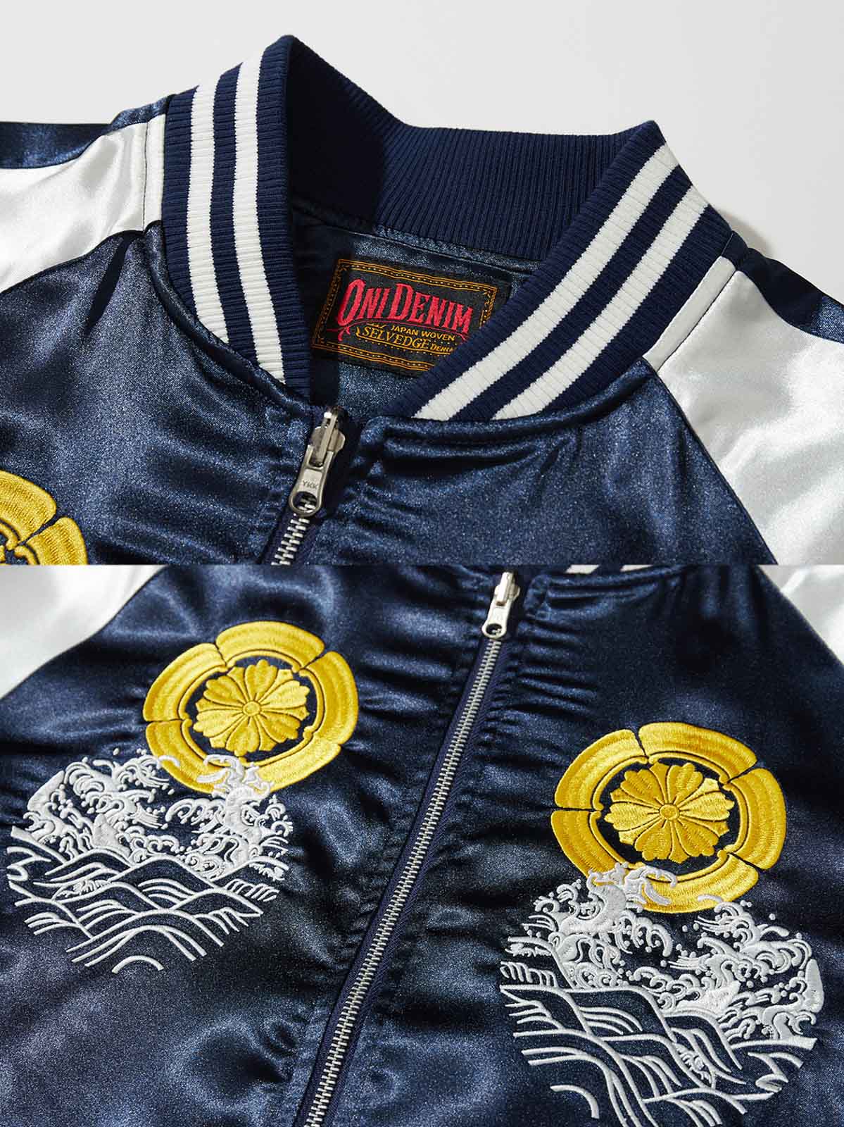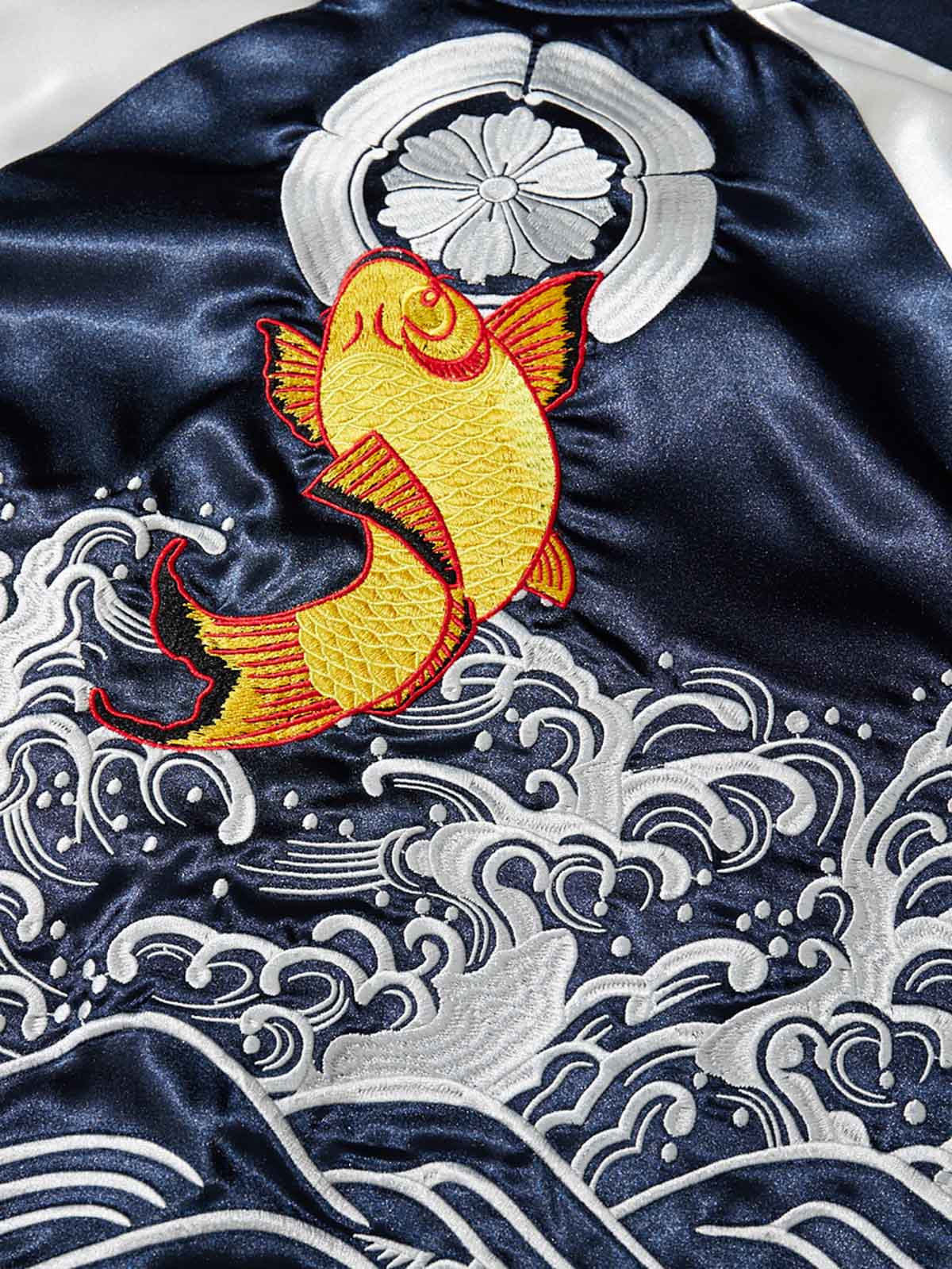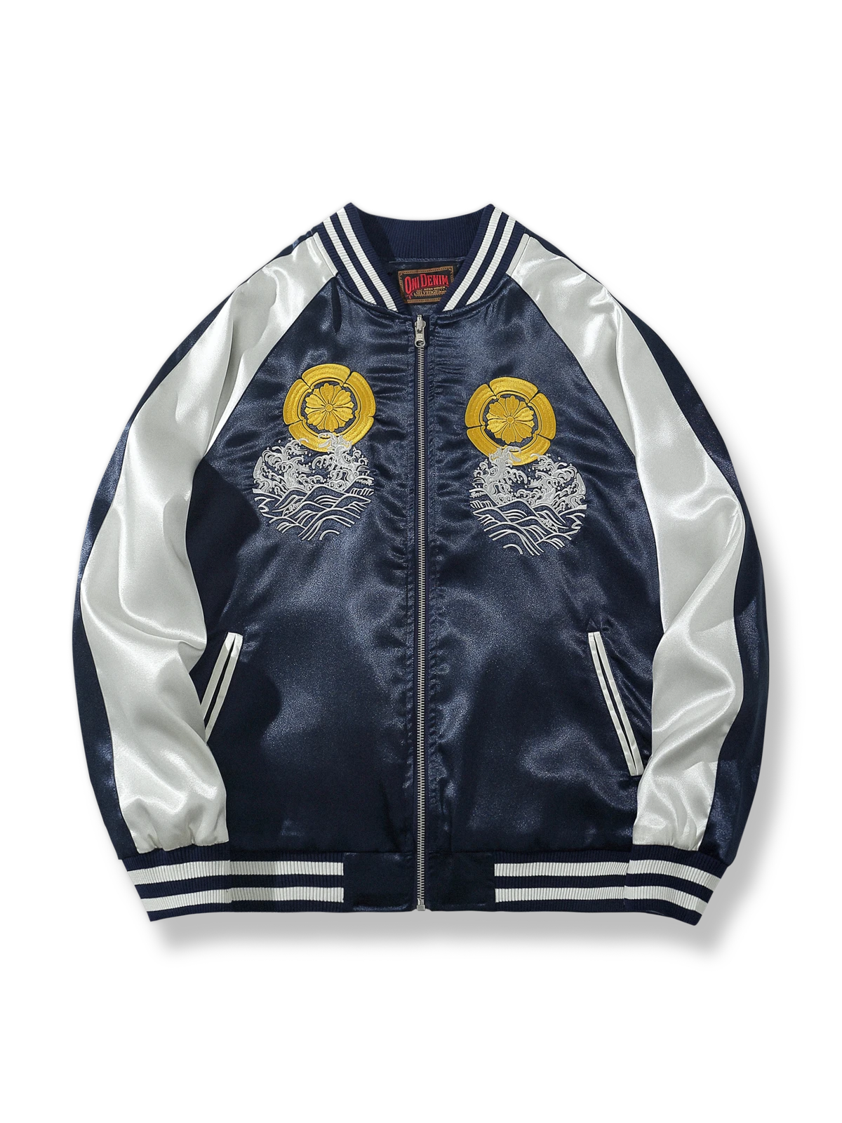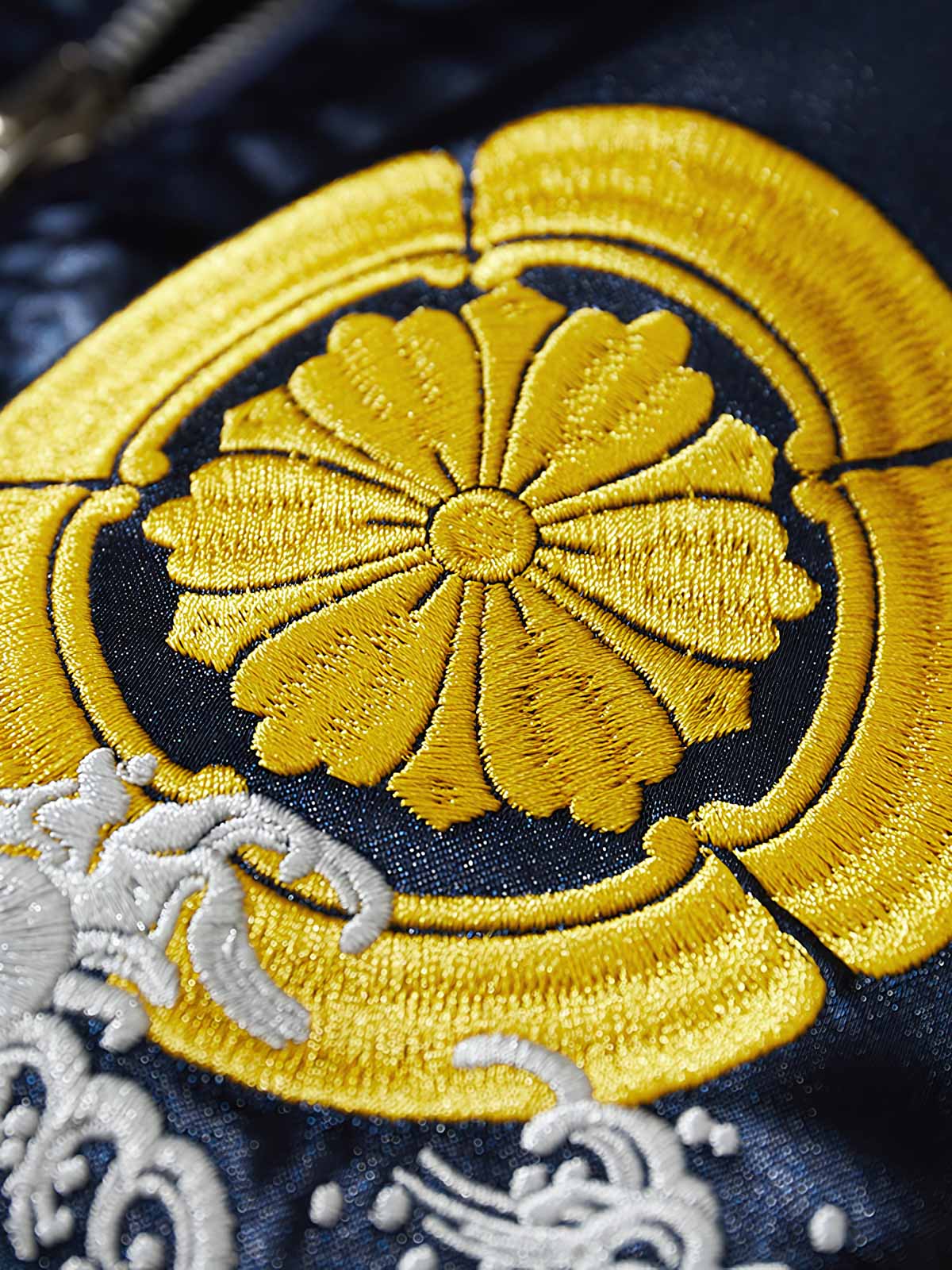 このフライトジャケットは、横須賀の濃厚な日本文化を特徴とする刺繍技術を用い、波と鯉の図案を主要なデザイン要素としています。刺繍は滑らかで、色彩が鮮やかで、日本の浮世絵の美学を生き生きと表現しています。内側は通常、滑らかなサテン素材で、着心地と滑りの良さを向上させています。