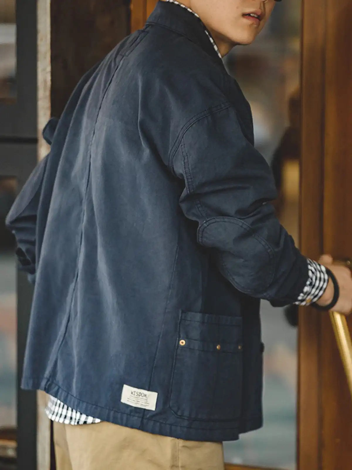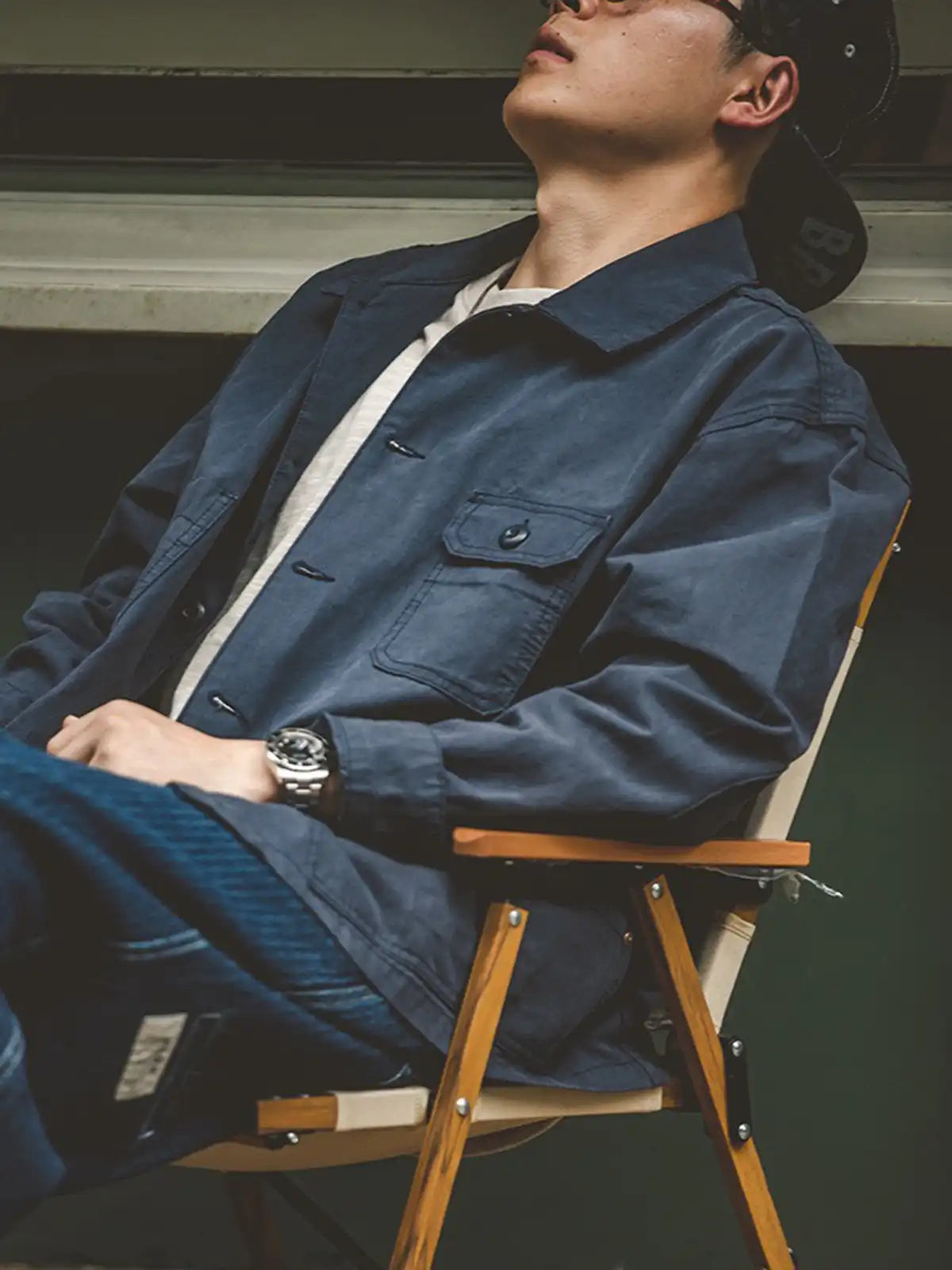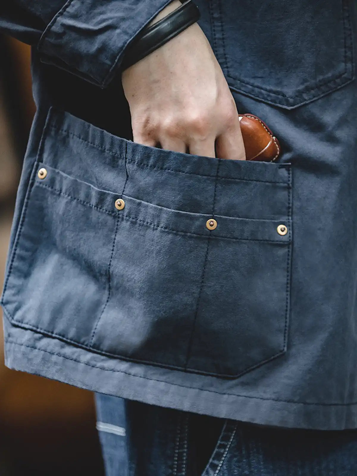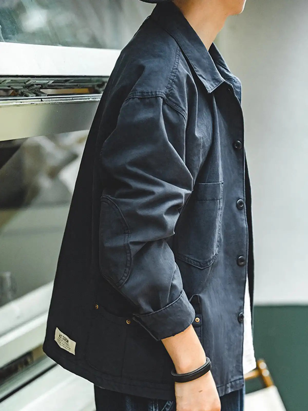 フランスのワークジャケットのエッセンスを取り入れ、前面には左右非対称に施された4つのポケットを配したユニークなデザインが特徴です。シルエットはアメリカンワークの無骨さとは異なり、細部の縫製やカッティングにこだわり、品よく仕上げています。カラーは深みのあるネイビーで、一見落ち着いた印象ですが、コーディネート次第で多彩なスタイルを演出可能。生地には約290g/m²のヘビーウェイトなコットンヘリンボーンを採用し、最初はハリ感のあるシルエットをキープしつつ、着用と洗濯を重ねるうちにやわらかく馴染む変化を楽しめます。