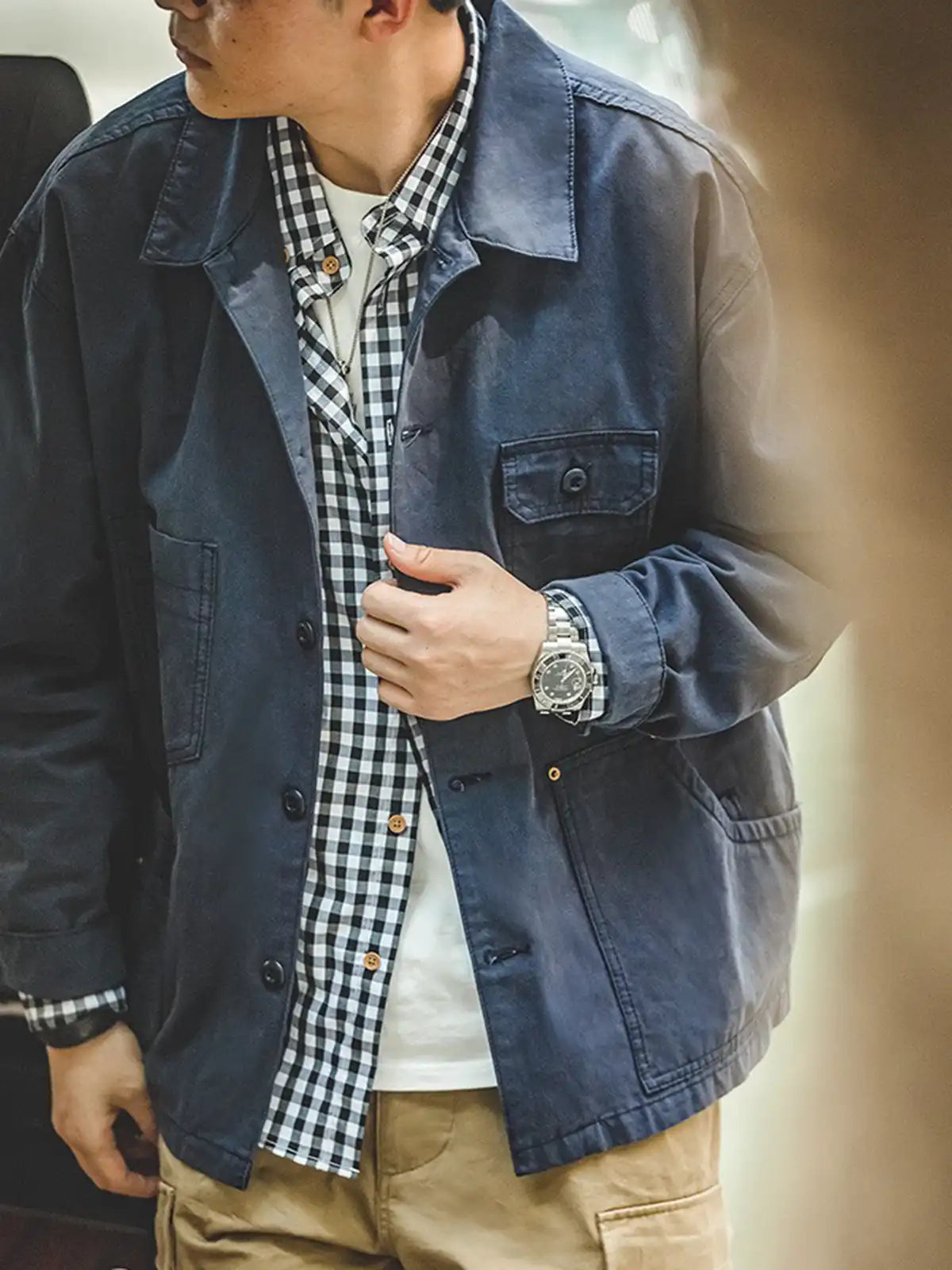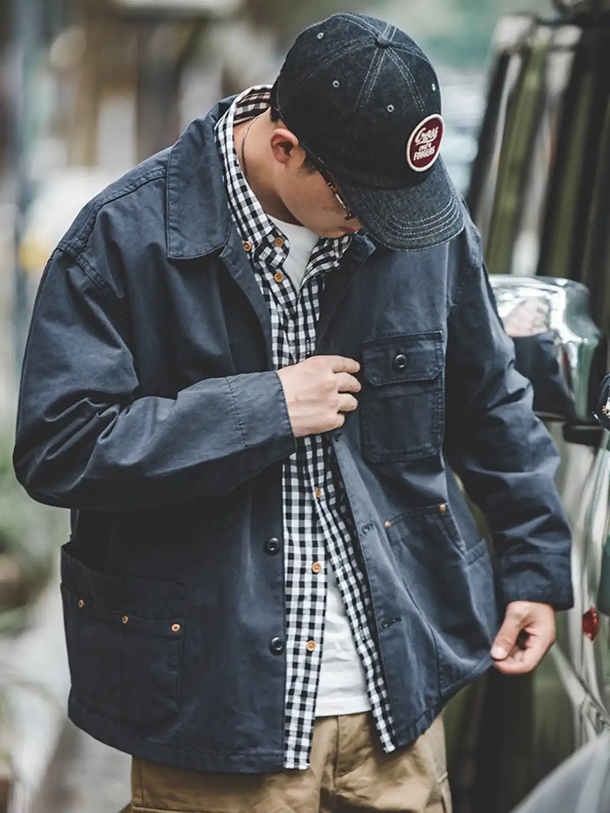 このジャケットは、フレンチワークの伝統をベースに、コーチジャケット風のデザインと多ポケット仕様を組み合わせ、シンプルでありながら着こなしの幅を広げる一着です。