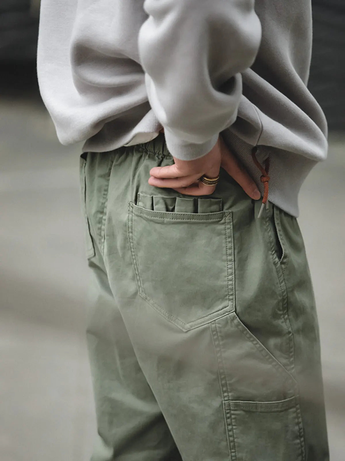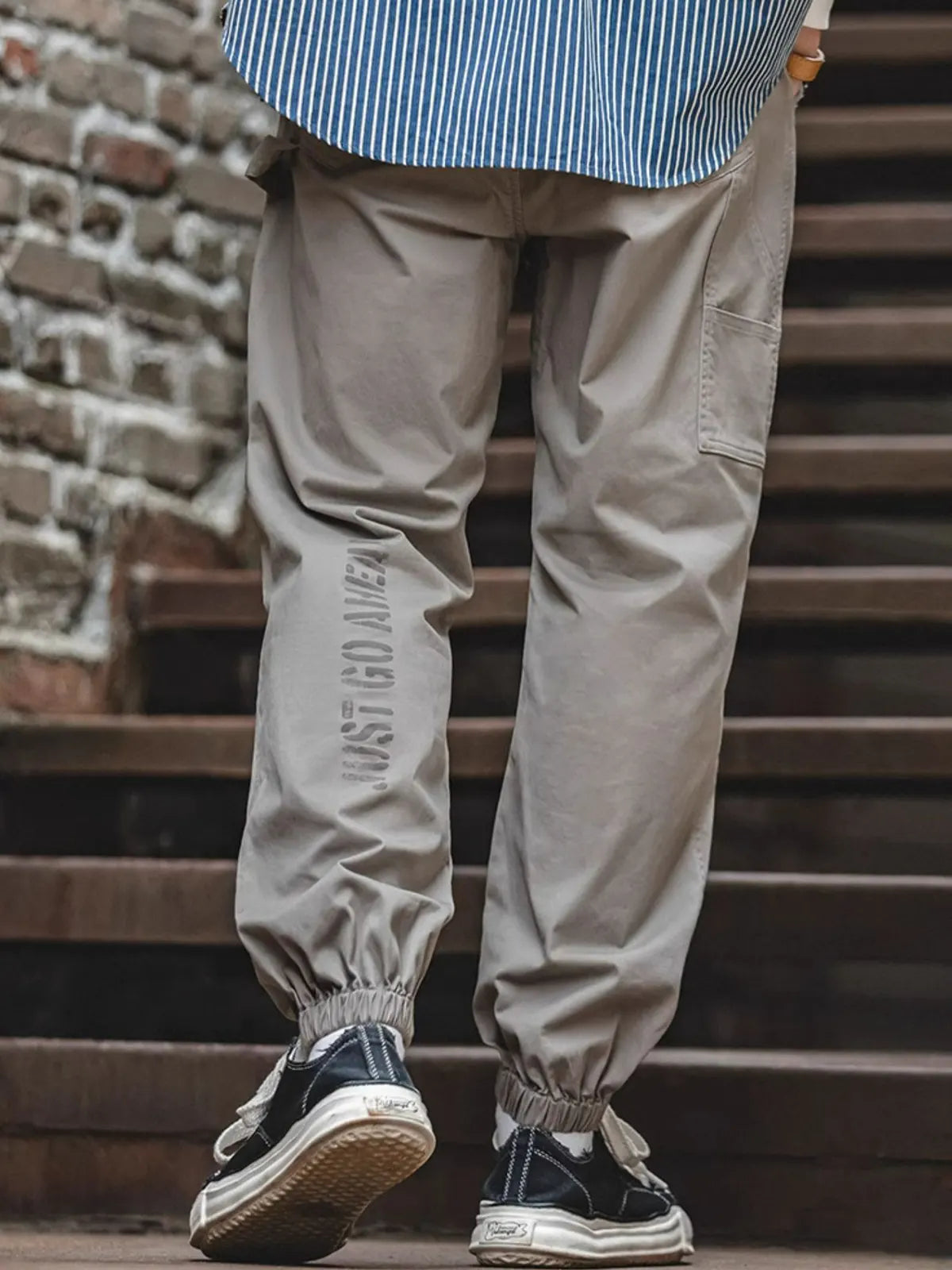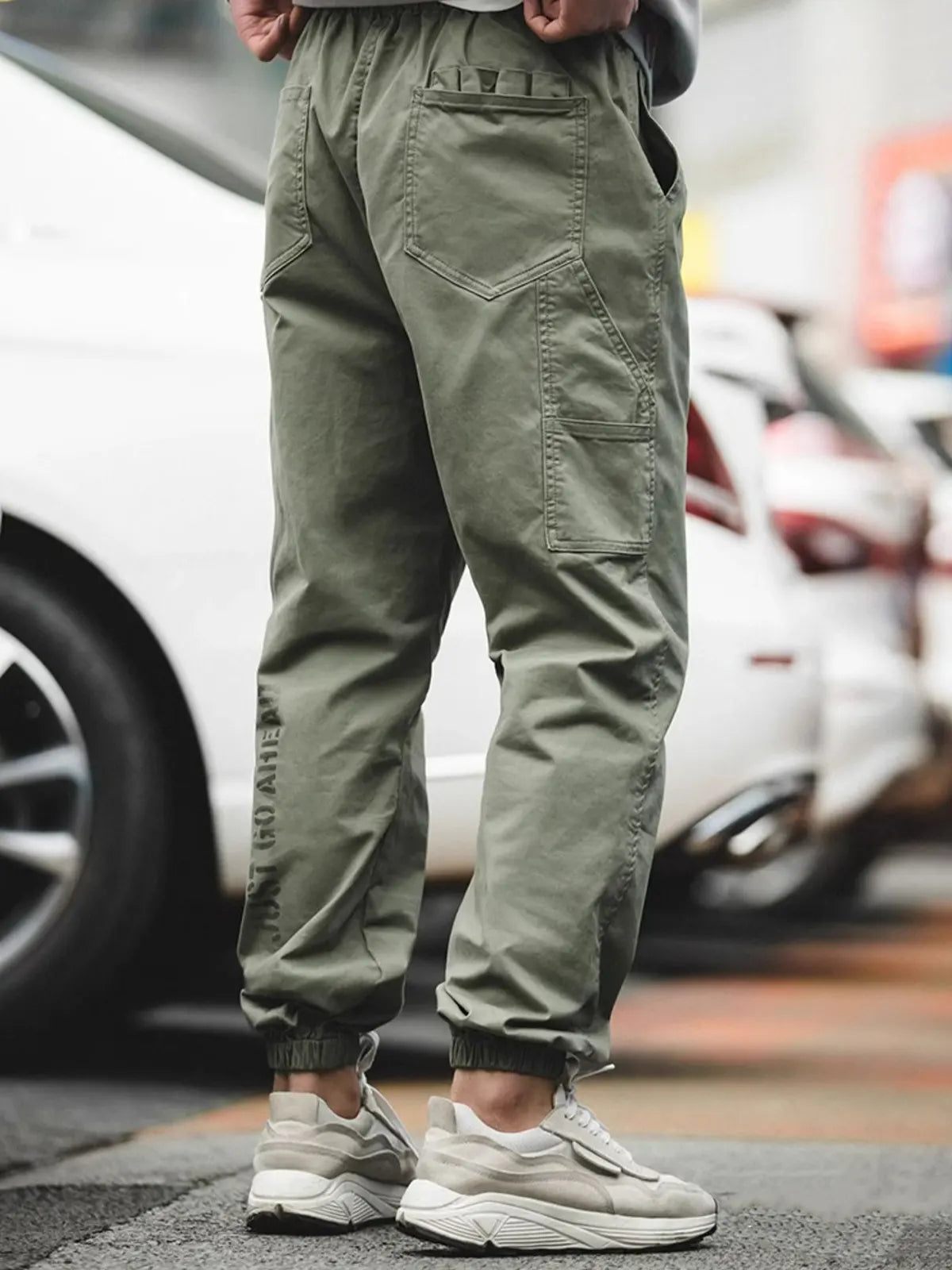 このイージーパンツは、新定番として「快適、立挺、便利」を追求し、コットン97%×スパンデックス3%の裾まで磨毛加工を施した生地を採用。ウエストはドローストリングでベルト不要、脚首はゴムギャザーでシューズを選ばずにスタイリング可能です。左腿の「JUST GO AHEAD」プリントとミリタリーテイストのカートリッジポケットがアクセントになり、リラックス感のあるハーレムシルエットが日常からアウトドアまで幅広いシーンで自信を与えます。