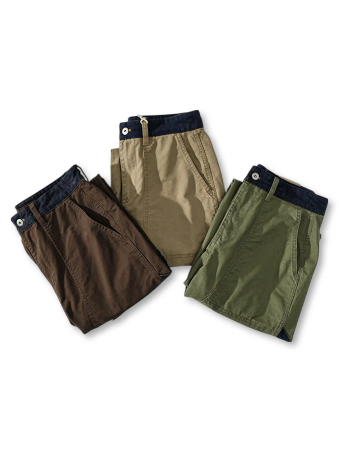 古き良き米国林業作業服をリファインしたデザインで、ウエストはインディゴデニム切替+ドローコード仕様、膝部分には耐久性を高める補強パッチを配置し、実用性とヴィンテージ感を両立。大容量のカーゴポケットとサイドスラントポケットが収納力を確保しつつ、裾のドローコードでシルエット調整が可能。素朴なカラーパレット(ミリタリーグリーン、カーキ、コーヒー)とタフな生地感は、Tシャツやワークシャツとのレイヤードにも最適です。