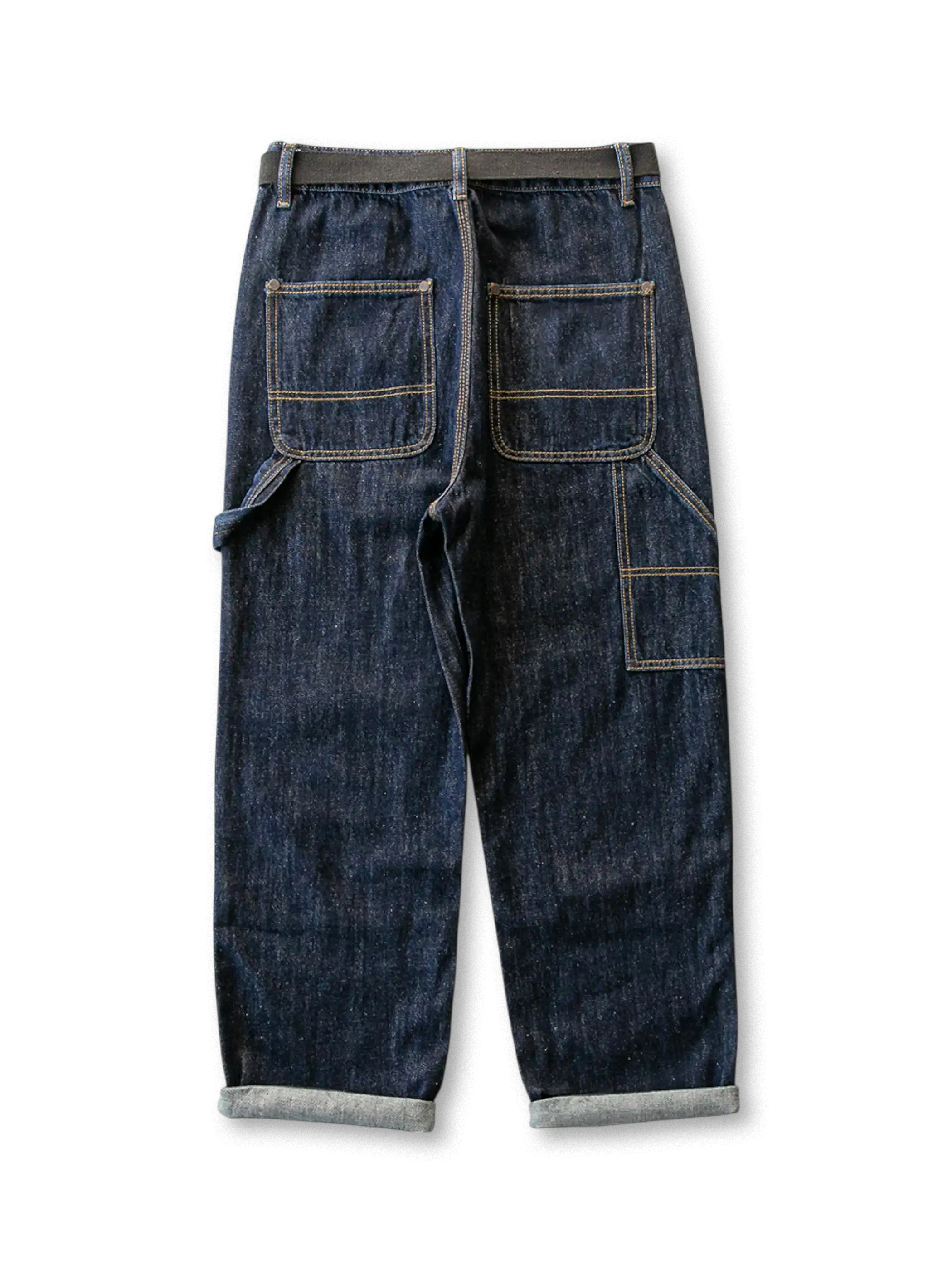 100%コットンのセルビッジデニムを使用し、膝部分に大きめのパッチを当てて摩耗を防ぐワークウェア要素を取り入れつつ、全体にウォッシュ加工を施してヴィンテージライクな風合いを演出。ウエストには内蔵ベルトとゴムを組み合わせたイージーフィット仕様を採用し、着脱やフィット感の調整が容易。フロントにはハンドポケット、サイドにはツールポケットを配して機能性を高め、裾はややテーパードしたシルエットでモダンな印象をプラス。ヘビースモークや使用による自然な色落ちが生まれるため、着込むほどに味わい深くなる少量生産のストリートワークデニムです。