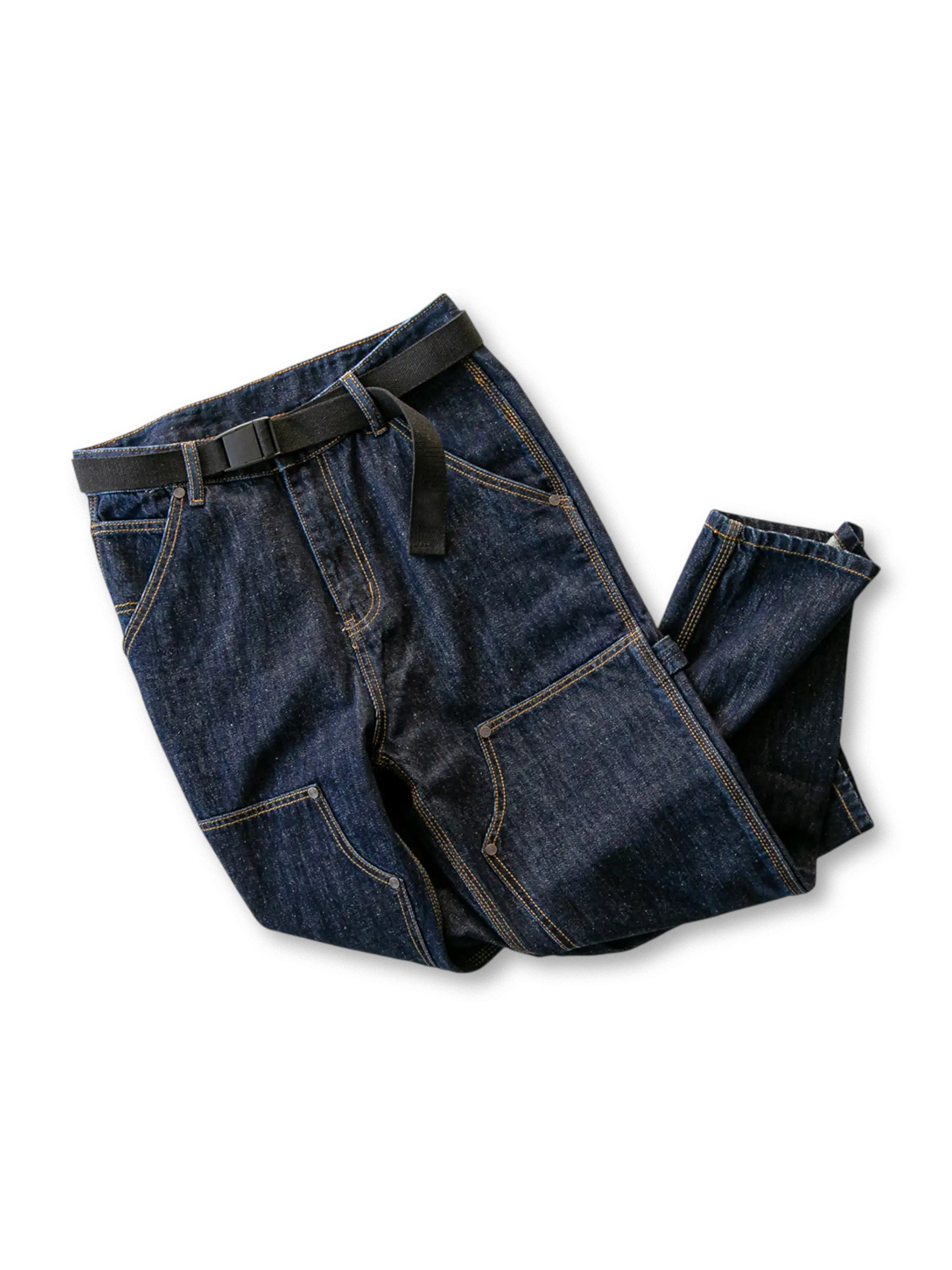 膝部分を補強したワークテイストの直筒デニムに調整可能なベルトを備えた、洗い込みヴィンテージ風ジーンズ。