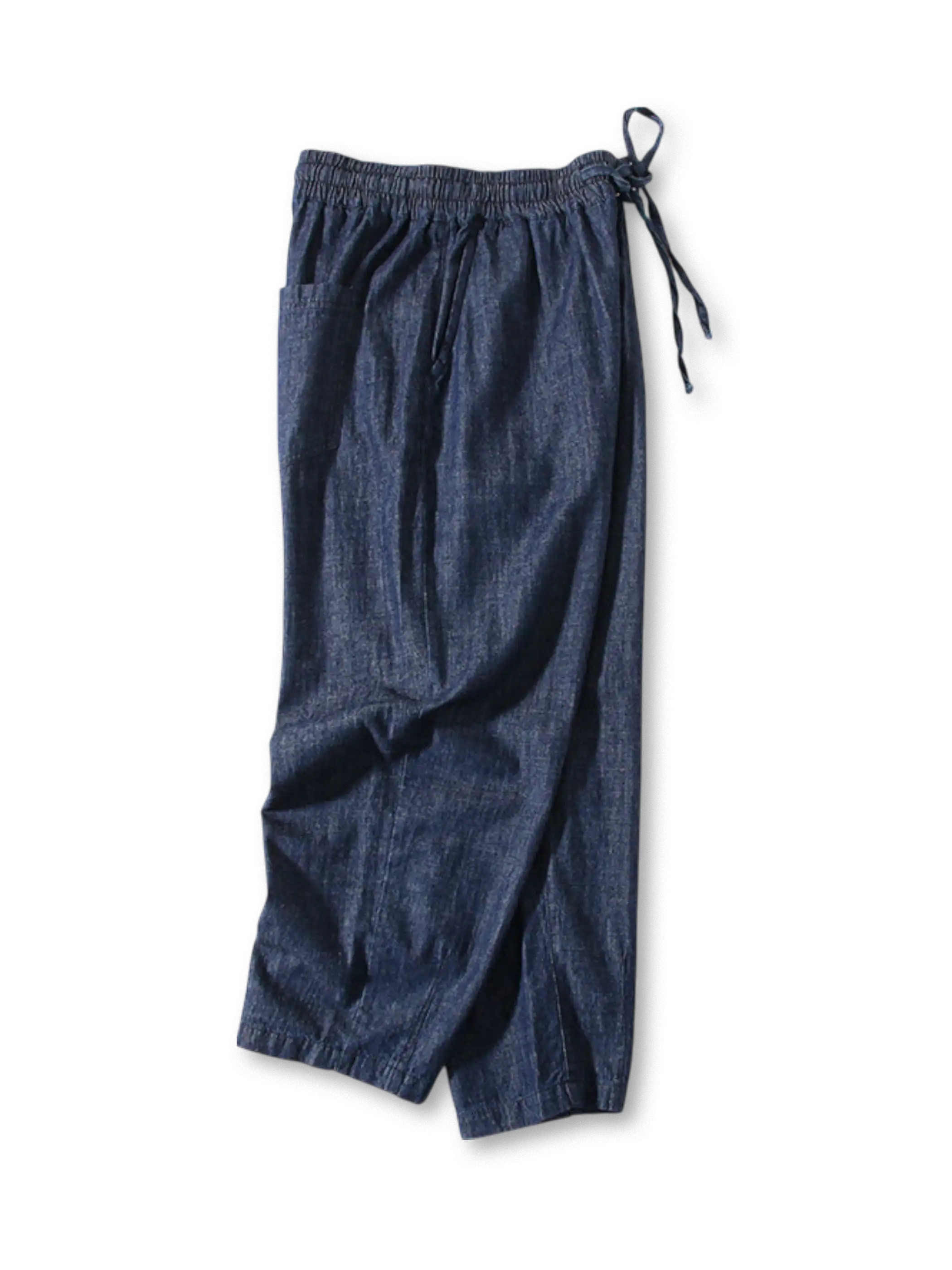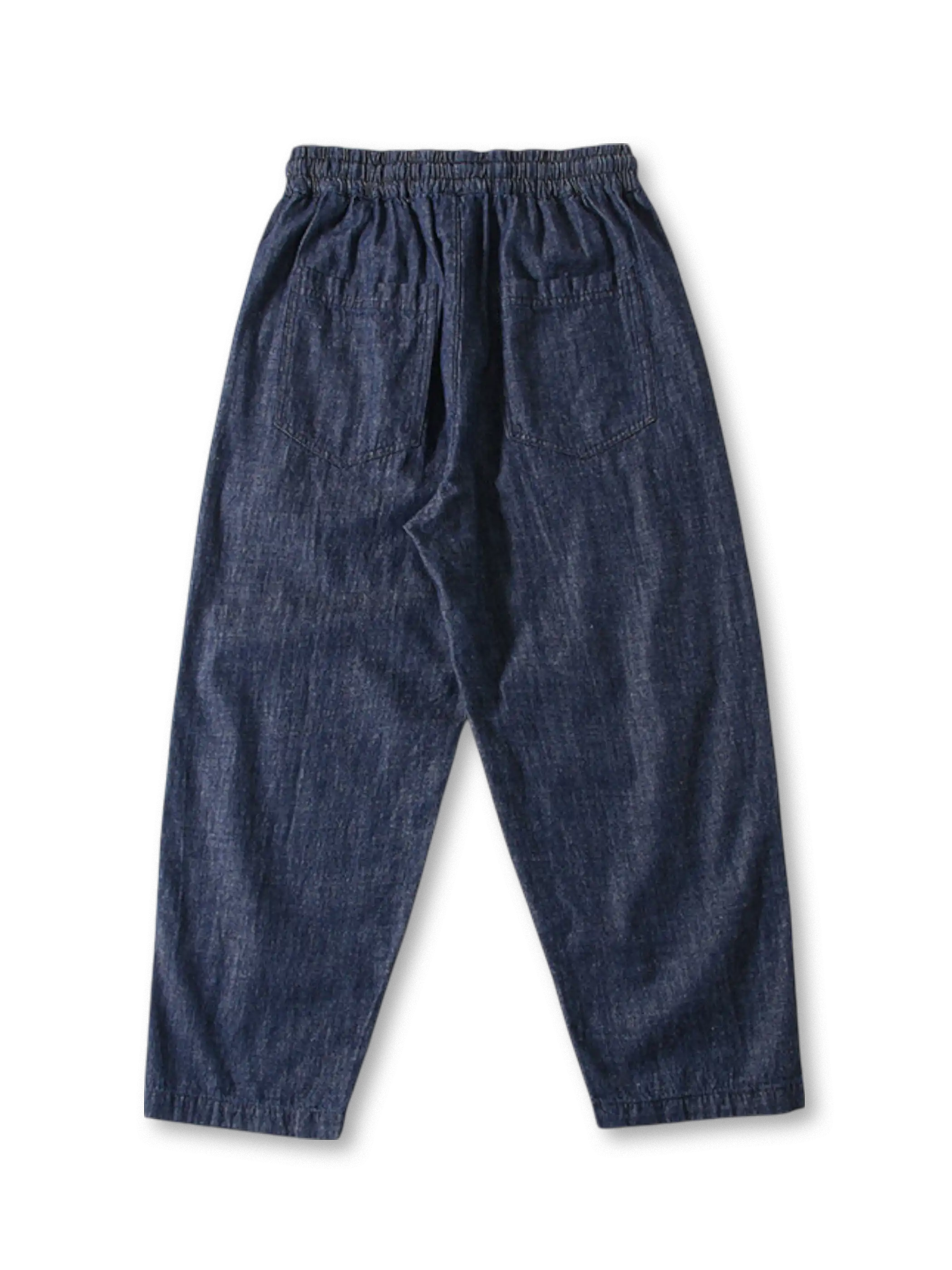 19世紀アメリカ西部のワークパンツをルーツに持つディテールを継承しつつ、モダンに再構築した一着。ウエストはドローストリングとゴム仕様でフィット感を自在に調整でき、ゆったりとしたワイドテーパードシルエットが抜け感を演出。軽量な9分丈デニムは通気性に優れ、裾の軽いテーパードが足元をすっきり見せるためサンダルからスニーカーまで幅広くマッチ。旅先でもデイリーでも、自由な動きと涼感をもたらします。