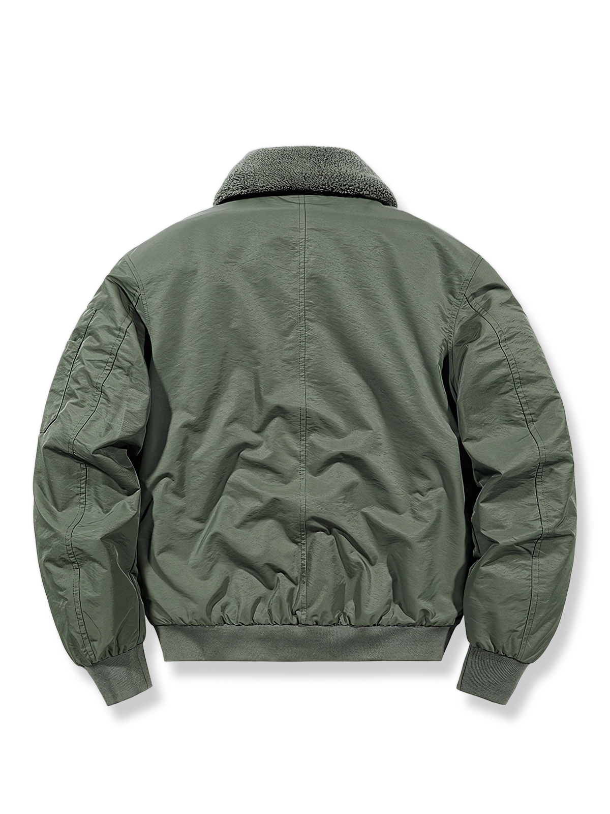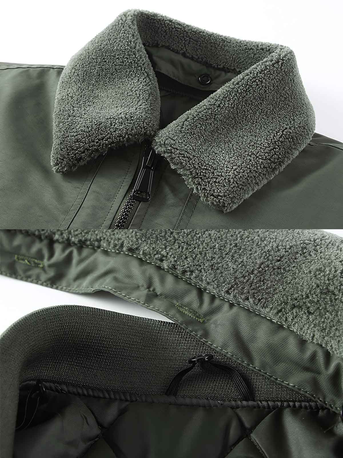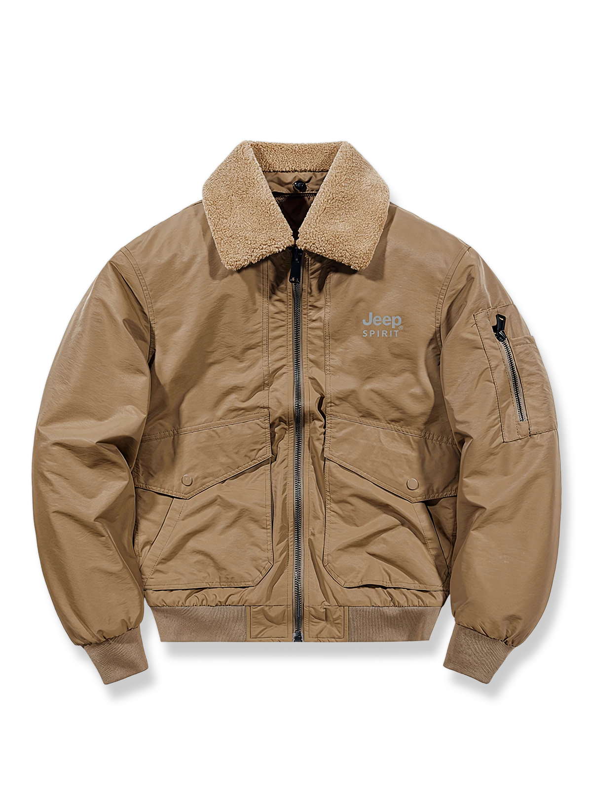 このふわふわの襟が特徴のフライトジャケットは、クラシックな軍用服のデザインから派生しており、特に襟のフリース素材は、厳しい寒さに対抗する実用的な考慮を反映しています。
