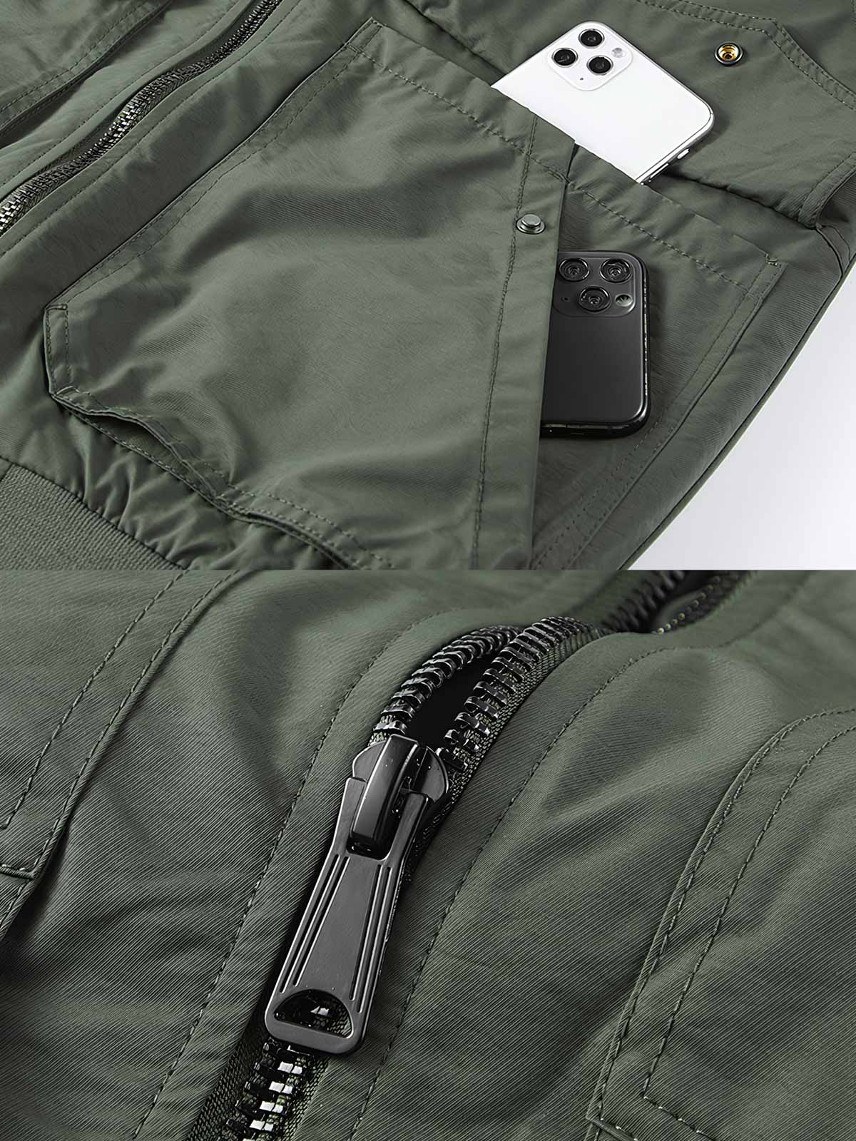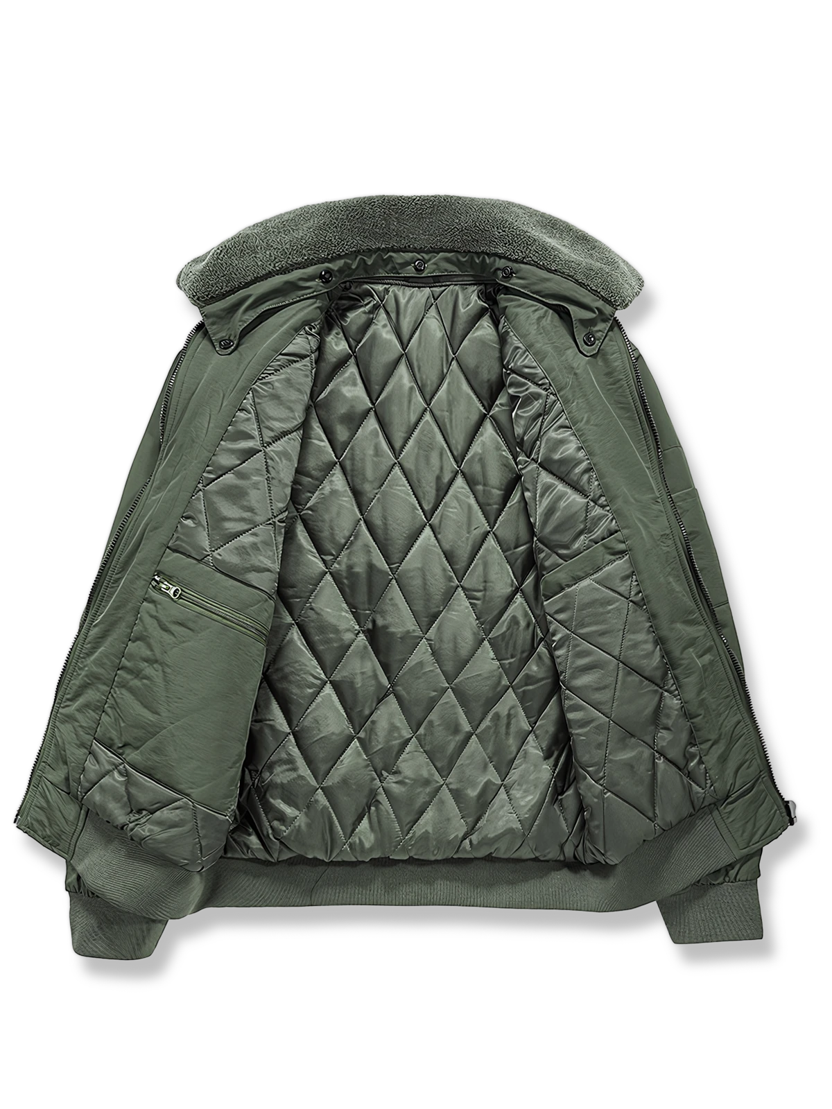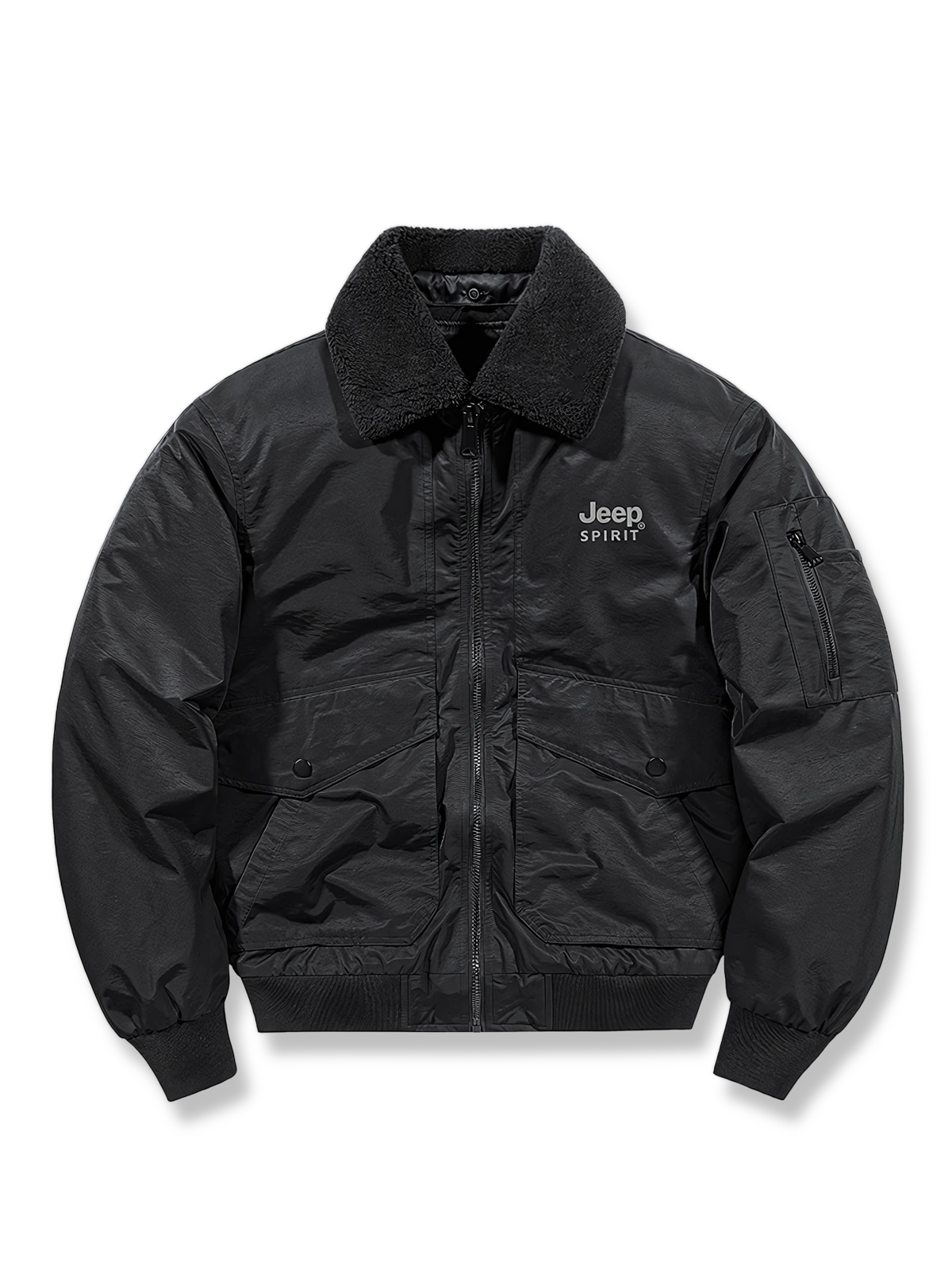 このふわふわの襟が特徴のフライトジャケットは、クラシックな軍用服のデザインから派生しており、特に襟のフリース素材は、厳しい寒さに対抗する実用的な考慮を反映しています。