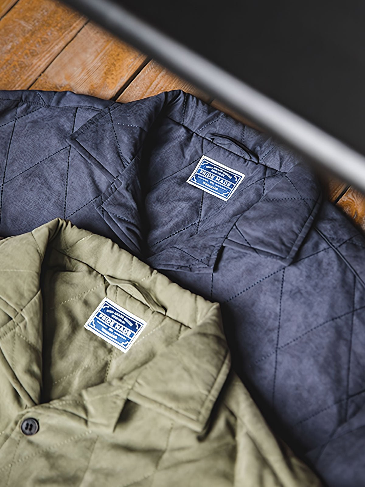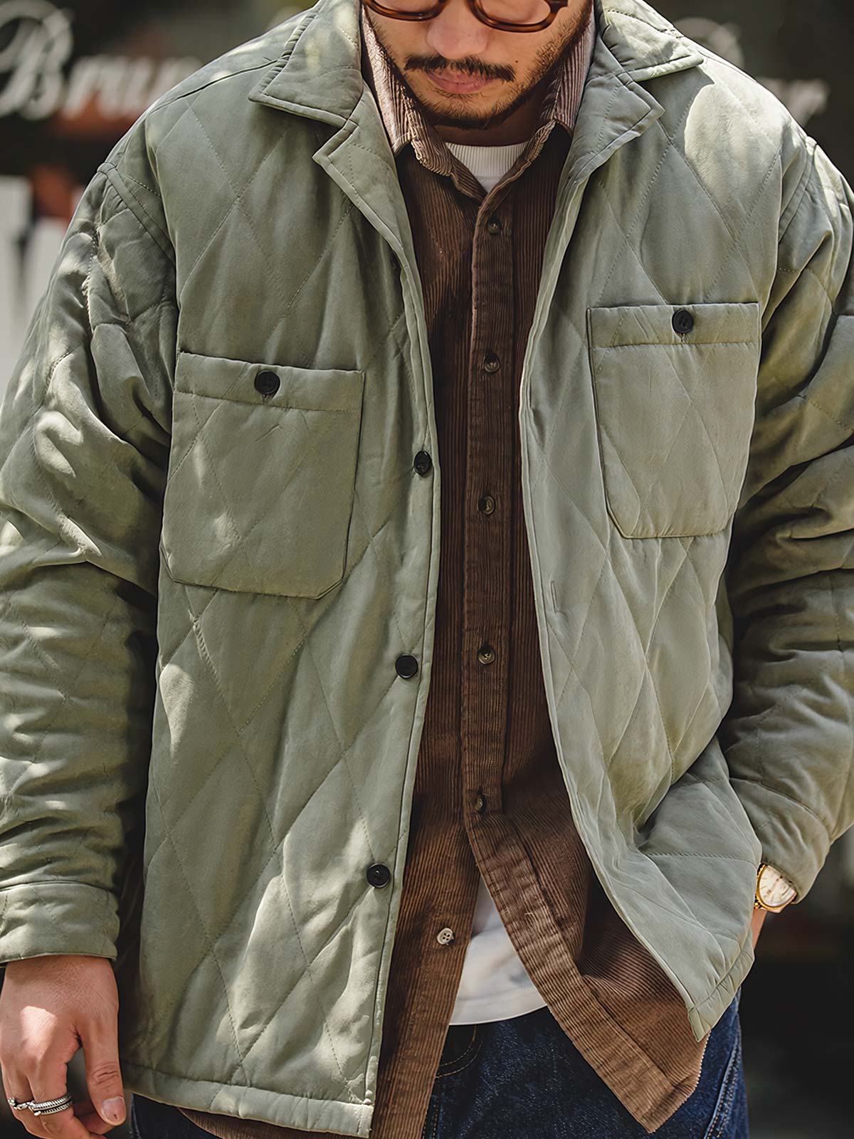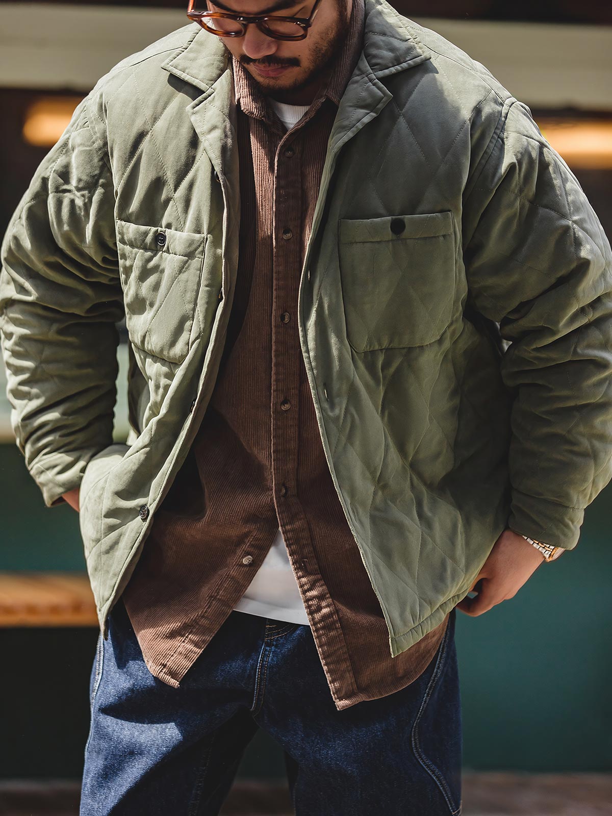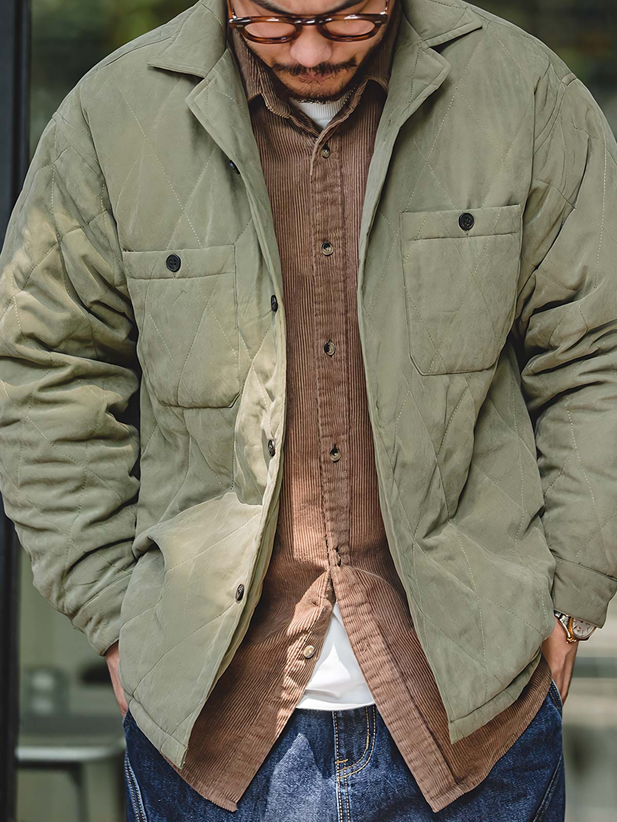 このコットンジャケットは、そのレトロなダイヤモンドキルティングデザインで、イギリスの伝統的な服装のクラシックな要素を反映しています。ピーチスキン素材は衣類に柔らかな手触りを与えるだけでなく、20世紀のイギリス貴族の狩猟服の優雅さも表現しています。
