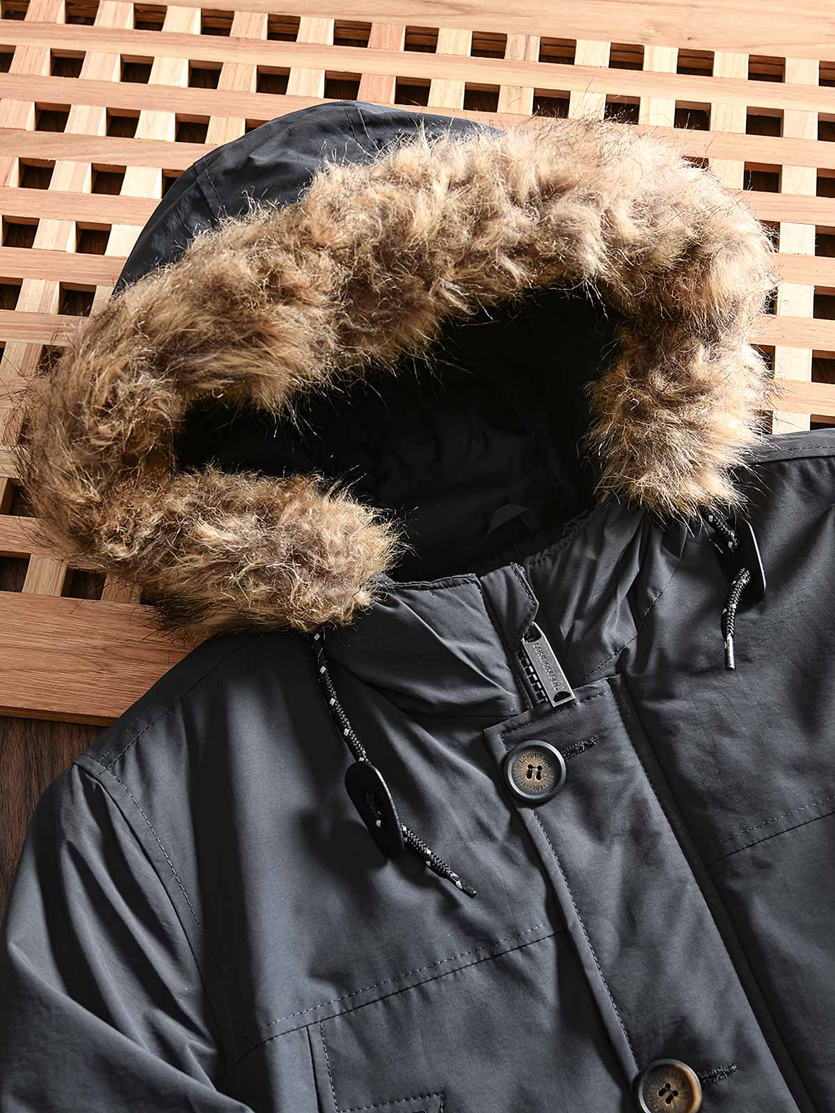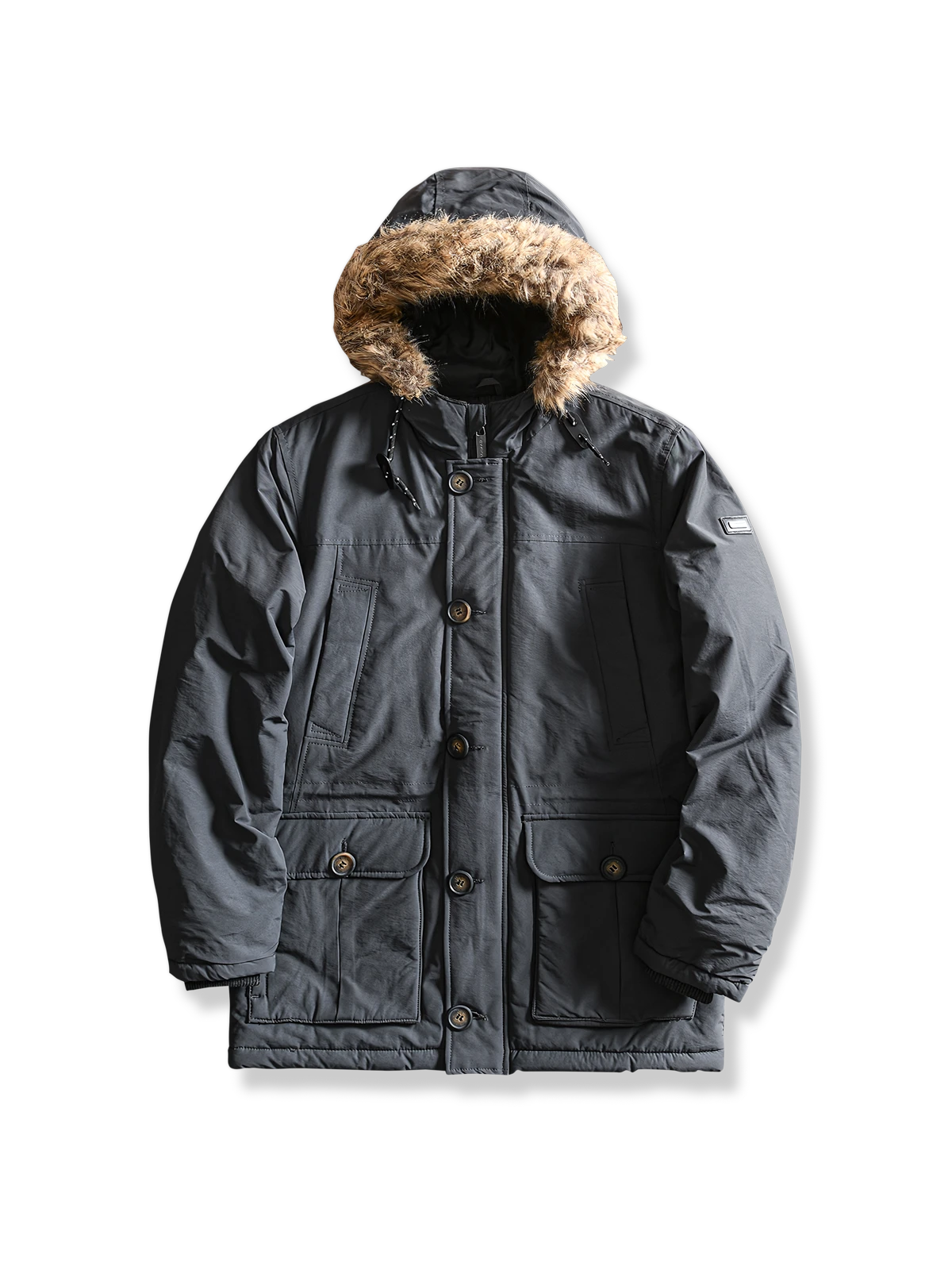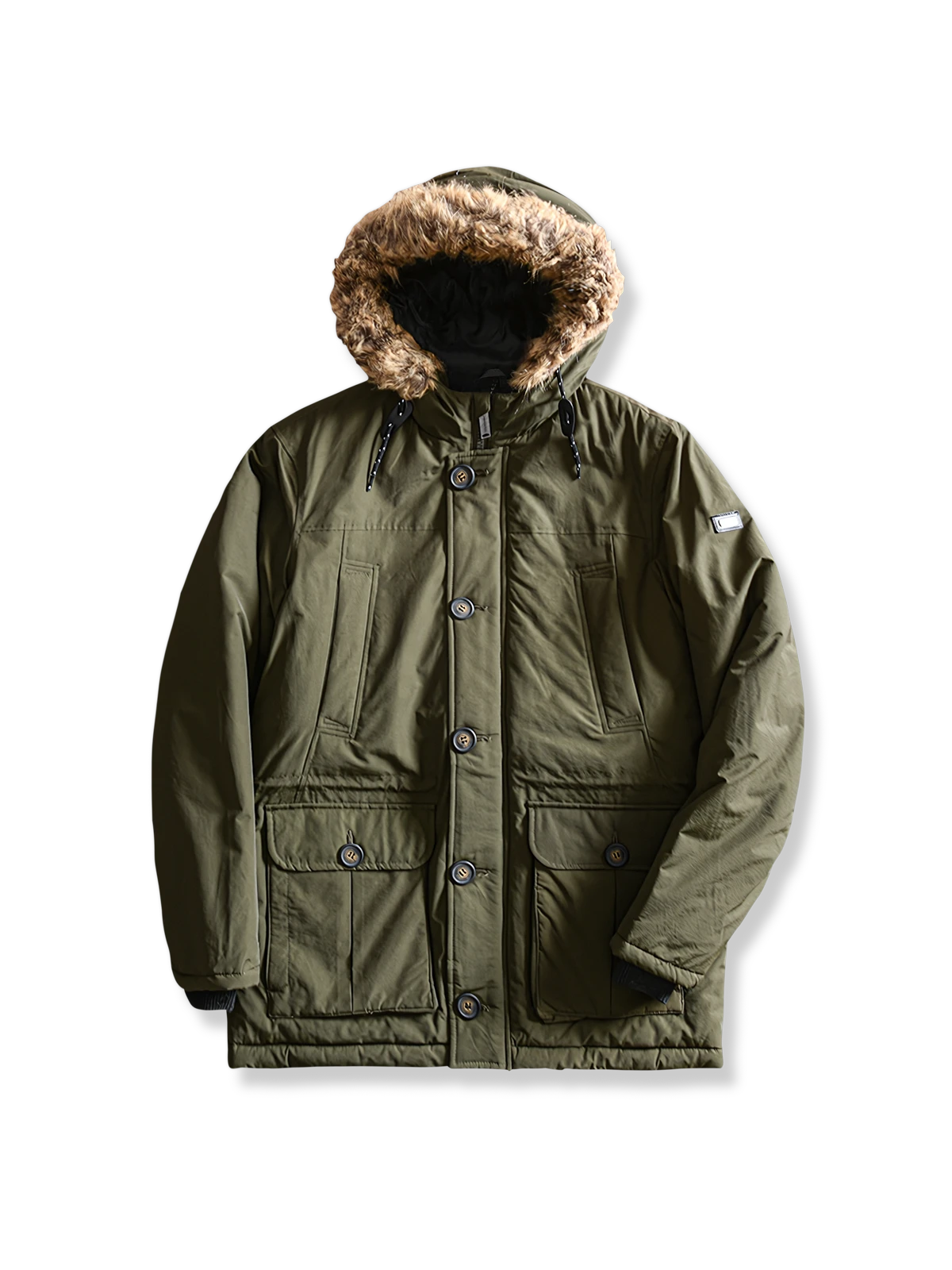 このパーカスタイルのコットンジャケットは、20世紀中期のアメリカ軍服に由来するデザインコンセプトを持っています。当初は、極寒の気候下で任務を遂行する米軍兵士のための防寒服として設計されました。クラシックなフード付きデザインは、保温と防風の両方の機能を融合しており、取り外し可能なファーカラーは北極探検服への敬意であり、極端な気候環境への適応性を追求しています。