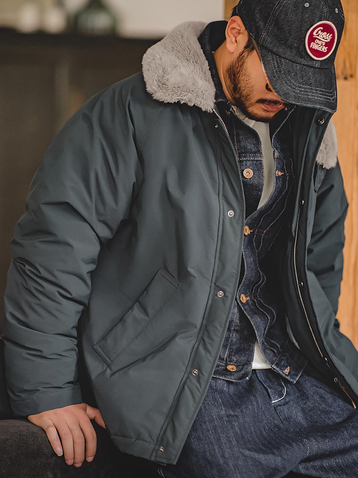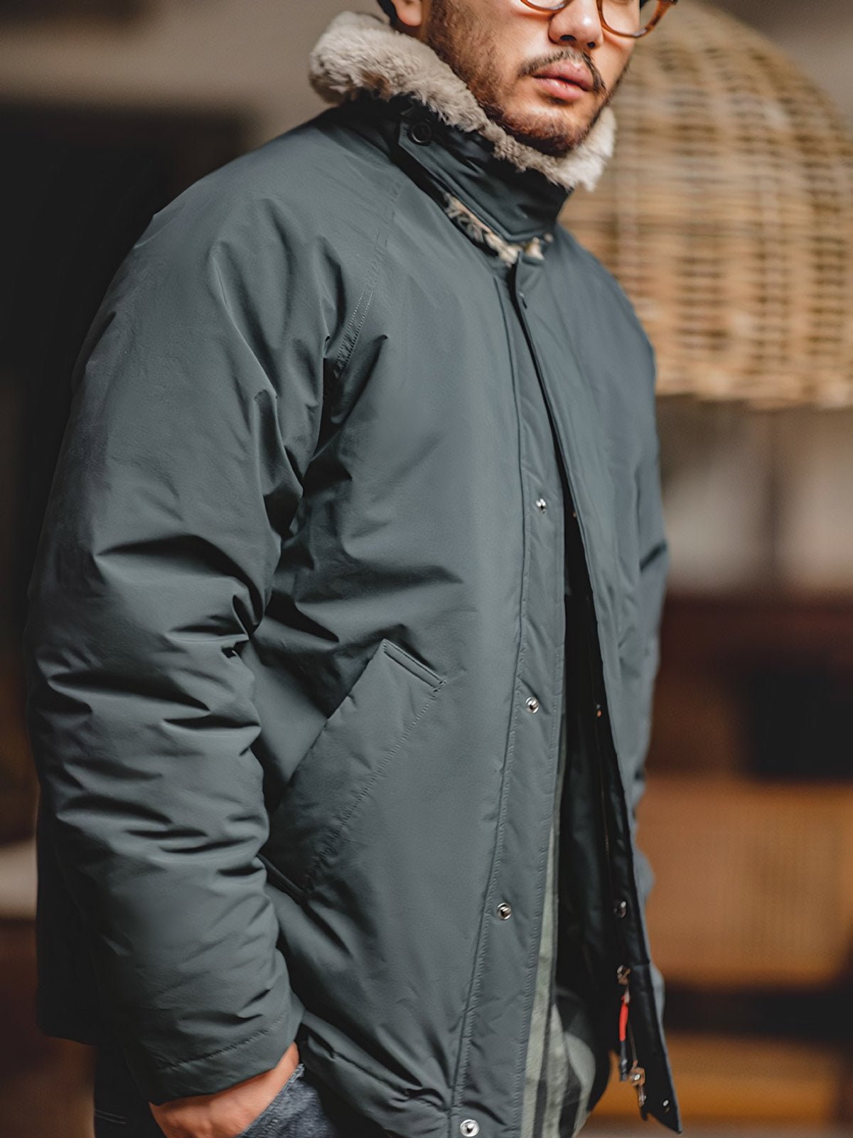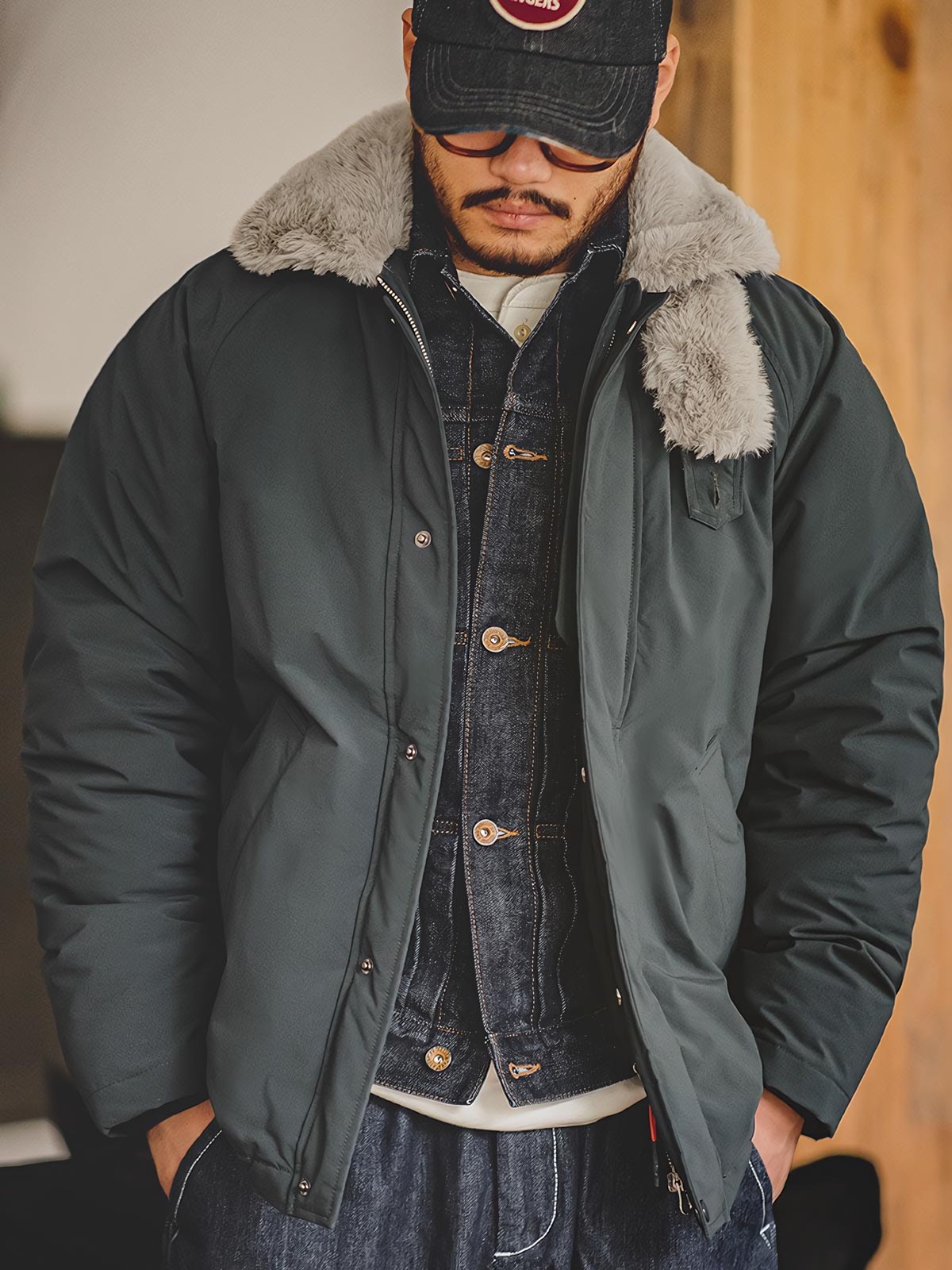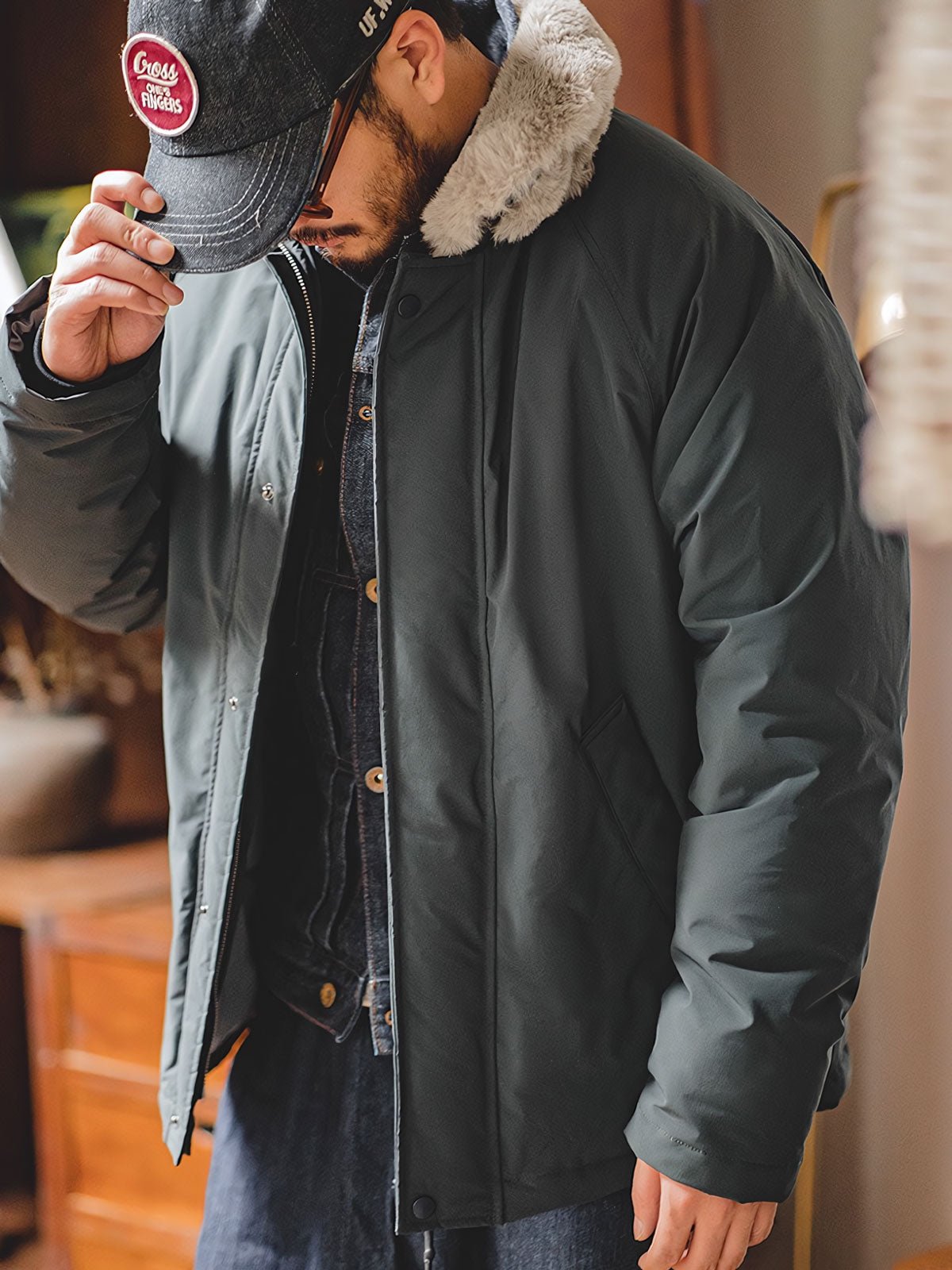 このコットンジャケットは、現代の都市スタイルとヴィンテージミリタリーエレメントの融合です。襟のデザインとファーのディテールは、20世紀中頃の軍用フライトジャケットのクラシックな要素へのオマージュとなっています。ファーカラーは暖かさを提供するだけでなく、歴史的なデザインへの敬意を表しており、伝統と現代スタイルを融合させたデザイナーの独創性が反映されています。