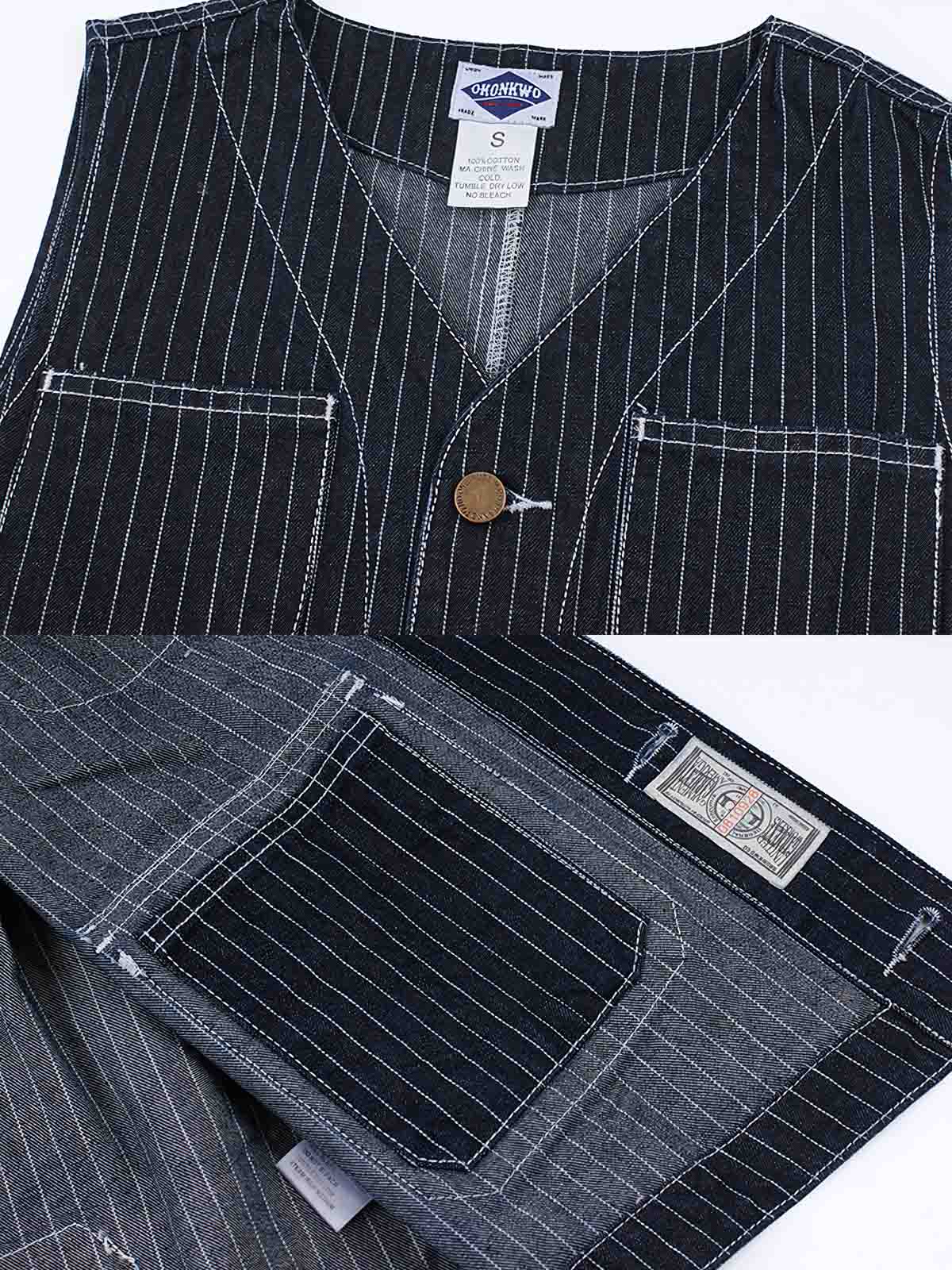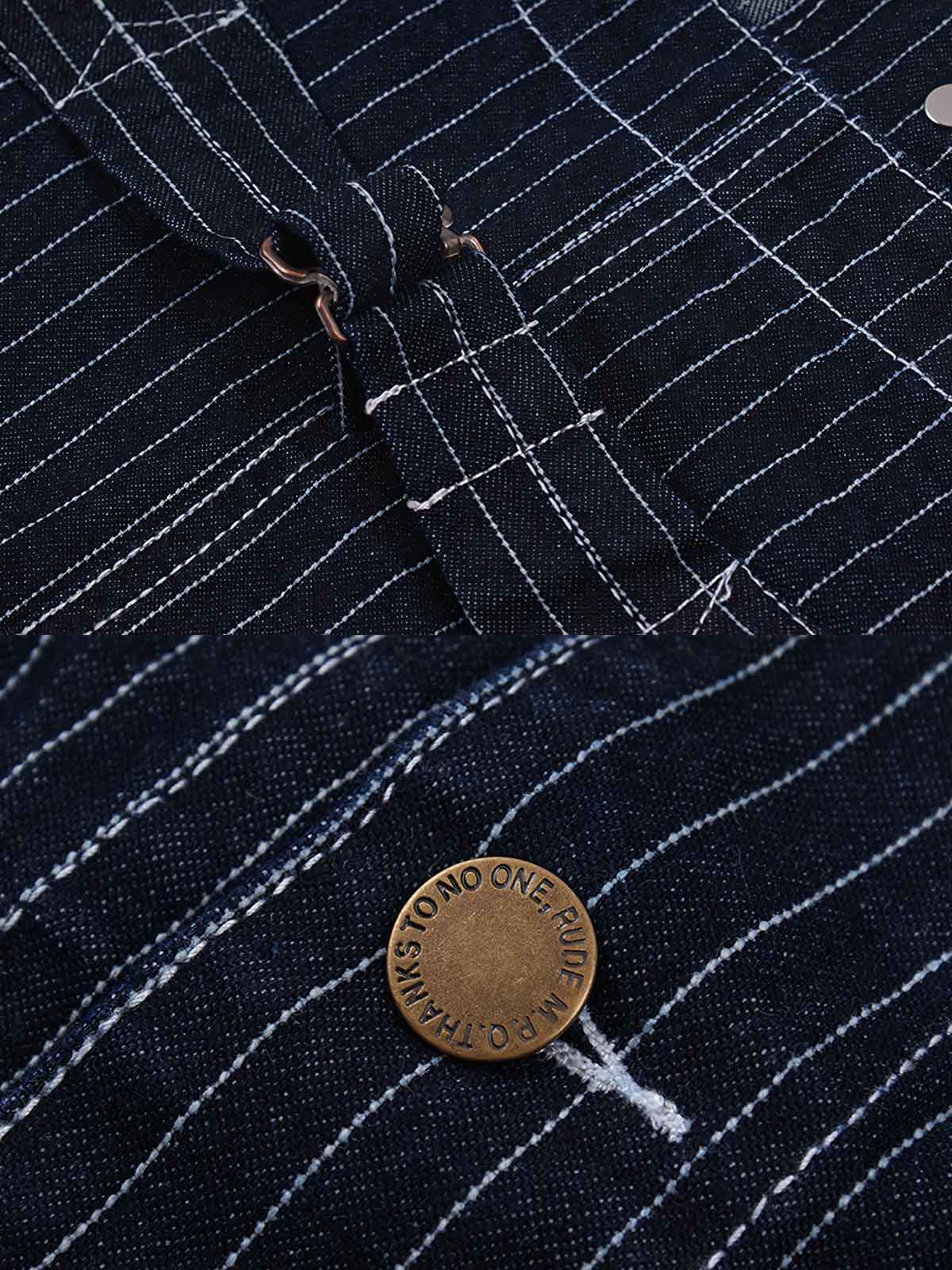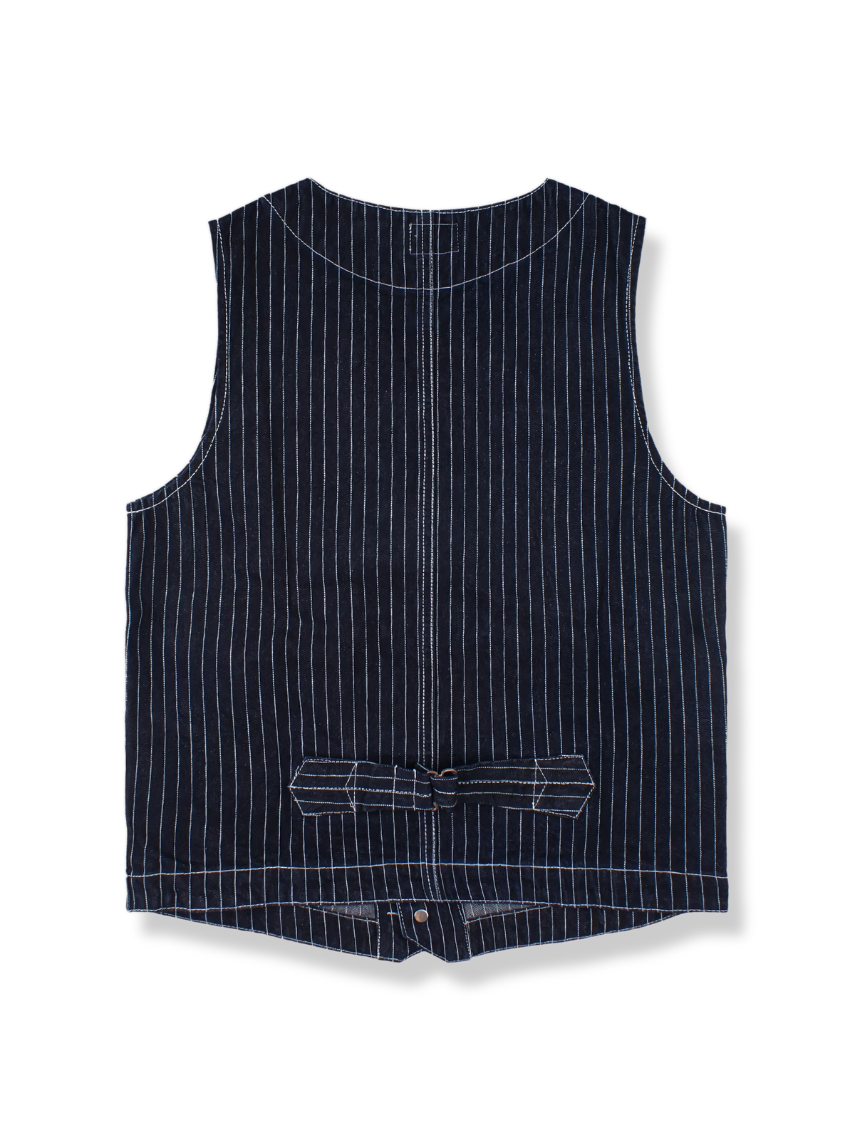 このストライプデニムベストは、伝統的なワークウェアからインスピレーションを受けており、初期の労働者の実用的な衣類に根ざしています。ストライプのディテールと濃いヴィンテージカラーは、アメリカのクラシックなワークスタイルを反映しています。