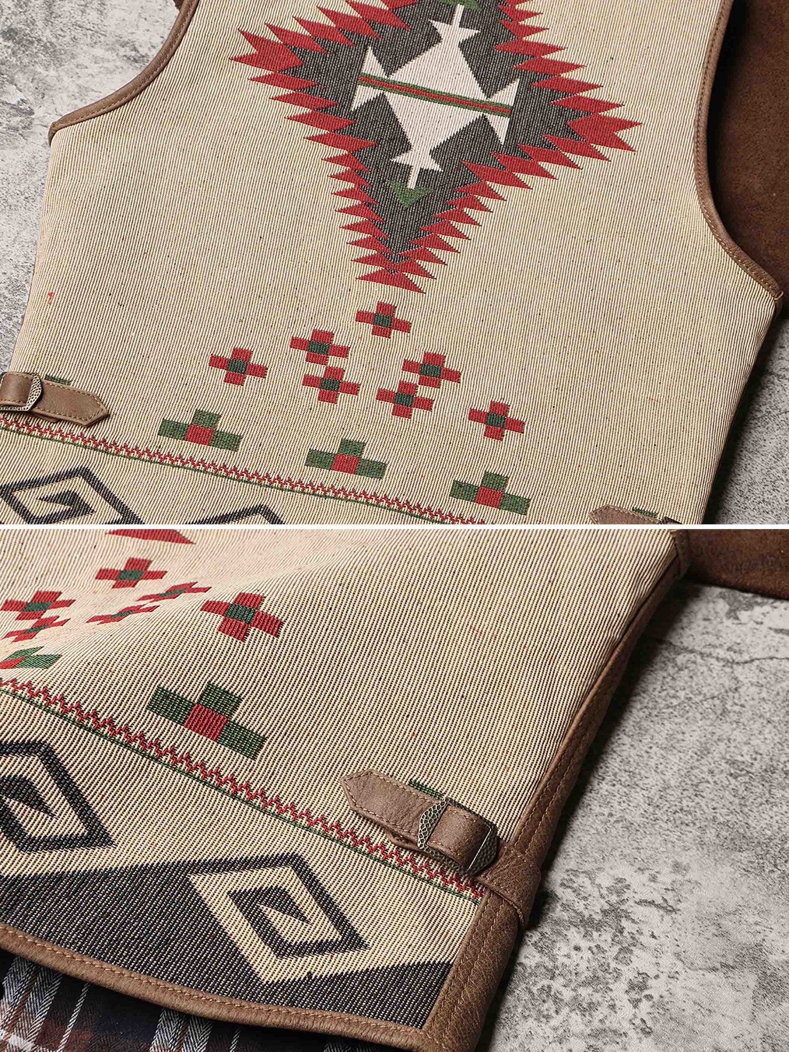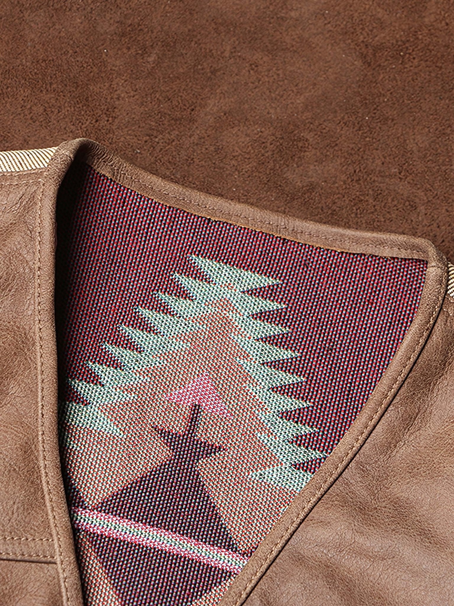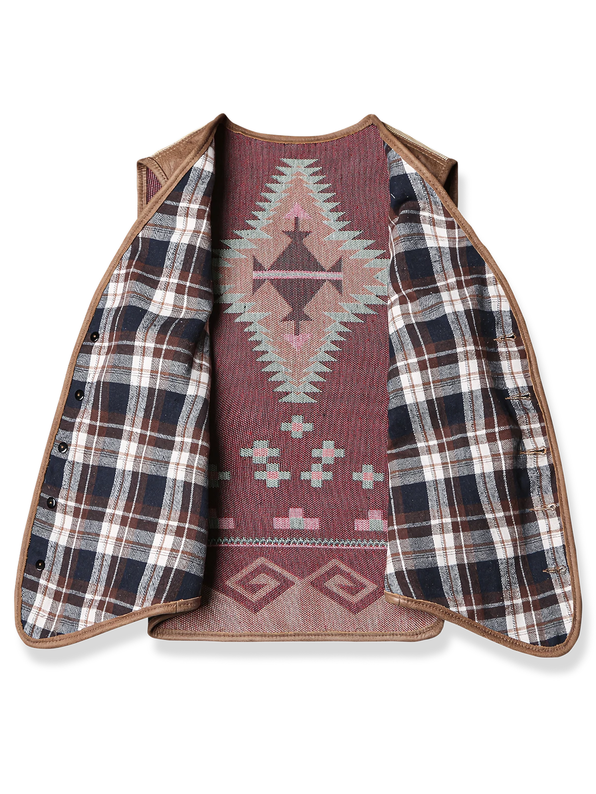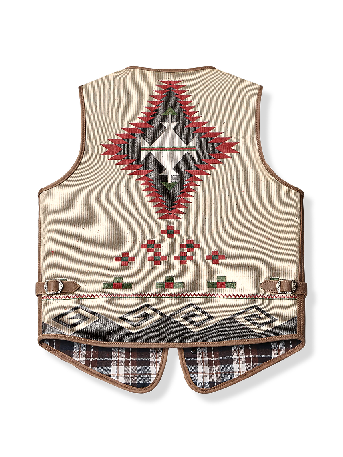 このアイテムは一見無地のレザーベストと思われがちですが、背面にはNAVAJOトーテムのテクスチャが美しく表現されており、特別なデザインです。色味は抑えめで派手すぎない印象を与えます。民族風の素敵なテキスチャが質感を引き立てています。
