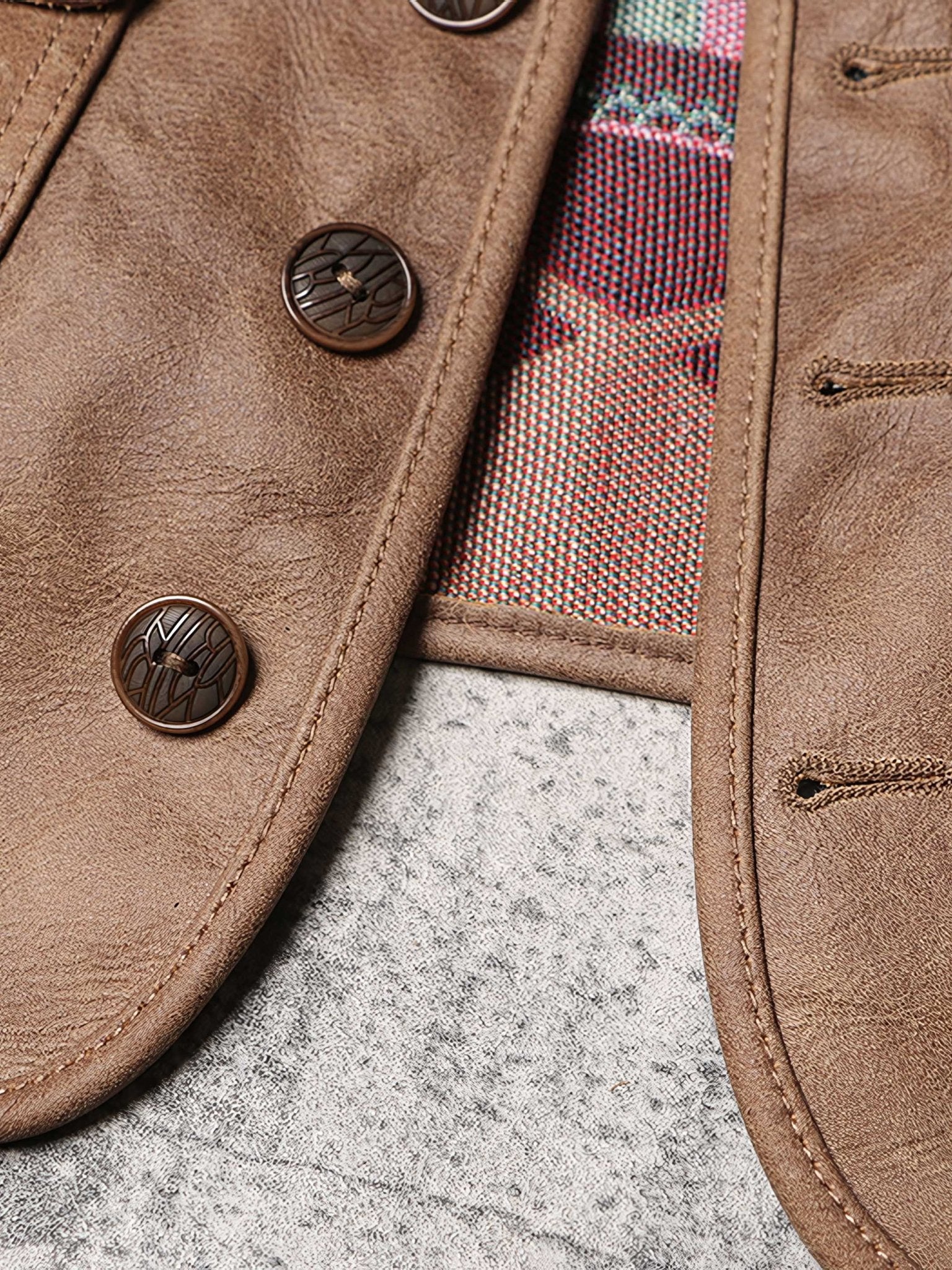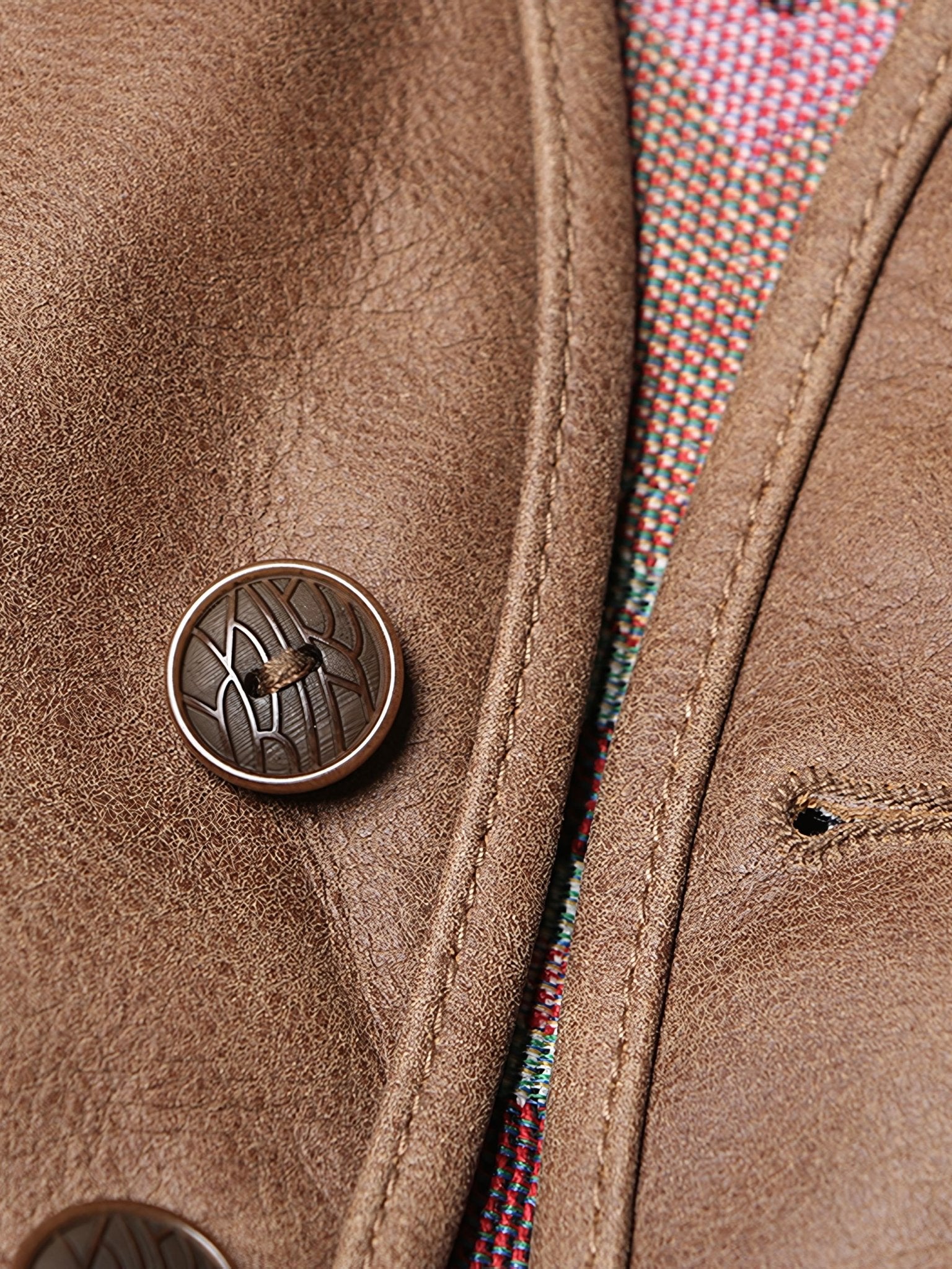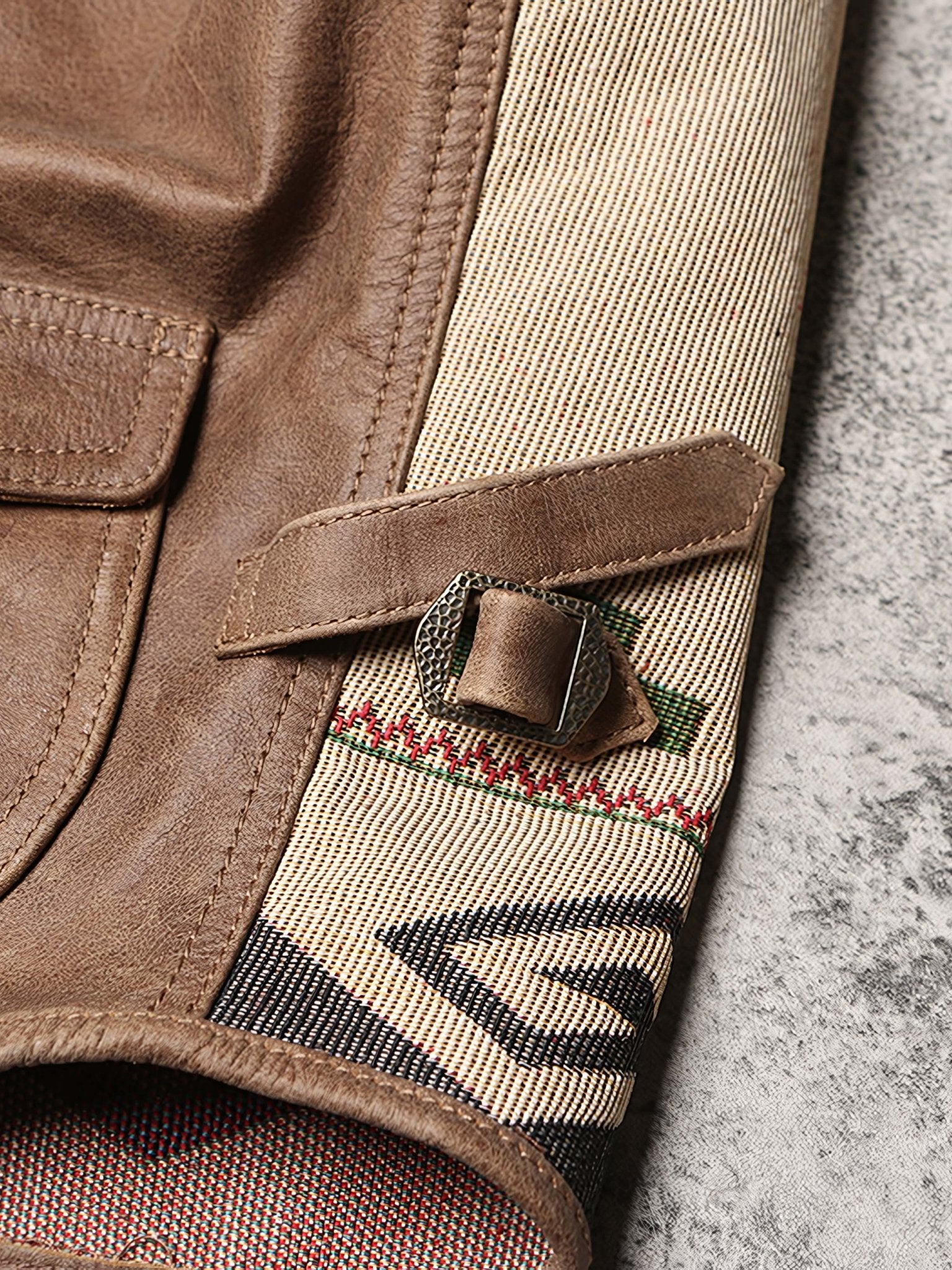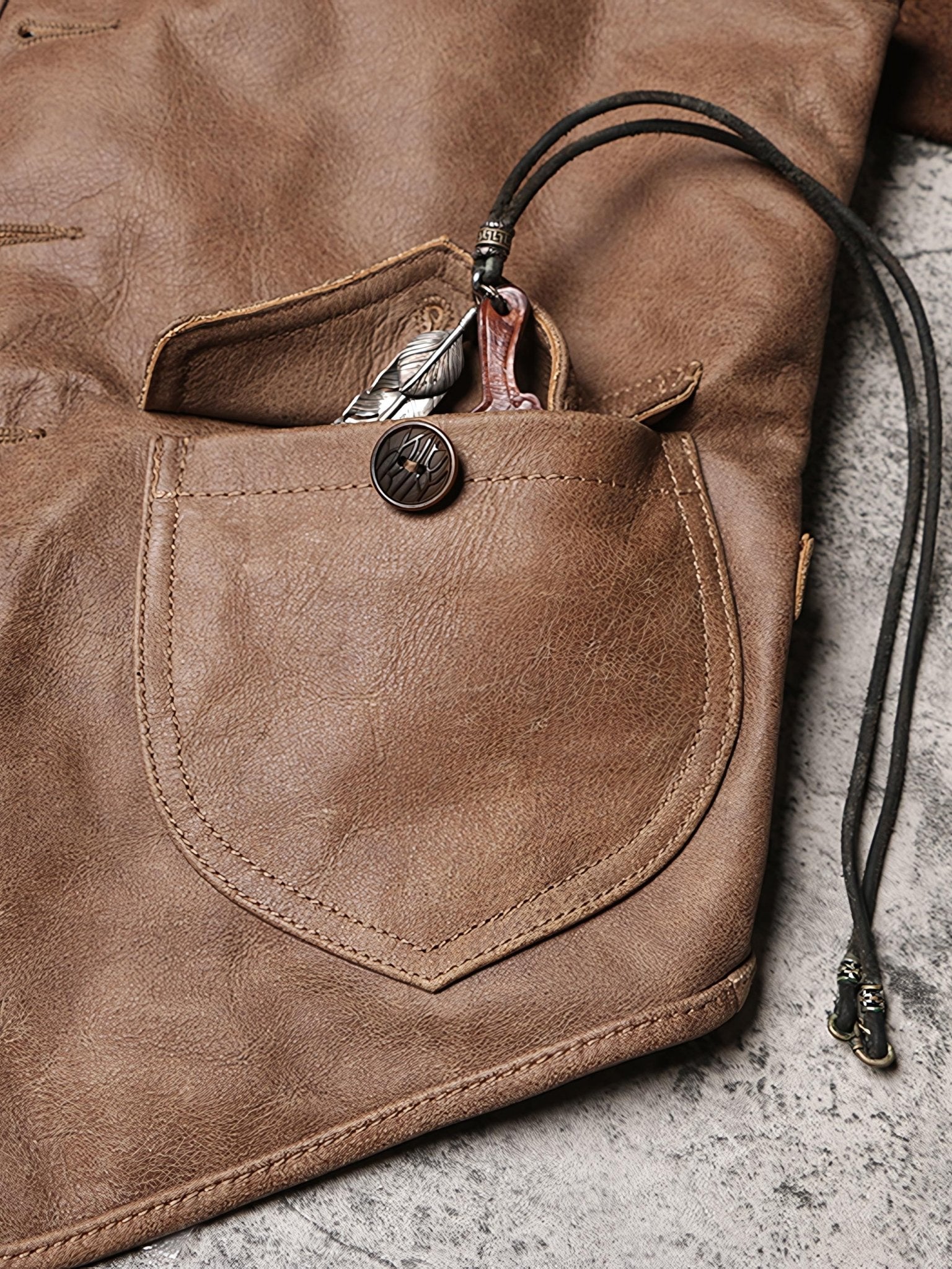 このアイテムは一見無地のレザーベストと思われがちですが、背面にはNAVAJOトーテムのテクスチャが美しく表現されており、特別なデザインです。色味は抑えめで派手すぎない印象を与えます。民族風の素敵なテキスチャが質感を引き立てています。
